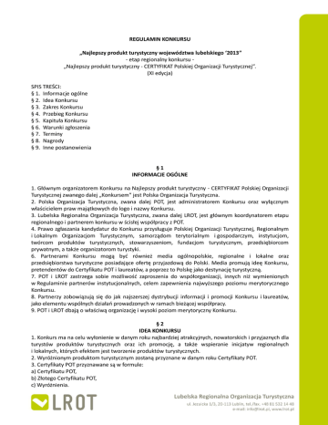 REGULAMIN KONKURSU „Najlepszy produkt turystyczny województwa lubelskiego ‘2013” - etap regionalny konkursu „Najlepszy produkt turystyczny - CERTYFIKAT Polskiej Organizacji Turystycznej”. (XI edycja) SPIS TREŚCI: § 1. Informacje ogólne § 2. Idea Konkursu § 3. Zakres Konkursu § 4. Przebieg Konkursu § 5. Kapituła Konkursu § 6. Warunki zgłoszenia § 7. Terminy § 8. Nagrody § 9. Inne postanowienia §1 INFORMACJE OGÓLNE 1. Głównym organizatorem Konkursu na Najlepszy produkt turystyczny - CERTYFIKAT Polskiej Organizacji Turystycznej zwanego dalej „Konkursem” jest Polska Organizacja Turystyczna. 2. Polska Organizacja Turystyczna, zwana dalej POT, jest administratorem Konkursu oraz wyłącznym właścicielem praw majątkowych do logo i nazwy Konkursu. 3. Lubelska Regionalna Organizacja Turystyczna, zwana dalej LROT, jest głównym koordynatorem etapu regionalnego i partnerem konkursu w ścisłej współpracy z POT. 4. Prawo zgłaszania kandydatur do Konkursu przysługuje Polskiej Organizacji Turystycznej, Regionalnym i Lokalnym Organizacjom Turystycznym, samorządom terytorialnym i gospodarczym, instytucjom, twórcom produktów turystycznych, stowarzyszeniom, fundacjom turystycznym, przedsiębiorcom prywatnym, a także organizatorom turystyki. 6. Partnerami Konkursu mogą być również media ogólnopolskie, regionalne i lokalne oraz przedsiębiorstwa turystyczne posiadające ofertę przyjazdową do Polski. Media promują ideę Konkursu, pretendentów do Certyfikatu POT i laureatów, a poprzez to Polskę jako destynację turystyczną. 7. POT i LROT zastrzega sobie możliwość zaproszenia do współorganizacji, innych niż wymienionych w Regulaminie partnerów instytucjonalnych, celem zapewnienia najwyższego poziomu merytorycznego Konkursu. 8. Partnerzy zobowiązują się do jak najszerszej dystrybucji informacji i promocji Konkursu i laureatów, jako elementu wspólnych działań prowadzonych w ramach bieżącej współpracy. 9. POT i LROT dbają o właściwą organizację i wysoki poziom merytoryczny Konkursu. §2 IDEA KONKURSU 1. Konkurs ma na celu wyłonienie w danym roku najbardziej atrakcyjnych, nowatorskich i przyjaznych dla turystów produktów turystycznych oraz ich promocję, a także wspieranie inicjatyw regionalnych i lokalnych, których efektem jest tworzenie produktów turystycznych. 2. Wyróżnionym produktom turystycznym zostaną przyznane w danym roku Certyfikaty POT. 3. Certyfikaty POT przyznawane są w formule: a) Certyfikatu POT, b) Złotego Certyfikatu POT, c) Wyróżnienia. 4. Certyfikat POT przyznawany jest przez Kapitułę za dany rok. * 5. Certyfikaty POT przyznawane są przez Kapitułę w maksymalnej liczbie 10. 6. Złoty Certyfikat POT, w liczbie 1, zostanie wybrany przez Kapitułę spośród wszystkich produktów turystycznych wyróżnionych dotychczas Certyfikatem POT, a zgłoszonych przez LROT w kategorii Złotego Certyfikatu POT. a) Złoty Certyfikat będzie mógł uzyskać tylko ten produkt turystyczny, który otrzymał w latach ubiegłych Certyfikat POT i twórczo rozwinął swoją działalność. Preferowane będą produkty priorytetowe określone na kolejne lata w „Marketingowej strategii Polski w sektorze turystyki na lata 2012-2020”. b) Złoty Certyfikat przyznawany jest za dany rok. Może być ponownie przyznany temu samemu produktowi nie wcześniej niż po upływie 5 lat, tylko w przypadku jeżeli znacząco rozszerzył swoją ofertę. c) Otrzymanie Złotego Certyfikatu POT łączy się z nagrodą główną, o której mowa w § 8. §3 ZAKRES KONKURSU 1. W ramach Konkursu przyjmowane są zgłoszenia zgodne z definicją produktu turystycznego: a) Produkt turystyczny – Wydarzenie cykliczne – charakteryzuje się dużą spójnością tematyczną, organizacyjną oraz konkretnym umiejscowieniem w czasie i przestrzeni. Jako przykłady można wymienić: Festiwal Przystanek Woodstock, Dymarki Świętokrzyskie, Jarmark Dominikański, festiwale filmowe, muzyczne (wydarzenie o dużej skali, dużej liczbie osób biorących w nim udział). b) Produkt turystyczny – Pakiet usług turystycznych - Impreza turystyczna – składa się z kilku usług lub usług i dóbr materialnych (rzeczy) oferowanych przez organizatorów turystyki. Jako przykłady można wymienić: Małopolska Wieś dla Dzieci, Podziemna eskapada czyli wycieczka z przygodami. c) Produkt turystyczny – Obiekt – charakteryzuje się występowaniem jednej głównej atrakcji (usługi) i dodatkowo kilku usług towarzyszących skupionych w jednym miejscu (obiekcie) mający z punktu widzenia kartograficznego charakter punktowy. Jako przykłady można wymienić: Centrum Słowian i Wikingów, Manufaktura w Łodzi. d) Produkt turystyczny – Szlak – składa się z wielu miejsc lub obiektów związanych z pewną nadrzędną ideą, połączonych ze sobą wytyczoną, zwykle oznakowaną trasą. Jako przykłady można wymienić: Szlak Orlich Gniazd, Szlak Piastowski, Szlak Architektury Drewnianej. e) Produkt turystyczny – Obszar – wewnętrznie złożony zbiór elementów wyróżnionych ze względu na swoją konkretną lokalizację w przestrzeni, charakteryzującą się walorami turystycznymi. Jako przykłady można wymienić: Beskidzka 5, Park Rowerowy Wierchomla. 2. Po sprawdzeniu zgodności zgłoszenia z definicją produktu turystycznego, Kapituła przeprowadza ocenę merytoryczną zgłoszeń, wyrażoną w punktacji, na podstawie poniższych kryteriów: KRYTERIA OCENY Opis produktu i plany działań OCENA 0-10 KRYTERIA SZCZEGÓŁOWE 1. Atrakcyjność produktu turystycznego z punktu widzenia turystów (występowanie pewnej cechy charakterystycznej przyciągającej turystów na pewne tereny i pewne obszary dzięki np.: walorom krajobrazu, występowaniem klimatu, pomników historii, obiektów zagospodarowania przestrzennego). 2. Dostępność dla turysty (wybór szczegółowych kryteriów w karcie zgłoszenia). 0-5 0-5 3. Podjęte działania na rzecz komercjalizacji produktu tu