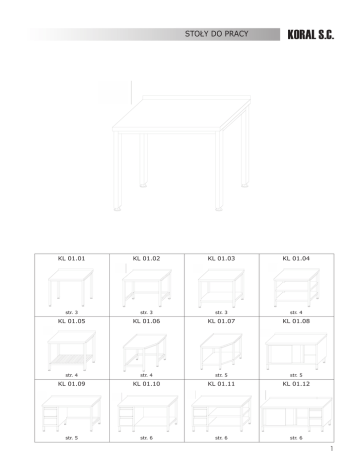 STOŁY DO PRACY KORAL S.C. KL 01.01 KL 01.02 KL 01.03 KL 01.04 str. 3 str. 3 str. 3 str. 4 KL 01.05 KL 01.06 KL 01.07 KL 01.08 str. 4 str. 4 str. 5 str. 5 KL 01.09 KL 01.10 KL 01.11 KL 01.12 str. 5 str. 6 str. 6 str. 6 1 STOŁY DO PRACY KORAL S.C. KL 01.13 KL 01.14 KL 01.15 KL 01.16 str. 7 str. 7 str. 7 str. 8 KL 01.17 KL 01.18 KL 01.19 KL 01.20 str. 8 str. 8 str. 9 str. 9 KL 01.21 KL 01.22 KL 01.23 KL 01.24 str. 9 str. 10 str. 10 str. 10 2 KORAL S.C. STOŁY DO PRACY Stół roboczy KL 01.01 Stół do pracy KL 01.02 Stół z półką KL 01.03 L B=600 B=700 600 614,00 640,00 700 640,00 665,00 800 659,00 702,00 900 691,00 720,00 1000 716,00 767,00 1100 743,00 796,00 1200 767,00 842,00 1300 792,00 877,00 1400 825,00 913,00 1500 861,00 968,00 1600 899,00 1002,00 1700 939,00 1040,00 1800 974,00 1069,00 1900 1018,00 1120,00 L B=600 B=700 600 688,00 726,00 700 726,00 767,00 800 750,00 786,00 900 773,00 830,00 1000 805,00 863,00 1100 836,00 902,00 1200 861,00 937,00 1300 893,00 969,00 1400 899,00 989,00 1500 950,00 1065,00 1600 994,00 1095,00 1700 1026,00 1140,00 1800 1077,00 1165,00 1900 1130,00 1222,00 2000 1321,00 1386,00 2200 1386,00 1462,00 2400 1485,00 1519,00 L B=600 B=700 600 697,00 760,00 700 737,00 805,00 800 786,00 868,00 900 829,00 918,00 1000 880,00 969,00 1100 912,00 1013,00 1200 950,00 1064,00 1300 975,00 1118,00 1400 1020,00 1174,00 1500 1083,00 1235,00 1600 1163,00 1298,00 1700 1223,00 1361,00 1800 1279,00 1418,00 1900 1386,00 1486,00 2000 1513,00 1658,00 2200 1639,00 1762,00 2400 1756,00 1867,00 3 KORAL S.C. STOŁY DO PRACY Stół z 2 półkami KL 01.04 L B=600 B=700 600 824,00 898,00 700 853,00 951,00 800 892,00 1044,00 900 917,00 1088,00 1000 993,00 1151,00 1100 1025,00 1221,00 1200 1126,00 1280,00 1300 1176,00 1360,00 1400 1214,00 1423,00 1500 1290,00 1480,00 1600 1417,00 1543,00 1700 1499,00 1614,00 1800 1556,00 1671,00 1900 1657,00 1739,00 2000 1834,00 1935,00 2200 1973,00 2015,00 2400 2125,00 2176,00 Stół z gretingiem KL 01.05 Stół narożny KL 01.06 L B=600 B=700 600 751,00 830,00 700 789,00 877,00 800 877,00 925,00 900 887,00 982,00 1000 944,00 1026,00 1100 980,00 1078,00 1200 1013,00 1133,00 1300 1052,00 1178,00 1400 1107,00 1237,00 1500 1140,00 1298,00 1600 1207,00 1355,00 1700 1273,00 1421,00 1800 1330,00 1489,00 1900 1456,00 1570,00 2000 1689,00 1815,00 2200 1785,00 1915,00 2400 1891,00 2018,00 A1 A2 B1 B2 900 900 600 600 1070,00 cena 900 1000 600 700 1125,00 1000 1000 700 700 1177,00 1000 900 700 600 1125,00 4 KORAL S.C. STOŁY DO PRACY Stół narożny z półką KL 01.07 Stół z szafką KL 01.08 Stół z blokiem szuflad KL 01.09 A1 A2 B1 B2 900 900 600 600 1191,00 cena 900 1000 600 700 1250,00 1000 1000 700 700 1308,00 1000 900 700 600 1250,00 B=600 B=700 1000 L 1954,00 2056,00 1100 2059,00 2148,00 1200 2144,00 2205,00 1300 2207,00 2272,00 1400 2272,00 2397,00 1500 2334,00 2527,00 1600 2398,00 2650,00 1700 2526,00 2779,00 1800 2649,00 2907,00 1900 2777,00 3017,00 B=600 B=700 1000 L 1385,00 1575,00 1100 1448,00 1642,00 1200 1513,00 1699,00 1300 1572,00 1766,00 1400 1638,00 1828,00 1500 1701,00 1895,00 1600 1768,00 1954,00 1700 1830,00 2008,00 1800 1892,00 2047,00 1900 1957,00 2106,00 5 KORAL S.C. STOŁY DO PRACY Stół z szufladami i półką KL 01.10 Stół z szufladami i 2 półkami KL 01.11 Stół z szufladami i szafką KL 01.12 B=600 B=700 1000 L 1486,00 1701,00 1100 1561,00 1794,00 1200 1639,00 1867,00 1300 1732,00 1953,00 1400 1803,00 2029,00 1500 1880,00 2076,00 1600 1970,00 2154,00 1700 2047,00 2204,00 1800 2099,00 2262,00 1900 2152,00 2329,00 B=600 B=700 1000 L 1954,00 2081,00 1100 2021,00 2145,00 1200 2081,00 2205,00 1300 2148,00 2272,00 1400 2202,00 2334,00 1500 2271,00 2464,00 1600 2335,00 2587,00 1700 2463,00 2716,00 1800 2586,00 2844,00 1900 2713,00 2961,00 B=600 B=700 1400 L 2835,00 2944,00 1500 2888,00 3046,00 1600 2997,00 3132,00 1700 3082,00 3235,00 1800 3159,00 3319,00 1900 3243,00 3407,00 6 KORAL S.C. STOŁY DO PRACY Stół z 2 szafkami KL 01.13 Stół z szufladami i szafką KL 01.14 Stół z szufladami i 2 półkami KL 01.15 B=600 B=700 1400 L 2668,00 2687,00 1500 2692,00 2817,00 1600 2793,00 2904,00 1700 2865,00 3020,00 1800 2944,00 3095,00 1900 3031,00 3171,00 B=600 B=700 1800 L 3383,00 3509,00 1900 3553,00 3663,00 2000 3701,00 3841,00 2100 3880,00 4070,00 2200 4056,00 4296,00 2300 4233,00 4526,00 2400 4411,00 4754,00 B=600 B=700 1000 L 2145,00 2286,00 1100 2221,00 2359,00 1200 2291,00 2429,00 1300 2362,00 2501,00 1400 2428,00 2565,00 1500 2501,00 2710,00 1600 2569,00 2848,00 1700 2707,00 2980,00 1800 2840,00 3125,00 1900 2979,00 3259,00 7 KORAL S.C. STOŁY DO PRACY Stół z szufladami KL 01.16 L 1200 Stół z szufladami KL 01.17 L 950 Stół z szufladami KL 01.18 L 800 B=600 B=700 2958,00 3209,00 B=600 B=700 2529,00 2744,00 B=600 B=700 2191,00 2323,00 8 KORAL S.C. STOŁY DO PRACY Stół z szufladami KL 01.19 L 1000 Stół - blok szuflad KL 01.20 L 500 Stół - blok szuflad KL 01.21 L 500 B=600 B=700 2702,00 2831,00 B=600 B=700 1338,00 1502,00 B=600 B=700 1628,00 1791,00 9 KORAL S.C. STOŁY DO PRACY Stół z szufladą KL 01.22 Stół z szufladami KL 01.23 Podstawa pod piec KL 01.24 L B=600 B=700 500 1338,00 1389,00 950 1895,00 1957,00 1400 2438,00 2639,00 L B=600 B=700 500 1351,00 1402,00 950 1908,00 1970,00 1400 2450,00 2651,00 L 850 B=650 1389,00 10
