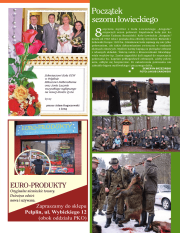 Początek sezonu łowieckiego 8 stycznia myśliwi z Koła Łowieckiego „Krogulec” rozpoczęli sezon polowań. Kapelanem koła jest ks. prałat Tadeusz Brzeziński. Koło Łowieckie „Krogulec” działa od 1963 roku i posiada dwa obwody łowieckie: Bielawki i Sobowidz liczące 1200 ha. Członkowie koła zajmują się nie tylko polowaniem, ale także dokarmianiem zwierzyny w trudnych okresach zimowych. Myśliwi karmę kupują za pieniądze zebrane z własnych składek. Walczą także z kłusownikami likwidując wiele wnyków itp. Zanim sygnaliści dali sygnał do rozpoczęcia polowania ks. kapelan pobłogosławił zebranych, ażeby polowanie, odbyło się bezpiecznie. Po zakończeniu polowania nie zabrakło bigosu myśliwskiego i pieczonego dzika. Seweryn BrzezińSki   FOTO: JAkUB SAkOwSki Sekretarzowi Ko³a PZW w Pelplinie Mi³oszowi Nalborskiemu oraz ¿onie Lucynie wszystkiego najlepszego na nowej drodze ¿ycia życzy prezes Adam Rogaczewski z żoną eUro-ProdUktY Oryginalne niemieckie towary. Dziecięca odzież nowa i używana. Zapraszamy do sklepu Pelplin, ul. Wybickiego 12 (obok oddziału PKO) INFORMATOR PELPLIŃSKI 27