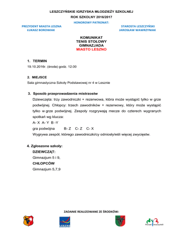 LESZCZYŃSKIE IGRZYSKA MŁODZIEŻY SZKOLNEJ ROK SZKOLNY 2016/2017 HONOROWY PATRONAT: PREZYDENT MIASTA LESZNA ŁUKASZ BOROWIAK STAROSTA LESZCZYŃSKI JAROSŁAW WAWRZYNIAK KOMUNIKAT TENIS STOŁOWY GIMNAZJADA MIASTO LESZNO 1. TERMIN 19.10.2016r. (środa) godz. 12.00 2. MIEJSCE Sala gimnastyczna Szkoły Podstawowej nr 4 w Lesznie 3. Sposób przeprowadzenia mistrzostw Dziewczęta: trzy zawodniczki + rezerwowa, która może wystąpić tylko w grze podwójnej. Chłopcy: trzech zawodników + rezerwowy, który może wystąpić tylko w grze podwójnej. Zespoły rozgrywają mecze do czterech wygranych spotkań wg klucza: A- X A- Y B -Y gra podwójna B- Z C- Z C- X Wygrywa zespół, którego zawodniczki/cy odniosły/eśli więcej zwycięstw. 4. Zgłoszone szkoły: DZIEWCZĄT: Gimnazjum 5 i 9, CHŁOPCÓW Gimnazjum 5,7,9 ZADANIE REALIZOWANE ZE ŚRODKÓW:
