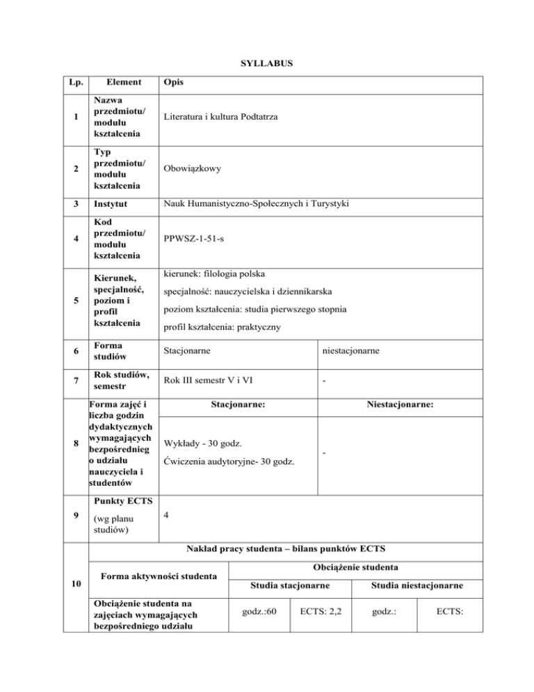SYLLABUS Lp. Element Opis 1 Nazwa przedmiotu/ modułu kształcenia Literatura i kultura Podtatrza 2 Typ przedmiotu/ modułu kształcenia Obowiązkowy 3 Instytut Nauk Humanistyczno-Społecznych i Turystyki 4 Kod przedmiotu/ modułu kształcenia PPWSZ-1-51-s 5 Kierunek, specjalność, poziom i profil kształcenia kierunek: filologia polska specjalność: nauczycielska i dziennikarska poziom kształcenia: studia pierwszego stopnia profil kształcenia: praktyczny 6 Forma studiów Stacjonarne niestacjonarne 7 Rok studiów, semestr Rok III semestr V i VI - 8 Forma zajęć i liczba godzin dydaktycznych wymagających bezpośrednieg o udziału nauczyciela i studentów Stacjonarne: Niestacjonarne: Wykłady - 30 godz. Ćwiczenia audytoryjne- 30 godz. - Punkty ECTS 9 (wg planu studiów) 4 Nakład pracy studenta – bilans punktów ECTS 10 Obciążenie studenta Forma aktywności studenta Studia stacjonarne Obciążenie studenta na zajęciach wymagających bezpośredniego udziału godz.:60 ECTS: 2,2 Studia niestacjonarne godz.: ECTS: nauczycieli akademickich, w tym: Udział w wykładach (godz.) 30 - Udział w ćwiczeniach/ seminariach/ zajęciach praktycznych/ praktykach zawodowych (godz.) 30 - Dodatkowe godziny kontaktowe z nauczycielem (godz.) - - Udział w egzaminie (godz.) - - Obciążenie studenta związane z nauką samodzielną, w tym: godz.:50 ECTS:1,8 godz.: ECTS: Samodzielne studiowanie tematyki zajęć/ przygotowanie się do ćwiczeń (godz.) 25 - Przygotowanie do zaliczenia/ egzaminu (godz.) - - Wykonanie prac zaliczeniowych (referat, projekt, prezentacja itd.) (godz.) 25 - Obciążenie studenta w ramach zajęć związanych z praktycznym przygotowaniem zawodowym godz.: - ECTS: - godz.: ECTS: 110 4 - - Suma (obciążenie studenta na zajęciach wymagających bezpośredniego udziału nauczycieli akademickich oraz związane z nauką samodzielną) 11 Nauczyciel akademicki odpowiedzial ny za Dr hab. Anna Mlekodaj przedmiot/ moduł (egzaminując y) 12 Nauczyciele akademiccy prowadzący przedmiot/ Dr hab. Anna Mlekodaj moduł 13 14 Wymagania (kompetencje) wstępne Założenia i cele przedmiotu Wiedza z zakresu gwar Podtatrza , podstawowa znajomość historii regionu i jego geografii Usystematyzowanie wiedzy studenta na temat folkloru górali i jego literackich kontynuacji oraz takich aspekty kultury regionu jak: pasterstwo, strój, muzyka, taniec, kuchnia, obrzędowość z uwzględnieniem tradycyjnego modelu życia ludności Podtatrza w aspekcie przemian motywowanych współczesnością. Opis efektów kształcenia w zakresie: Odniesienie do kierunkowych efektów kształcenia Odniesienie do efektów kształcenia dla obszaru WIEDZY 15 Efekty kształcenia W1 Student zna i rozumie pojęcie „folklor” oraz rozróżnia teksty twórców regionalnych, kontynuujące utrwalone w folklorze sposoby widzenia i rozumienia świata od tekstów nawiązujących do innych źródeł inspiracji. W2 Zna zarys historii literatury regionalnej i potrafi omówić utrwalony w niej etos górala oraz obraz kultury regionu K_W04 K_W04 H1P_W05, H1P_W07, H1P_W08, H1P_W09 H1P_W01, H1P_W02, H1P_W04 K_W08 H1P_W05, H1P_W06, H1P_W07, H1P_W08, H1P_W09 U1 Potrafi scharakteryzować poszczególne podtatrzańskie etnosy, zaznaczające swą kulturową odrębność; potrafi wskazać cechy wspólne i różnicujące. K_U04 H1P_U03, H1P_U09, H1P_U12 U2 Rozumie podstawowe prawa regulujące funkcjonowanie kultury regionalnej K_U10 H1P_U06 W3 Zna zależności między typem gospodarki regionu oraz jego historii a kulturą UMIEJĘTNOŚCI KOMPETENCJI SPOŁECZNYCH 16 Treści K1 Rozumie potrzebę wiedzy z zakresu kultury regionu jako istotnej dla polonisty i potrafi korzystać z bogactwa i różnorodności życia kulturalnego w regionie K_K06 H1P_K05 K2 Ma świadomość odpowiedzialności za regionalne dziedzictwo kulturowe Podtatrza K_K05 H1P_K05 Wykład: wprowadzenie studenta w zagadnienia folklorystyki, obejmujące rozumienie kształcenia takich terminów jak: folklor, folkloryzm, naturalna sytuacja folklorystyczna, tekst folkloru oraz ludowy styl artystyczny. Studenci poznają źródła literatury regionu, działalność ruchu regionalnego, sylwetki ważniejszych twórców, istotne wydarzenia oraz teksty znaczące dla kultury regionu. Ćwiczenia: .Studenci poznają kulturę regionu Podtatrza w aspekcie tradycji i współczesności pasterstwa, muzyki, tańca i śpiewu, kuchni oraz życia codziennego. Poznają również obraz lokalnej kultury kreowany w mediach. 17 Stosowane metody dydaktyczne Metody weryfikacji efektów kształcenia 18 19 Sposób weryfikacji efektów kształcenia np. egzamin ustny, Efekt egzamin pisemny, zaliczenie ustne, kolokwium, projekt, referat, kształceni prezentacja, sprawozdanie, dyskusje, obserwacja w czasie zajęć a itd. W1 Praca z tekstem, projekt W2 Dyskusja, praca z tekstem, projekt (w odniesieniu W3 do U1 poszczególnych efektów) U2 Dyskusja, projekt, praca z tekstem Kryteria oceny osiągniętych efektów kształcenia Forma i warunki zaliczenia przedmiotu/ modułu, w tym 20 zasady dopuszczenia do egzaminu / zaliczenia z oceną 21 Np. wykład informacyjny, ćwiczenia, dyskusja, metoda projektu, pokaz, prezentacja, referat, praca w grupach, praca z tekstem. Wykaz literatury podstawowej Projekt, pokaz, prezentacja Projekt, dyskusja K1 Projekt, dyskusja, prezentacja K2 Projekt, prezentacja, dyskusja Studenci w grupach opracowują metodą projektu wybrane zagadnienie dotyczące jednego aspektu kultury wspólnego dla całego Podtatrz(pasterstwo, muzyka, śpiew, kuchnia regionalna, obrzędowość rodzinna, doroczna itp.). Kryteria oceny w skali 1-5: poprawność merytoryczna, stopień wyczerpania tematu, wszechstronność ujęcia, wykorzystanie źródeł, poziom zaangażowania w projekt (21-25 - bdb, 15-20 – db, 10 15 – dst, 0-9 ndst). Zaliczenie z oceną na podstawie obecności i przygotowanej metodą projektu prezentacji. Jerzy Bartmiński, Folkor-język-poetyka, Wrocław-Warszawa-Kraków 1990Anna Mlekodaj,Kwietno