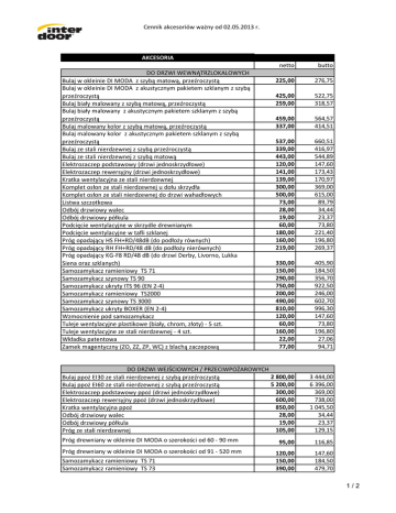 Cennik akcesoriów ważny od 02.05.2013 r. AKCESORIA netto butto 225,00 276,75 425,00 259,00 522,75 318,57 459,00 337,00 564,57 414,51 537,00 339,00 443,00 120,00 141,00 139,00 300,00 500,00 73,00 28,00 19,00 60,00 180,00 160,00 219,00 660,51 416,97 544,89 147,60 173,43 170,97 369,00 615,00 89,79 34,44 23,37 73,80 221,40 196,80 269,37 330,00 150,00 290,00 750,00 200,00 490,00 810,00 120,00 60,00 160,00 22,00 77,00 405,90 184,50 356,70 922,50 246,00 602,70 996,30 147,60 73,80 196,80 27,06 94,71 DO DRZWI WEJŚCIOWYCH / PRZECIWPOŻAROWYCH 2 800,00 Bulaj ppoż EI30 ze stali nierdzewnej z szybą przeźroczystą 5 200,00 Bulaj ppoż EI60 ze stali nierdzewnej z szybą przeźroczystą 300,00 Elektrozaczep podstawowy ppoż (drzwi jednoskrzydłowe) 600,00 Elektrozaczep rewersyjny ppoż (drzwi jednoskrzydłowe) 850,00 Kratka wentylacyjna ppoż 28,00 Odbój drzwiowy walec 19,00 Odbój drzwiowy półkula 105,00 Próg ze stali nierdzewnej 3 444,00 6 396,00 369,00 738,00 1 045,50 34,44 23,37 129,15 DO DRZWI WEWNĄTRZLOKALOWYCH Bulaj w okleinie DI MODA z szybą matową, przeźroczystą Bulaj w okleinie DI MODA z akustycznym pakietem szklanym z szybą przeźroczystą Bulaj biały malowany z szybą matową, przeźroczystą Bulaj biały malowany z akustycznym pakietem szklanym z szybą przeźroczystą Bulaj malowany kolor z szybą matową, przeźroczystą Bulaj malowany kolor z akustycznym pakietem szklanym z szybą przeźroczystą Bulaj ze stali nierdzewnej z szybą przeźroczystą Bulaj ze stali nierdzewnej z szybą matową Elektrozaczep podstawowy (drzwi jednoskrzydłowe) Elektrozaczep rewersyjny (drzwi jednoskrzydłowe) Kratka wentylacyjna ze stali nierdzewnej Komplet osłon ze stali nierdzewnej u dołu skrzydła Komplet osłon ze stali nierdzewnej do drzwi wahadłowych Listwa szczotkowa Odbój drzwiowy walec Odbój drzwiowy półkula Podcięcie wentylacyjne w skrzydle drewnianym Podcięcie wentylacyjne w tafli szklanej Próg opadający HS FH+RD/48dB (do podłoży równych) Próg opadający RH FH+RD/48 dB (do podłoży nierównych) Próg opadający KG-F8 RD/48 dB (do drzwi Derby, Livorno, Lukka Siena oraz szklanych) Samozamykacz ramieniowy TS 71 Samozamykacz szynowy TS 90 Samozamykacz ukryty ITS 96 (EN 2-4) Samozamykacz ramieniowy TS2000 Samozamykacz szynowy TS 3000 Samozamykacz ukryty BOXER (EN 2-4) Wzmocnienie pod samozamykacz Tuleje wentylacyjne plastikowe (biały, chrom, złoty) - 5 szt. Tuleje wentylacyjne ze stali nierdzewnej - 4 szt. Wkładka patentowa Zamek magentyczny (ZO, ZZ, ZP, WC) z blachą zaczepową Próg drewniany w okleinie DI MODA o szerokości od 60 - 90 mm 95,00 116,85 Próg drewniany w okleinie DI MODA o szerokości od 91 - 520 mm 120,00 150,00 390,00 147,60 184,50 479,70 Samozamykacz ramieniowy TS 71 Samozamykacz ramieniowy TS 73 1/2 Cennik akcesoriów ważny od 02.05.2013 r. Samozamykacz ramieniowy TS 83 Samozamykacz szynowy TS 91 Samozamykacz szynowy TS 92 Samozamykacz szynowy TS 93 Samozamykacz ukryty ITS 96 (EN 2-4) Samozamykacz ramieniowy TS2000 Samozamykacz szynowy TS 3000 Samozamykacz ukryty BOXER (EN 2-4) Wzmocnienie pod samozamykacz (dot. drzwi wejściowych) 440,00 460,00 590,00 940,00 750,00 200,00 490,00 810,00 120,00 541,20 565,80 725,70 1 156,20 922,50 246,00 602,70 996,30 147,60 Sztywny łańcuch (do drzwi przylgowych i bezprzylgowych) Wizjer panoramiczny ppoż Wkładkli antywłamaniowe klasy B Wkładkli antywłamaniowe klasy C Wkładka patentowa 180,00 59,00 120,00 150,00 22,00 221,40 72,57 147,60 184,50 27,06 2/2