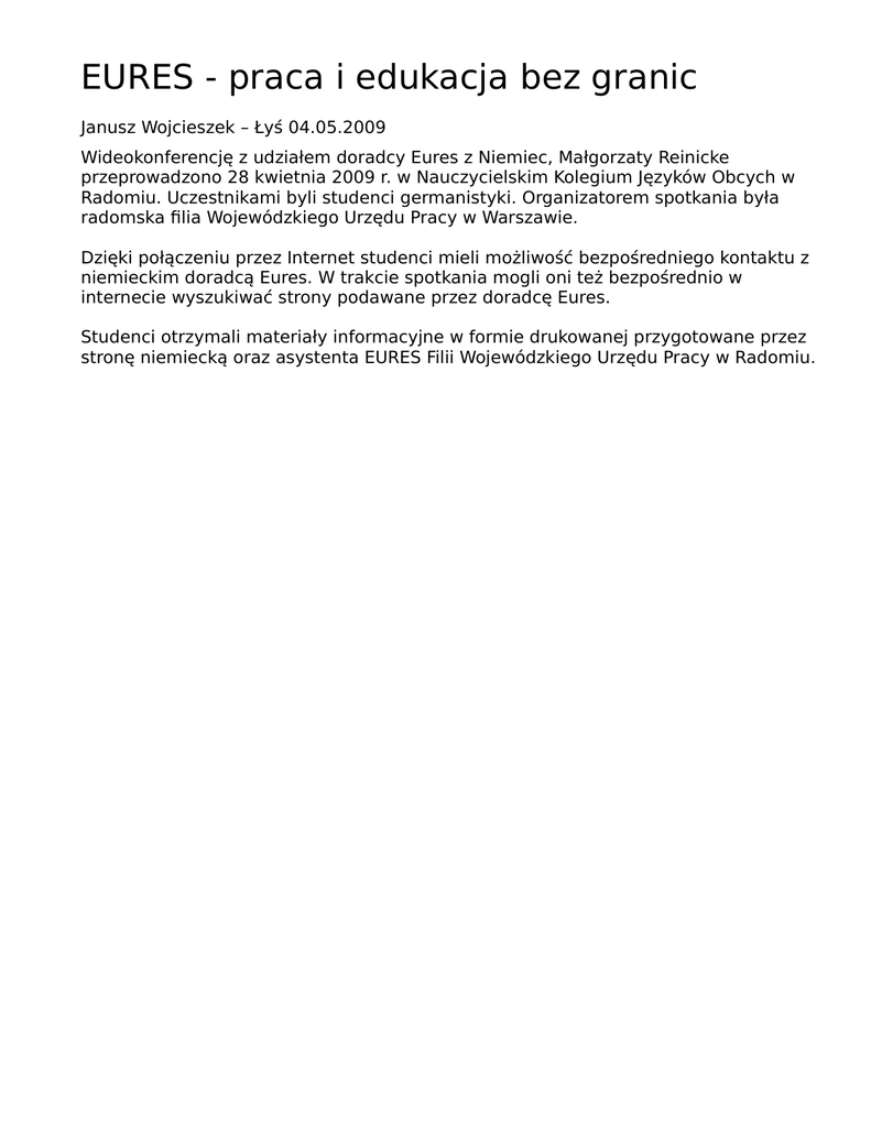 EURES - praca i edukacja bez granic Janusz Wojcieszek – Łyś 04.05.2009 Wideokonferencję z udziałem doradcy Eures z Niemiec, Małgorzaty Reinicke przeprowadzono 28 kwietnia 2009 r. w Nauczycielskim Kolegium Języków Obcych w Radomiu. Uczestnikami byli studenci germanistyki. Organizatorem spotkania była radomska filia Wojewódzkiego Urzędu Pracy w Warszawie. Dzięki połączeniu przez Internet studenci mieli możliwość bezpośredniego kontaktu z niemieckim doradcą Eures. W trakcie spotkania mogli oni też bezpośrednio w internecie wyszukiwać strony podawane przez doradcę Eures. Studenci otrzymali materiały informacyjne w formie drukowanej przygotowane przez stronę niemiecką oraz asystenta EURES Filii Wojewódzkiego Urzędu Pracy w Radomiu.