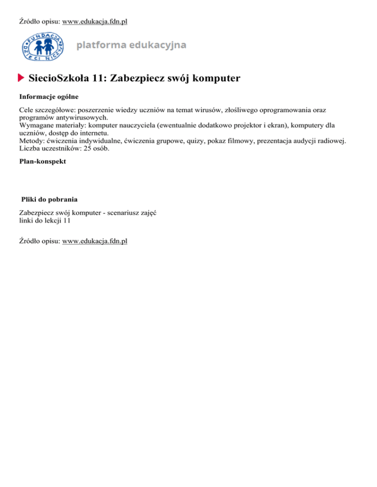 ħUyGáRRSLVXwww.edukacja.fdn.pl 6LHFLR6]NRáD=DEH]SLHF]VZyMNRPSXWHU Informacje ogólne &HOHV]F]HJyáRZHSRV]HU]HQLHZLHG]\XF]QLyZQDWHPDWZLUXVyZ]áRĞOLZHJRRSURJUDPRZDQLDRUD] programów antywirusowych. :\PDJDQHPDWHULDá\NRPSXWHUQDXF]\FLHODHZHQWXDOQLHGRGDWNRZRSURMHNWRULHNUDQNRPSXWHU\GOD XF]QLyZGRVWĊSGRLQWHUQHWX 0HWRG\üZLF]HQLDLQG\ZLGXDOQHüZLF]HQLDJUXSRZHTXL]\SRND]ILOPRZ\SUH]HQWDFMDDXG\FMLUDGLRZHM Liczba uczestników: 25 osób. Plan-konspekt Pliki do pobrania =DEH]SLHF]VZyMNRPSXWHUVFHQDULXV]]DMĊü linki do lekcji 11 ħUyGáRRSLVXwww.edukacja.fdn.pl