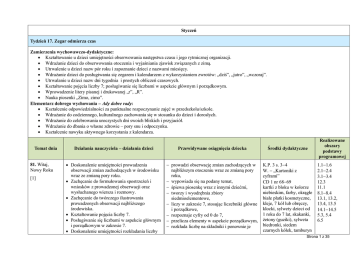 Styczeń Tydzień 17. Zegar odmierza czas Zamierzenia wychowawczo-dydaktyczne: Kształtowanie u dzieci umiejętności obserwowania następstwa czasu i jego rytmicznej organizacji. Wdrażanie dzieci do obserwowania otoczenia i wyjaśniania zjawisk związanych z zimą. Utrwalenie u dzieci nazw pór roku i zapoznanie dzieci z nazwami miesięcy. Wdrażanie dzieci do posługiwania się zegarem i kalendarzem z wykorzystaniem zwrotów: „dziś”, „jutro”, „wczoraj”. Utrwalanie u dzieci nazw dni tygodnia i prostych obliczeń czasowych. Kształtowanie pojęcia liczby 7; posługiwanie się liczbami w aspekcie głównym i porządkowym. Wprowadzenie litery pisanej i drukowanej „r”, „R”. Nauka piosenki „Zimo, zimo”. Elementarz dobrego wychowania Ady dobre rady: Kształcenie odpowiedzialności za punktualne rozpoczynanie zajęć w przedszkolu/szkole. Wdrażanie do codziennego, kulturalnego zachowania się w stosunku do dzieci i dorosłych. Wdrażanie do celebrowania uroczystych dni swoich bliskich i przyjaciół. Wdrażanie do dbania o własne zdrowie – pory snu i odpoczynku. Kształcenie nawyku aktywnego korzystania z kalendarza. Temat dnia 81. Witaj, Nowy Roku [1] Działania nauczyciela – działania dzieci Przewidywane osiągnięcia dziecka Środki dydaktyczne Doskonalenie umiejętności prowadzenia obserwacji zmian zachodzących w środowisku wraz ze zmianą pory roku. Zachęcanie do formułowania spostrzeżeń i wniosków z prowadzonej obserwacji oraz wysłuchanego wiersza i rozmowy. Zachęcanie do twórczego ilustrowania prowadzonych obserwacji najbliższego środowiska. Kształtowanie pojęcia liczby 7. Posługiwanie się liczbami w aspekcie głównym i porządkowym w zakresie 7. Doskonalenie umiejętności rozkładania liczby prowadzi obserwację zmian zachodzących w najbliższym otoczeniu wraz ze zmianą pory roku, wypowiada się na podany temat, śpiewa piosenkę wraz z innymi dziećmi, tworzy i wyodrębnia zbiory siedmioelementowe, liczy w zakresie 7, stosując liczebniki główne i porządkowe, rozpoznaje cyfry od 0 do 7, przelicza elementy w aspekcie porządkowym, rozkłada liczbę na składniki i ponownie je K.P. 3 s. 34 W. „Kartoniki z cyframi” CD 1 nr 6869 kartki z bloku w kolorze niebieskim, farby, okrągłe białe płatki kosmetyczne, kleje, 7 kół lub obręczy, klocki, sylwety dzieci od 1 roku do 7 lat, skakanki, żetony (guziki), sylweta biedronki, siedem czarnych kółek, tamburyn Realizowane obszary podstawy programowej 1.11.6 2.12.4 3.13.4 12.3 11.1 8.18.4 13.1, 13.2, 13.4, 13.5 14.114.5 5.3, 5.4 6.5 Strona 1 z 35 82. Cztery pory roku i dwanaście miesięcy [2] 83. Co roku jesteśmy starsi [3] na składniki i ponownego ich łączenia przy zastosowaniu słowa „dodać”. Przekładanie rytmu z jednej reprezentacji na drugą. łączy, stosując pojęcie „dodać”, wyklaskuje usłyszany rytm. Poznawanie utworów literackich związanych z tematem zajęć. Kształcenie umiejętności uważnego słuchania tekstów literackich. Poznawanie nazw pór roku i związanych z nimi charakterystycznych zmian zachodzących w przyrodzie. Przybliżenie nazw poszczególnych miesięcy również w zakresie graficznego zapisu nazw. Doskonalenie umiejętności swobodnego wypowiadania się na podstawie wysłuchanego tekstu. Rozwijanie rozumowania przyczynowo-skutkowego na podstawie ustalania kolejności zdarzeń i morału wysłuchanej baśni. Dostrzeganie regularności rytmu pór roku na podstawie układanego rytmu. Doskonalenie umiejętności rozwiązywania zagadek słownych. Doskonalenie umiejętności wykonywania prac konstrukcyjnych i plastycznych do końca i estetycznie. słucha w skupieniu tekstów literackich i rozumie ich sens wypowiada się na ich temat, wymienia nazwy pór roku i miesięcy (wylicza je bez konieczności zachowania właściwej kolejności), wypowiada się na temat zmian zachodzących w przyrodzie w każdej porze roku, ustala kolejność zdarzeń i morał wysłuchanej baśni, układa rytmy według dostrzeżonej regularności, rozwiązuje zagadki słowne, estetycznie i do końca wykonuje prace konstrukcyjne i plastyczne. K. s. 7273 K.P. 3 s. 5 W. „Cztery pory roku” (nr 12) 4 kontury parasoli / 4 duże parasole, czerwona, żółta, biała i zielona krepina, etykiety z nazwami pór roku, szarfy dla każdego dziecka (tyle samo niebieskich, zielonych, żółtych i czerwonych), instrumenty perkusyjne (trójkąt, bębenek, marakasy, kastaniety), duży kalendarz ścienny, plastikowe nakrętki od butelek po napojach w czterech kolorach (biały, żółty, czerwony, zielony), krążki gimnastyczne, kolorowe czasopisma, cztery zdjęcia postaci / głów kobiet, 4 duże arkusze brystolu 1.11.6 2.12.4 3.13.4 14.114.4 12.112.3 13.1, 13.2, 13.4, 13.5 9.1 10.1 5.35.4 6.5 Kształtowanie świadomości dostrzegania upływu czasu. Prezentacja pisanej litery „r”, „R”. Określanie cech spółgłoski „r”. Doskonalenie umiejętności opowiadania na podstawie ułożonej historyjki obrazkowej. Ćwiczenie umiejętności czytania w zakresie wypowiada się na dany temat, koncentruje uwagę na czytanym opowiadaniu, układa ilustracje/historyjkę obrazkową zgodnie z czytanym tekstem, rozpoznaje i nazywa literę „r”, „R”, rozpoznaje głoskę „r” jako spółgłoskę, K. s. 7475 K.P. 3 s. 6 W. makieta i sylwety do opowiadania „Urodziny Ady” (nr 40), „Kartoniki z literami”, „Kartoniki do układania modeli 1.11.6 2.12.4 3.13.4 14.114.7 13.1, 13.2, 13.4, 13.5 15.1 Strona 2 z 35 84. Dni i noce [4] poznanych liter. Ćwiczenie analizy i syntezy wzrokowo-słuchowej wyrazów. Przygotowanie do kształcenia umiejętności dodawania na konkretach z wykorzystaniem symboli „0” i „+”. Rozwijanie sprawności grafomotorycznej. stara się prawidłowo artykułować głoskę „r”, podejmuje próby dodawania na konkretach w zakresie poznanych liczb. wyrazów” fotografie dzieci od okresu wczesnego dzieciństwa do chwili obecnej, fotografie nauczyciel