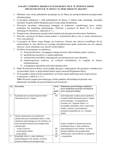 ZASADY I TERMINY REKRUTACJI DO BURSY NR II W ZESPOLE SZKÓŁ MECHANICZNYCH W OPOLU NA ROK SZKOLNY 2016/2017 1. Młodzież oraz osoby pełnoletnie przyjmuje się do Bursy po przeprowadzeniu postępowania rekrutacyjnego. 2. O przyjęciu młodzieży i osób pełnoletnich do Bursy w trakcie roku szkolnego, decyduje Dyrektor Zespołu Szkół Mechanicznych zwany dalej Dyrektorem. 3. Wszczęcie procedury rekrutacyjnej następuje na podstawie wypełnionego przez rodzica kandydata lub kandydata pełnoletniego „Wniosku o przyjęcie do Bursy Nr II w Opolu” złożonego do Dyrektora ( załącznik nr 1 ). 4. Postępowanie rekrutacyjne przeprowadza komisja rekrutacyjna powołana przez Dyrektora. 5. Wniosek o przyjęcie do Bursy można pobrać w sekretariacie Bursy oraz ze strony internetowej: www.zsm.opole.pl. 6. O przyjęcie do Bursy mogą ubiegać się uczniowie, których stan zdrowia kwalifikuje ich do zamieszkania, tj. stan zdrowia nie wymaga specjalistycznej opieki medycznej oraz nie zagraża zdrowiu i życiu własnemu oraz innych wychowanków. 7. Do Bursy nie przyjmuje się młodzieży: 1) chorej psychicznie, wymagającej stałego leczenia, indywidualnej opieki i pomocy, 2) upośledzonej umysłowo w stopniu głębokim, 3) uzależnionej od środków odurzających, psychotropowych oraz alkoholu, 4) niepełnosprawnej ruchowo, na wózkach inwalidzkich, ze względu na bariery architektoniczne. 5) wymagającej specjalistycznej indywidualnej diety. 8. Rada Wychowawcza Bursy może podjąć decyzję o nieprzyjęciu lub przyjęciu warunkowym wychowanka, który w poprzednich latach rażąco naruszał Regulamin Bursy. 9. W przypadku większej liczby kandydatów niż liczba miejsc będą brane pod uwagę kryteria wymienione w tabeli nr 1,2 i 3: Tab.1 Kryteria organu prowadzącego, liczba punktów dla każdego kryterium oraz dokumenty niezbędne do potwierdzenia tych kryteriów: Lp. Kryterium 1. Kandydat jest uczniem Zespołu Szkół Mechanicznych w Opolu. 2. Ocena zachowania na świadectwie ukończenia przez kandydata klasy w roku szkolnym poprzedzającym rok szkolny, na który przeprowadzane jest postępowanie rekrutacyjne: · ocena wzorowa · ocena bardzo dobra · ocena dobra Kandydat, który w roku szkolnym poprzedzającym rok szkolny, na który przeprowadzane jest postępowanie 3. Liczb a punkt ów 60 60 50 40 60 Dokumenty potwierdzające spełnianie przez kandydata kryteriów określonych przez organ prowadzący Zaświadczenie wydane przez dyrektora Zespołu Szkół Mechanicznych w Opolu potwierdzające, że kandydat jest uczniem ww. Zespołu Szkół, a w przypadku kandydata, który rozpocznie naukę w klasie I, potwierdzenie przyjęcia kandydata do ww. Zespołu Szkół. Kopia świadectwa ukończenia przez kandydata klasy w roku szkolnym poprzedzającym rok szkolny, na który przeprowadzane jest postępowanie rekrutacyjne, potwierdzone za zgodność z oryginałem. 4. rekrutacyjne, otrzymał świadectwo szkolne z wyróżnieniem Kandydat w roku szkolnym poprzedzającym rok szkolny, na który przeprowadzane jest postępowanie rekrutacyjne, był mieszkańcem Bursy Nr II. 60 5. Kandydat jest wychowankiem placówki opiekuńczo-wychowawczej. 60 6. Wolontariat na rzecz środowiska lokalnego. 50 Zaświadczenie wydane przez Dyrektora Zespołu Szkół Mechanicznych w Opolu potwierdzające, że kandydat w roku szkolnym poprzedzającym rok szkolny, na który przeprowadzane jest postępowanie rekrutacyjne, był mieszkańcem Bursy Nr II. Zaświadczenie wydane przez dyrektora placówki opiekuńczo-wychowawczej potwierdzające, że kandydat jest wychowankiem takiej placówki. Zaświadczenie wydane przez odpowiednią instytucję potwierdzające, że kandydat pełnił wolontariat na rzecz środowiska lokalnego. Tab.2 Wartość punktowa kryteriów ustawowych dla kandydata niepełnoletniego: Lp. Kryterium 1. 2. 3. 4. 5. 6. 7. Wielodzietność rodziny kandydata. Niepełnosprawność kandydata. Niepełnosprawność jednego z rodziców kandydata. Niepełnosprawność obojga rodziców kandydata. Niepełnosprawność rodzeństwa kandydata. Samotne wychowywanie kandydata w rodzinie. Objęcie kandydata pieczą zastępczą. Liczba punktów 70 70 70 70 70 70 70 Tab.3 Wartość punktowa kryteriów ustawowych dla kandydata pełnoletniego: Lp. Kryterium 1. 2. 3. 4. 5. Wielodzietność rodziny kandydata. Niepełnosprawność kandydata. Niepełnosprawność dziecka kandydata. Niepełnosprawność innej osoby bliskiej, nad którą kandydat sprawuje opiekę. Samotne wychowywanie dziecka przez kandydata. Liczba punktów 70 70 70 70 70 10. W przypadku równorzędnych wyników uzyskanych przez kandydatów na pierwszym etapie postępowania rekrutacyjnego lub jeżeli po zakończeniu tego etapu Bursa nadal dysponuje wolnymi miejscami, na drugim etapie postępowania rekrutacyjnego jest brana pod uwagę kolejność zgłoszeń. 11. Do wniosku o przyjęcie do Bursy należy dołączyć: 1) dwie podpisane fotografie, 2) zaświadczenie o przyjęciu do szkoły lub kontynuowaniu nauki, 3) podpisane oświadczenia, 4) zaznaczone kryteria rekrutacji oraz dokumenty potwierdzające spełnianie kryteriów danego kandydata, 12. Rodzice dzieci lub osoby pełnoletnie przyjęte do Bursy w ubiegłym roku szkolnym, składają odpowiednio deklarację o kontynuowaniu pobytu Bursie w terminie 7 dni poprzedzających termin rozpoczęcia postępowania rekrutacyjnego ( załącznik nr 2 i 3 ). 13. Do deklaracji o kontynuowaniu pobytu w Bursie należy dołączyć: 1) zaświadczenie o kontynuowaniu nauki, 2) podpisane oświadczenia. 14. Terminarz rekrutacji: składanie deklaracji o kontynuowaniu zamieszkania przez wychowanków Bursy w danym roku szkolnym: od 17 czerwca 2016 r. do 24 czerwca 2016 r. składanie wniosków o przyjęcie do Bursy: od 01.07.2016r.do 15 lipca 2016 r. do godz.13.00 ogłoszenie list kandydatów zakwalifikowanych i niezakwalifikowanych: 15 lipca 2016r. o godz. 14.00 ogłoszenie list kandydatów przyjętych i nieprzyjętych 01 sierpnia 2016 r. godz. 1