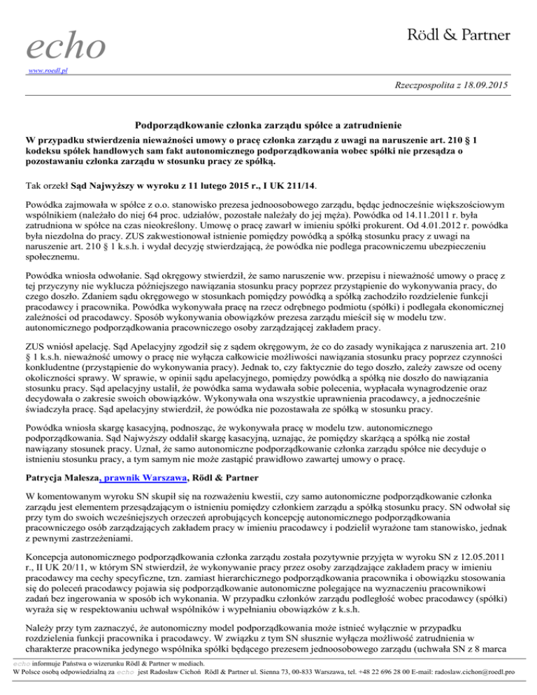 echo www.roedl.pl Rzeczpospolita z 18.09.2015 Podporządkowanie członka zarządu spółce a zatrudnienie W przypadku stwierdzenia nieważności umowy o pracę członka zarządu z uwagi na naruszenie art. 210 § 1 kodeksu spółek handlowych sam fakt autonomicznego podporządkowania wobec spółki nie przesądza o pozostawaniu członka zarządu w stosunku pracy ze spółką. Tak orzekł Sąd Najwyższy w wyroku z 11 lutego 2015 r., I UK 211/14. Powódka zajmowała w spółce z o.o. stanowisko prezesa jednoosobowego zarządu, będąc jednocześnie większościowym wspólnikiem (należało do niej 64 proc. udziałów, pozostałe należały do jej męża). Powódka od 14.11.2011 r. była zatrudniona w spółce na czas nieokreślony. Umowę o pracę zawarł w imieniu spółki prokurent. Od 4.01.2012 r. powódka była niezdolna do pracy. ZUS zakwestionował istnienie pomiędzy powódką a spółką stosunku pracy z uwagi na naruszenie art. 210 § 1 k.s.h. i wydał decyzję stwierdzającą, że powódka nie podlega pracowniczemu ubezpieczeniu społecznemu. Powódka wniosła odwołanie. Sąd okręgowy stwierdził, że samo naruszenie ww. przepisu i nieważność umowy o pracę z tej przyczyny nie wyklucza późniejszego nawiązania stosunku pracy poprzez przystąpienie do wykonywania pracy, do czego doszło. Zdaniem sądu okręgowego w stosunkach pomiędzy powódką a spółką zachodziło rozdzielenie funkcji pracodawcy i pracownika. Powódka wykonywała pracę na rzecz odrębnego podmiotu (spółki) i podlegała ekonomicznej zależności od pracodawcy. Sposób wykonywania obowiązków prezesa zarządu mieścił się w modelu tzw. autonomicznego podporządkowania pracowniczego osoby zarządzającej zakładem pracy. ZUS wniósł apelację. Sąd Apelacyjny zgodził się z sądem okręgowym, że co do zasady wynikająca z naruszenia art. 210 § 1 k.s.h. nieważność umowy o pracę nie wyłącza całkowicie możliwości nawiązania stosunku pracy poprzez czynności konkludentne (przystąpienie do wykonywania pracy). Jednak to, czy faktycznie do tego doszło, zależy zawsze od oceny okoliczności sprawy. W sprawie, w opinii sądu apelacyjnego, pomiędzy powódką a spółką nie doszło do nawiązania stosunku pracy. Sąd apelacyjny ustalił, że powódka sama wydawała sobie polecenia, wypłacała wynagrodzenie oraz decydowała o zakresie swoich obowiązków. Wykonywała ona wszystkie uprawnienia pracodawcy, a jednocześnie świadczyła pracę. Sąd apelacyjny stwierdził, że powódka nie pozostawała ze spółką w stosunku pracy. Powódka wniosła skargę kasacyjną, podnosząc, że wykonywała pracę w modelu tzw. autonomicznego podporządkowania. Sąd Najwyższy oddalił skargę kasacyjną, uznając, że pomiędzy skarżącą a spółką nie został nawiązany stosunek pracy. Uznał, że samo autonomiczne podporządkowanie członka zarządu spółce nie decyduje o istnieniu stosunku pracy, a tym samym nie może zastąpić prawidłowo zawartej umowy o pracę. Patrycja Malesza, prawnik Warszawa, Rödl & Partner W komentowanym wyroku SN skupił się na rozważeniu kwestii, czy samo autonomiczne podporządkowanie członka zarządu jest elementem przesądzającym o istnieniu pomiędzy członkiem zarządu a spółką stosunku pracy. SN odwołał się przy tym do swoich wcześniejszych orzeczeń aprobujących koncepcję autonomicznego podporządkowania pracowniczego osób zarządzających zakładem pracy w imieniu pracodawcy i podzielił wyrażone tam stanowisko, jednak z pewnymi zastrzeżeniami. Koncepcja autonomicznego podporządkowania członka zarządu została pozytywnie przyjęta w wyroku SN z 12.05.2011 r., II UK 20/11, w którym SN stwierdził, że wykonywanie pracy przez osoby zarządzające zakładem pracy w imieniu pracodawcy ma cechy specyficzne, tzn. zamiast hierarchicznego podporządkowania pracownika i obowiązku stosowania się do poleceń pracodawcy pojawia się podporządkowanie autonomiczne polegające na wyznaczeniu pracownikowi zadań bez ingerowania w sposób ich wykonania. W przypadku członków zarządu podległość wobec pracodawcy (spółki) wyraża się w respektowaniu uchwał wspólników i wypełnianiu obowiązków z k.s.h. Należy przy tym zaznaczyć, że autonomiczny model podporządkowania może istnieć wyłącznie w przypadku rozdzielenia funkcji pracownika i pracodawcy. W związku z tym SN słusznie wyłącza możliwość zatrudnienia w charakterze pracownika jedynego wspólnika spółki będącego prezesem jednoosobowego zarządu (uchwała SN z 8 marca echo informuje Państwa o wizerunku Rödl & Partner w mediach. W Polsce osobą odpowiedzialną za echo jest Radosław Cichoń Rödl & Partner ul. Sienna 73, 00-833 Warszawa, tel. +48 22 696 28 00 E-mail: [email protected] 1995 r., I PZP 7/95). W takim przypadku doszłoby bowiem do sytuacji, w której jedna osoba wyznaczałaby zadania pracownicze, a następnie sama je wykonywała. Przy spółkach wieloosobowych SN dopuszcza co do zasady możliwość zatrudnienia wspólnika będącego jednocześnie członkiem zarządu, przy czym ostateczna ocena, czy zatrudnienie w danym przypadku jest możliwe zależy zawsze od okoliczności sprawy. Istnienie stosunku pracy pomiędzy spółką a wspólnikiem nie będzie możliwe, jeżeli dojdzie do tzw. symbiozy pracy i kapitału (wyrok SN z 12 maja 2011 r. II UK 20/11), tj. jeżeli w danej spółce ilość udziałów pozostałych wspólników jest iluzoryczna, a jednocześnie większościowy wspólnik kieruje całością działalności spółki i w zarządzaniu spółką nie uczestniczą inni wspólnicy. SN wyklucza wówczas możliwość nawiązania stosunku pracy z większościowym wspólnikiem (por. wyrok SN z 11 września 2013 r., II UK 36/13). W komentowanym wyroku SN dodatkowo doprecyzował, że koncepcja autonomicznego podporządkowania pracowniczego nie wynika z samej relacji zarządu do zgromadzenia wspólników czy rady nadzorczej, gdyż ten stosunek wywodzi się z prawa 