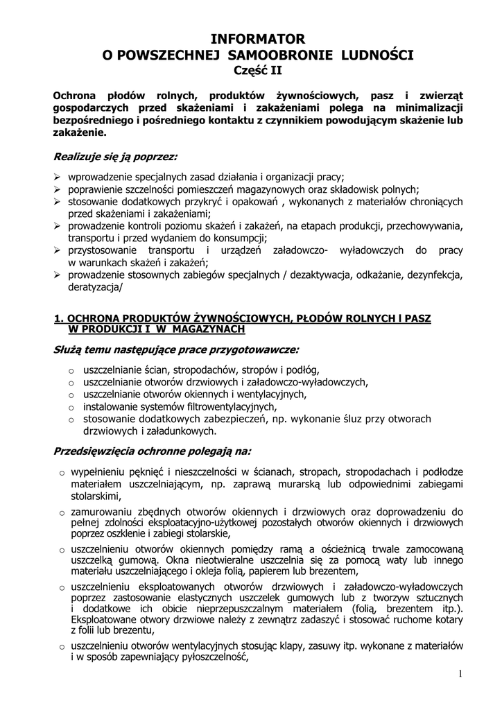 INFORMATOR O POWSZECHNEJ SAMOOBRONIE LUDNOŚCI Część II Ochrona płodów rolnych, produktów żywnościowych, pasz i zwierząt gospodarczych przed skażeniami i zakażeniami polega na minimalizacji bezpośredniego i pośredniego kontaktu z czynnikiem powodującym skażenie lub zakażenie. Realizuje się ją poprzez: wprowadzenie specjalnych zasad działania i organizacji pracy; poprawienie szczelności pomieszczeń magazynowych oraz składowisk polnych; stosowanie dodatkowych przykryć i opakowań , wykonanych z materiałów chroniących przed skażeniami i zakażeniami; prowadzenie kontroli poziomu skażeń i zakażeń, na etapach produkcji, przechowywania, transportu i przed wydaniem do konsumpcji; przystosowanie transportu i urządzeń załadowczo- wyładowczych do pracy w warunkach skażeń i zakażeń; prowadzenie stosownych zabiegów specjalnych / dezaktywacja, odkażanie, dezynfekcja, deratyzacja/ 1. OCHRONA PRODUKTÓW ŻYWNOŚCIOWYCH, PŁODÓW ROLNYCH l PASZ W PRODUKCJI I W MAGAZYNACH Służą temu następujące prace przygotowawcze: o o o o o uszczelnianie ścian, stropodachów, stropów i podłóg, uszczelnianie otworów drzwiowych i załadowczo-wyładowczych, uszczelnianie otworów okiennych i wentylacyjnych, instalowanie systemów filtrowentylacyjnych, stosowanie dodatkowych zabezpieczeń, np. wykonanie śluz przy otworach drzwiowych i załadunkowych. Przedsięwzięcia ochronne polegają na: o wypełnieniu pęknięć i nieszczelności w ścianach, stropach, stropodachach i podłodze materiałem uszczelniającym, np. zaprawą murarską lub odpowiednimi zabiegami stolarskimi, o zamurowaniu zbędnych otworów okiennych i drzwiowych oraz doprowadzeniu do pełnej zdolności eksploatacyjno-użytkowej pozostałych otworów okiennych i drzwiowych poprzez oszklenie i zabiegi stolarskie, o uszczelnieniu otworów okiennych pomiędzy ramą a ościeżnicą trwale zamocowaną uszczelką gumową. Okna nieotwieralne uszczelnia się za pomocą waty lub innego materiału uszczelniającego i okleja folią, papierem lub brezentem, o uszczelnieniu eksploatowanych otworów drzwiowych i załadowczo-wyładowczych poprzez zastosowanie elastycznych uszczelek gumowych lub z tworzyw sztucznych i dodatkowe ich obicie nieprzepuszczalnym materiałem (folią, brezentem itp.). Eksploatowane otwory drzwiowe należy z zewnątrz zadaszyć i stosować ruchome kotary z folii lub brezentu, o uszczelnieniu otworów wentylacyjnych stosując klapy, zasuwy itp. wykonane z materiałów i w sposób zapewniający pyłoszczelność, 1 o stosowaniu typowych urządzeń filtrowentylacyjnych do wentylacji a w przypadku braku takich urządzeń należy wyłączyć zwykłą wentylację, pomieszczeń, o zapewnieniu w procesie produkcji żywności pyłoszczelności pomieszczeń produkcyjnych, ścisłego nadzoru procesów produkcyjnych, w tym kontrolę jakościową i sanitarną oraz poziomu skażeń surowców używanych do produkcji, dodatków i używek, a także gotowego produktu, o stosowaniu opakowań wykonanych z materiałów ograniczających przenikanie czynników biologicznych, substancji promieniotwórczych i trujących oraz wilgoci i zapachów do artykułów żywnościowych Nawet w pomieszczeniach niehermetycznych można zapewnić kilkugodzinną ochronę przed przenikaniem do wnętrza niektórych środków trujących, jeżeli zamknięte okna i drzwi zasłonimy od wewnątrz brezentem, tkaniną workową lub inną tkaniną zamoczoną w wodnym roztworze sody. 2. OCHRONA PRODUKTÓW ŻYWNOŚCIOWYCH PŁODÓW ROLNYCH l PASZ W WARUNKACH POLOWYCH. Ochronę płodów rolnych, produktów spożywczych i pasz w warunkach polowych organizuje się z wykorzystaniem materiałów dostępnych w bieżącej działalności gospodarczoprodukcyjnej: o ziarno i inne produkty spożywcze złożone w pryzmach okrywa się folią, brezentem, słomą, sianem lub darniną. Pod przykrycia brezentowe czy darninę należy kłaść warstwę słomy dla zwiększenia czasu przebicia przez krople i aerozole bojowych środków trujących i biologicznych, o pryzma powinna być usytuowana w miejscu zabezpieczonym przed dopływem wód powierzchniowych, otoczona rowem odwadniającym o głębokości przynajmniej 20 cm i wyłożona słomianym podkładem (matą). Pryzmę ziarna lub innych produktów o wysokości ok. 3 m okrywa się warstwą słomy, a następnie folią lub brezentem. Brzegi materiału użytego do przykrycia przytwierdza się do podłoża. Uprawy polowe w zasadzie będą pozostawione samoczynnemu odkażaniu. Skutki skażeń łagodzone będą odpowiednimi przedsięwzięciami agrotechnicznymi. W uprawach warzywnych należy wykorzystać do ochrony roślin tunele i przykrycia foliowe. Główny wysiłek należy skierować na ochronę przed skażeniami płodów rolnych i pasz już zebranych. Ziarno i pasze treściwe należy z zasady przechowywać w zamkniętych i uszczelnionych pomieszczeniach. Na okres opadania pyłu promieniotwórczego zamyka się także wentylację. Zboża i siano w stogach i stertach powinny być przykryte np. słomą nie przeznaczoną na paszę, wikliną, brezentem, folią. Wokół stogów wykopuje się rowki odpływowe. Rośliny okopowe oraz niektóre warzywa przechowuje się w kopcach przykrytych warstwą słomy i suchej ziemi (podobnie jak na okres zimowy). Najlepiej jednak przechowywać je w piwnicach. Kiszonka znajdująca się w silosach zamkniętych nie wymaga dodatkowego zabezpieczenia. Silosy odkryte należy uszczelnić. Dobrze także chronią doły wyłożone folią i szczelnie przykryte. 2 3. OCHRONA PRODUKTÓW ŻYWNOŚCIOWYCH PŁODÓW ROLNYCH l PASZ W TRANSPORCIE. Podstawowe przedsięwzięcia to: o podwyższanie stopnia ochrony środków transportowych poprzez ich uszczelnienie; o dobór odpowiedniego środka transportowego do przewozu i odpowiednich opakowań; o wykorzystanie właściwości ochronnych nakryć / płachty brezentowe, okrycia foliowe/ i opakowań /worki jutowe i papierowe, skrzynie z tworzyw sztucznych i drewniane
