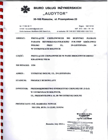 BIURO USLUG INZYNIERSKICH 57 35-105 Rzeszow, ul. Przemyslowa 23 tel. 17 85436 11 Regon: e-mail: [email protected] NIP: 813-305-78-65 Konto bankowe: MultiBank BRE Bank S.A.; OBIEKT: PRZYI4CZE PARAPH POLSKI 180110134 nr rachunku: 36 1 140 2017 0000 4502 1230 7312 CIEPLOWNICZE DO RZYMSKO-KATOLICKIEJ PRZY UL. BUDYNKU P.W.NMP PLEBANI KROLOWEJ 29-LISTOPADA W USTRZYKACH DOLNYCH CZ^SC: PRZYL^CZE OEPLOWNICZE W PASIE DROGOWYM DROGI KRAJOWEJ NR 84 NRDZIALKI: 1326 ADRES : USTRZYKI DOLNE, UL. 29-LISTOPADA STADIUM: PROJEKT BUDOWLANY ESTWESTOR: PRZEDSI^BIORSTWO ENERGETYKI CIEPLNEJ SP. Z O.O. W USTRZYKACH DOLNYCH, UL. PRZEMYSLOWA 16, 38-700 USTRZYKI DOLNE PROJEKTANT: INZ. BARBARA NOWAK NR UPR. BUD.: S-122/82, S195/94 MfOu^ rmjpfni Lufza Mnmfr Rzeszow, luty 2012 r. ca c 4 ™*> - Sprawdzono i uzflco pismenr 24 ZAWARTOSC OPRACOWANIA: I. OPIS TECHNICZNY II. ZA14CZNIKI ZaU. Orientacja w skali 1:10000 Zal.2. Wypis uproszczony z rejestru gruntow Zal.3. Kopia mapy ewidencyjnej w skali 1:2000 III. CZ^SC RYSUNKOWA Projekt zagospodarowania terenu 1:500 rys. nr 1 Profil podluzny przylqcza cieptowniczego 1:500/100 rys. nr2 I. OPIS TECHNICZNY Celem inwestycji jest budowa przytajcza cieplowniczego wysokich parametrow w technologii rur preizolowanych do budynku Plebani Parafii Rzymsko-Katolickiej P.W.NMP Krolowej Polski przy ul. 29-Listopada 24 w Ustrzykach Dolnych. Zgodnie z opracowanym projektem zachodzi koniecznosc przekroczenia drogi krajowej nr 84 Sanok - Kroscienko - Granica Panstwa. Stad w pasie drogowym drogi krajowej nr 84 lokalizuje si? fragment przylacza ciepiowniczego do ww. budynku (rys. nr 1). Przekroczenie drogi krajowej nr 84 w km 39 + 850 projektuje si? podwiertem w rurach ochronnych stalowych 2xDN250 zakonczonych poza granicq. pasa drogowego. Ruroci^gi preizolowane w rurach ochronnych przewiertowych 2xDN250 ukladane b?da^ na pierscieniach dystansowych rolkowych. Konce rur przewiertowych zabezpiecza si? manszetami gumowymi typu N 150x250. Dtugosc rur przewiertowych 21,9 m, w tym 15,8 m w pasie drogowym drogi krajowej nr 84. Przewiert oraz montaz rur wykonywane b?dq. w komorach podawczej i odbiorczej zlokalizowanych poza pasem drogowym. Powierzchnia pasa drogowego (rzut poziomy) zaj?ta przez projektowany odcinek przylacza cieptowniczego: • km 39+850-9,0 m2 Projektowane przytacze cieptownicze z rur preizolowanych zostanie wyposazone w instalacje alarmow^ umozliwiajaca staty nadzor nad stanem technicznym ruroci^gow i dokladnq, lokalizacj? miejsca ewentualnej awarii. Rura preizolowana stanowi jednorodny element skladaj^cy si? z rury przewodowej stalowej zatopionej w izolacji termicznej z pianki poliuretanowej w zewn?trznym piaszczu ostonowym polietylenowym. Rurociqgi preizolowane taczy si? poprzez spawanie elektryczne spoinami co najmniej III klasy. Pofyczenia spawane zabezpiecza si? mufami termokurczliwymi. Po wykonaniu robot spawalniczych jakosc poiaczeri sprawdza si? poprzez wykonanie pr6by radiograficznej lub ultradzwi?kowej 100% polajczeh spawanych. Trasa i posadowienie przyl^cza cieptowniczego po jego wykonaniu w pasie drogowym zostana^ potwierdzone inwentaryzacja^ powykonawczq.. Projektant: inz. Barbara Nowak KOPIA Z MAPY EW/DENCY4^L_ SKALA 1-2000 >: podkarpockse Pcw/ot: bieszczadzki Jednosfka ewidencyjna: Ustrzyk! Dc/ne - miasto Obrsb ew/dencyjny: Ustrzyki Dolne Strom 1/J ;r Uarto Zdeb tin. Z&2.QZJO ^„ \fJS£^3$£& -V .,.•; ,-.' . •ssiifreprocj'tC'A'a • s .•_.•.: ,•-:,••-:-.-. ••S'-ji-'^'^'.^.T-^ ' . Sffil r*.; . .•';•••••£•',•. .vv.v,;^1:.^ Swwtj f'.v,,- • • • '.-JQ Dztotfa ewidencyjna: 1211,1212,1303/1,1303/6,1306/1,1306/2,1307/2,1308,1309.1326 ^ Sekc ie mow-186,312.22; 186.312.23 jnhh —- L/HO / y ni^jj^f , iw.^jic-tt-i-, ii~i^.^>i(_ .c. I ./ . . Ij -• • , ! WW-; ; ^-- - _ • . UUCwU -- . - ! TRASA PROJEKTOWANEGO PRZYU\CZA CIEPLOWNICZEGO ZAfc.NCJ