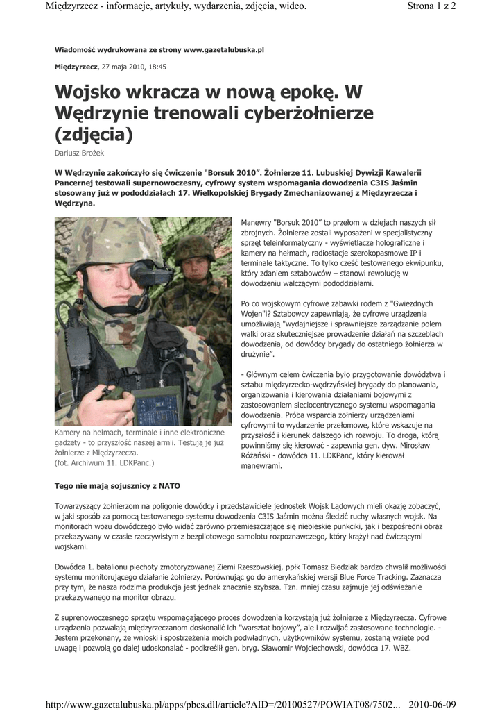 Międzyrzecz - informacje, artykuły, wydarzenia, zdjęcia, wideo. Strona 1 z 2 Wiadomość wydrukowana ze strony www.gazetalubuska.pl Międzyrzecz, 27 maja 2010, 18:45 Wojsko wkracza w nową epokę. W Wędrzynie trenowali cyberŜołnierze (zdjęcia) Dariusz BroŜek W Wędrzynie zakończyło się ćwiczenie "Borsuk 2010”. śołnierze 11. Lubuskiej Dywizji Kawalerii Pancernej testowali supernowoczesny, cyfrowy system wspomagania dowodzenia C3IS Jaśmin stosowany juŜ w pododdziałach 17. Wielkopolskiej Brygady Zmechanizowanej z Międzyrzecza i Wędrzyna. Manewry "Borsuk 2010” to przełom w dziejach naszych sił zbrojnych. śołnierze zostali wyposaŜeni w specjalistyczny sprzęt teleinformatyczny - wyświetlacze holograficzne i kamery na hełmach, radiostacje szerokopasmowe IP i terminale taktyczne. To tylko cześć testowanego ekwipunku, który zdaniem sztabowców – stanowi rewolucję w dowodzeniu walczącymi pododdziałami. Po co wojskowym cyfrowe zabawki rodem z "Gwiezdnych Wojen"i? Sztabowcy zapewniają, Ŝe cyfrowe urządzenia umoŜliwiają "wydajniejsze i sprawniejsze zarządzanie polem walki oraz skuteczniejsze prowadzenie działań na szczeblach dowodzenia, od dowódcy brygady do ostatniego Ŝołnierza w druŜynie”. Kamery na hełmach, terminale i inne elektroniczne gadŜety - to przyszłość naszej armii. Testują je juŜ Ŝołnierze z Międzyrzecza. (fot. Archiwum 11. LDKPanc.) - Głównym celem ćwiczenia było przygotowanie dowództwa i sztabu międzyrzecko-wędrzyńskiej brygady do planowania, organizowania i kierowania działaniami bojowymi z zastosowaniem sieciocentrycznego systemu wspomagania dowodzenia. Próba wsparcia Ŝołnierzy urządzeniami cyfrowymi to wydarzenie przełomowe, które wskazuje na przyszłość i kierunek dalszego ich rozwoju. To droga, którą powinniśmy się kierować - zapewnia gen. dyw. Mirosław RóŜański - dowódca 11. LDKPanc, który kierował manewrami. Tego nie mają sojusznicy z NATO Towarzyszący Ŝołnierzom na poligonie dowódcy i przedstawiciele jednostek Wojsk Lądowych mieli okazję zobaczyć, w jaki sposób za pomocą testowanego systemu dowodzenia C3IS Jaśmin moŜna śledzić ruchy własnych wojsk. Na monitorach wozu dowódczego było widać zarówno przemieszczające się niebieskie punkciki, jak i bezpośredni obraz przekazywany w czasie rzeczywistym z bezpilotowego samolotu rozpoznawczego, który krąŜył nad ćwiczącymi wojskami. Dowódca 1. batalionu piechoty zmotoryzowanej Ziemi Rzeszowskiej, ppłk Tomasz Biedziak bardzo chwalił moŜliwości systemu monitorującego działanie Ŝołnierzy. Porównując go do amerykańskiej wersji Blue Force Tracking. Zaznacza przy tym, Ŝe nasza rodzima produkcja jest jednak znacznie szybsza. Tzn. mniej czasu zajmuje jej odświeŜanie przekazywanego na monitor obrazu. Z suprenowoczesnego sprzętu wspomagającego proces dowodzenia korzystają juŜ Ŝołnierze z Międzyrzecza. Cyfrowe urządzenia pozwalają międzyrzeczanom doskonalić ich "warsztat bojowy”, ale i rozwijać zastosowane technologie. Jestem przekonany, Ŝe wnioski i spostrzeŜenia moich podwładnych, uŜytkowników systemu, zostaną wzięte pod uwagę i pozwolą go dalej udoskonalać - podkreślił gen. bryg. Sławomir Wojciechowski, dowódca 17. WBZ. http://www.gazetalubuska.pl/apps/pbcs.dll/article?AID=/20100527/POWIAT08/7502... 2010-06-09 Międzyrzecz - informacje, artykuły, wydarzenia, zdjęcia, wideo. Strona 2 z 2 W czasie manewrów walczyli z powodzią Podczas ostatniego dnia ćwiczenia w Wędrzynie zaprezentowano nowoczesne metody szkolenia z zakresu udzielania pierwszej pomocy na polu walki. Przygotowanie ćwiczenia "Borsuk 2010” zajęło kilka miesięcy. Pracowały nad nim sztaby ludzi, nie tylko Czarnej Dywizji, ale takŜe z innych jednostek naszych sił zbrojnych oraz róŜnych słuŜb mundurowych i cywilnych. Ze względu na skierowanie części podododziałów i sprzętu do walki z powodzią w woj. dolnośląskim i lubuskim, manewry miały jednak mniejszy rozmach, niŜ planowano. http://www.gazetalubuska.pl/apps/pbcs.dll/article?AID=/20100527/POWIAT08/7502... 2010-06-09