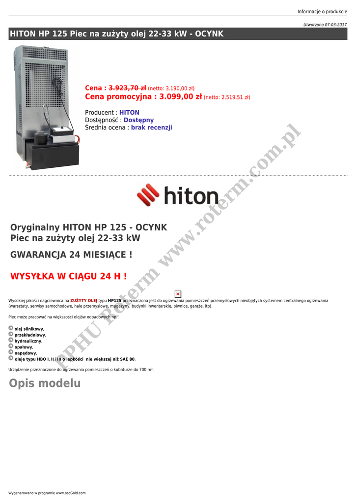 Informacje o produkcie Utworzono 07-03-2017 HITON HP 125 Piec na zużyty olej 22-33 kW - OCYNK Cena : 3.923,70 zł (netto: 3.190,00 zł) Cena promocyjna : 3.099,00 zł (netto: 2.519,51 zł) w .r w er WYSYŁKA W CIĄGU 24 H ! m GWARANCJA 24 MIESIĄCE ! w Oryginalny HITON HP 125 - OCYNK Piec na zużyty olej 22-33 kW ot er m .c om .p l Producent : HITON Dostępność : Dostępny Średnia ocena : brak recenzji ot Wysokiej jakości nagrzewnica na ZUŻYTY OLEJ typu HP125 przeznaczona jest do ogrzewania pomieszczeń przemysłowych nieobjętych systemem centralnego ogrzewania (warsztaty, serwisy samochodowe, hale przemysłowe, magazyny, budynki inwentarskie, piwnice, garaże, itp). R Piec może pracować na większości olejów odpadowych np.: PP H U olej silnikowy, przekładniowy, hydrauliczny, opałowy, napędowy, oleje typu HBO I, II i III o lepkości nie większej niż SAE 80. Urządzenie przeznaczone do ogrzewania pomieszczeń o kubaturze do 700 m3. Opis modelu Wygenerowano w programie www.oscGold.com .p l om er m .c PP H U R ot er m w w w .r ot 1 - Panel sterowania 2 - Zbiornik paliwa 3 - Wlew paliwa 4 - Komora spalania 5 - Rekuperator 6 - Przewód kominowy 7 - Regulator ciągu Charakterystyka Regulowana moc grzewcza (minimum/maximum) Wbudowany sterownik mikroprocesorowy Płynna regulacja mocy 22/33 kW Diody LED sygnalizujące pracę lub ewentualną awarię odpowiednich elementów wykonawczych pieca Trwała i pewna obudowa z powłoką proszkową Komora spalania wykonana ze stali kwasoodpornej Wentylator wyłącza się przy spadku temperatury poniżej 40oC (wbudowany termostat sterujący) Termostatyczny nadzór pracy pompy Ręczny zapłon Panel wylotowy na ścianie czołowej z dmuchawą ciepłego powietrza 100% czyste ciepło Promieniowanie cieplne we wszystkich kierunkach Sterownik pieca z płynnąregulacją mocy er m .c om .p l Informacje o produkcie w Paliwo: w .r przemysł: hale przemysłowe, magazyny, budynki inwentarskie sektor motoryzacyjny: warsztaty oraz serwisy samochodowe rolnictwo: budynki gospodarcze inne: piwnice, garaże, itp. ot Zastosowanie: ● ● ● ● ● ● ot R ● Wydajność: 22/33 kW Przepływ powietrza: 1.000 m/h Zasilanie: 220-240/50 V/Hz Zużycie paliwa: 2,5/3,3 l/h Pobór prądu: 0,6 A Pojemność zbiornika paliwa: 50 l Średnica przyłącza kominowego: 150 mm Wymiary (dł.x szer.x wys.): 540x850x1370 mm Waga: 90 kg U ● PP H ● er Dane techniczne m w pochodzenia mineralnego: (oleje silnikowe, opałowe, przekładniowe, hydrauliczne) pochodzenia roślinnego: (oleje posmazalnicze z gastronomii) oddzielny tryb prac na paliwo diesel Gratis Wygenerowano w programie www.oscGold.com .p l om er m .c ot w .r w w PP H U R ot er m Akcesoria Pewny produkt Nasze 10-cio letnie doświadczenie, zapewnia bezpieczeństwo użytkowania produktu. Do każdego zakupu dołączamy paragon lub Fakturę VAT. Informacje o produkcie PP H U R ot er m w w w .r ot er m .c om .p l Zapewniamy serwis gwarancyjny i pogwarancyjny! Szanujemy Twój czas, dlatego każde zamówienie realizujemy w przeciągu 24h! Nie wiesz czy urządzenie spełni Twoje wymmagania? Pomożemy w doborze odpowiedniego urządzenia. Wygenerowano w programie www.oscGold.com