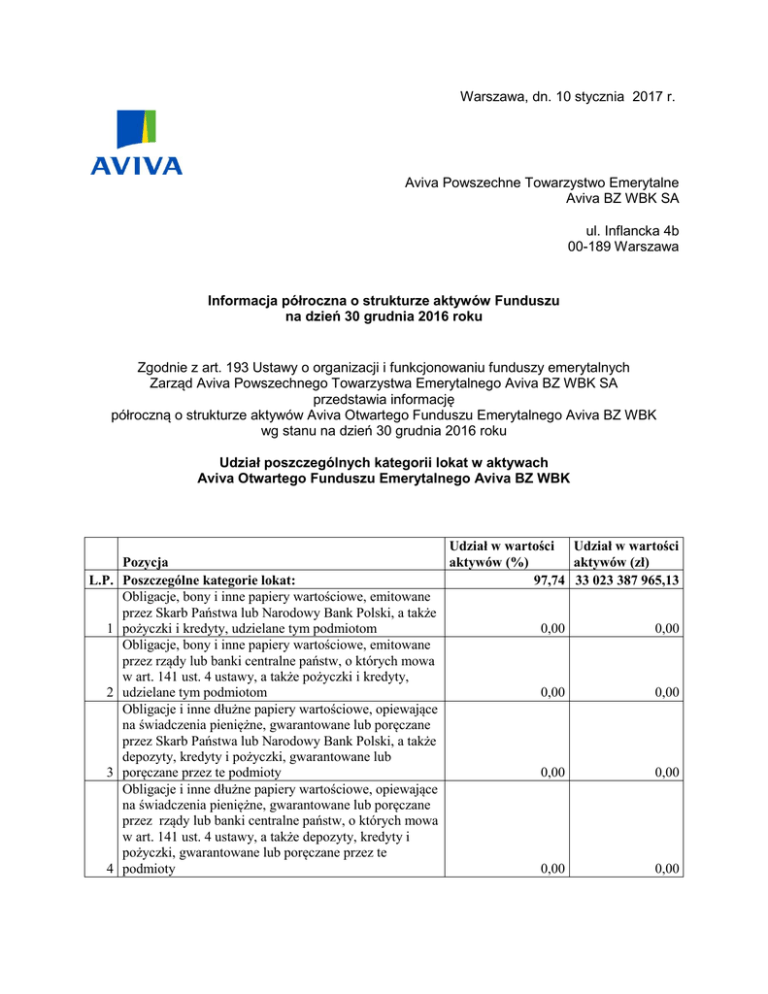 Warszawa, dn. 10 stycznia 2017 r. Aviva Powszechne Towarzystwo Emerytalne Aviva BZ WBK SA ul. Inflancka 4b 00-189 Warszawa Informacja półroczna o strukturze aktywów Funduszu na dzień 30 grudnia 2016 roku Zgodnie z art. 193 Ustawy o organizacji i funkcjonowaniu funduszy emerytalnych Zarząd Aviva Powszechnego Towarzystwa Emerytalnego Aviva BZ WBK SA przedstawia informację półroczną o strukturze aktywów Aviva Otwartego Funduszu Emerytalnego Aviva BZ WBK wg stanu na dzień 30 grudnia 2016 roku Udział poszczególnych kategorii lokat w aktywach Aviva Otwartego Funduszu Emerytalnego Aviva BZ WBK L.P. 1 2 3 4 Udział w wartości Udział w wartości Pozycja aktywów (%) aktywów (zł) Poszczególne kategorie lokat: 97,74 33 023 387 965,13 Obligacje, bony i inne papiery wartościowe, emitowane przez Skarb Państwa lub Narodowy Bank Polski, a także pożyczki i kredyty, udzielane tym podmiotom 0,00 0,00 Obligacje, bony i inne papiery wartościowe, emitowane przez rządy lub banki centralne państw, o których mowa w art. 141 ust. 4 ustawy, a także pożyczki i kredyty, udzielane tym podmiotom 0,00 0,00 Obligacje i inne dłużne papiery wartościowe, opiewające na świadczenia pieniężne, gwarantowane lub poręczane przez Skarb Państwa lub Narodowy Bank Polski, a także depozyty, kredyty i pożyczki, gwarantowane lub poręczane przez te podmioty 0,00 0,00 Obligacje i inne dłużne papiery wartościowe, opiewające na świadczenia pieniężne, gwarantowane lub poręczane przez rządy lub banki centralne państw, o których mowa w art. 141 ust. 4 ustawy, a także depozyty, kredyty i pożyczki, gwarantowane lub poręczane przez te podmioty 0,00 0,00 5 6 7 8 9 10 Depozyty bankowe w walucie polskiej w bankach lub instytucjach kredytowych, mających siedzibę i prowadzących działalność na podstawie zezwolenia właściwych organów nadzoru nad rynkiem finansowym w państwach, o których mowa w art. 141 ust. 4 ustawy BANK POLSKA KASA OPIEKI S.A. Depozyty denominowane w walutach państw, o których mowa w art. 141 ust. 4 ustawy, w bankach lub instytucjach kredytowych, mających siedzibę i prowadzących działalność na podstawie zezwolenia właściwych organów nadzoru nad rynkiem finansowym w państwach, o których mowa w art. 141 ust. 4 ustawy Akcje spółek notowanych na rynku regulowanym na terytorium Rzeczypospolitej Polskiej oraz obligacje zamienne na akcje tych spółek, a także notowane na tym rynku prawa poboru i prawa do akcji ALIOR BANK S.A. ASSECO POLAND S.A. BANK MILLENNIUM S.A. BANK POLSKA KASA OPIEKI S.A. BUDIMEX S.A. CCC S.A. CYFROWY POLSAT S.A. GRUPA KĘTY S.A. ING BANK ŚLĄSKI S.A. INTER CARS S.A. KGHM POLSKA MIEDŹ S.A. LPP S.A. MBANK S.A. PGE POLSKA GRUPA ENERGETYCZNA S.A. POLSKI KONCERN NAFTOWY ORLEN S.A. POLSKIE GÓRNICTWO NAFTOWE I GAZOWNICTWO S.A. POWSZECHNA KASA OSZCZĘDNOŚCI BANK POLSKI S.A. POWSZECHNY ZAKŁAD UBEZPIECZEŃ S.A. SYNTHOS S.A. Akcje, prawa poboru i prawa do akcji, będące przedmiotem oferty publicznej na terytorium Rzeczypospolitej Polskiej Akcje spółek notowanych na rynku regulowanym w państwach innych niż Rzeczpospolita Polska oraz obligacje zamienne na akcje tych spółek, a także notowane na tych rynkach prawa poboru i prawa do akcji Akcje, prawa poboru i prawa do akcji, będące przedmiotem oferty publicznej na terytorium państw, o których mowa w art. 141 ust. 4 ustawy 5,92 1,33 2 000 000 000,00 450 000 000,00 0,00 0,00 76,02 25 688 054 638,33 1,59 536 802 770,80 1,75 591 281 389,31 1,01 340 477 661,88 4,00 1 352 348 682,87 1,37 462 106 309,60 1,85 623 654 280,00 1,80 608 262 903,15 1,89 638 628 064,78 5,23 1 766 810 607,04 1,58 534 177 607,68 2,16 729 371 424,45 2,23 754 156 197,76 1,89 638 713 704,60 1,31 442 561 833,00 7,72 2 608 411 956,15 1,89 637 260 954,98 7,29 4,38 1,18 2 462 110 642,90 1 480 502 820,30 400 359 197,34 0,00 0,00 6,74 2 279 062 052,76 0,00 0,00 Certyfikaty inwestycyjne emitowane przez fundusze 11 inwestycyjne zamknięte Tytuły uczestnictwa emitowane przez instytucje wspólnego inwestowania typu zamkniętego, mające siedzibę na terytorium państw, o których mowa w art. 12 141 ust. 4 ustawy Jednostki uczestnictwa zbywane przez fundusze inwestycyjne otwarte lub specjalistyczne fundusze 13 inwestycyjne otwarte Tytuły uczestnictwa emitowane przez instytucje wspólnego inwestowania typu otwartego, mające siedzibę na terytorium państw, o których mowa w art. 14 141 ust. 4 ustawy Obligacje i inne dłużne papiery wartościowe, będące przedmiotem oferty publicznej, emitowane przez 15 jednostki samorządu terytorialnego lub ich związki Obligacje i inne dłużne papiery wartościowe będące przedmiotem oferty publicznej, emitowane przez właściwe regionalne lub lokalne władze publiczne 16 państw, o których mowa w art. 141 ust. 4 ustawy Obligacje i inne dłużne papiery wartościowe inne niż będące przedmiotem oferty publicznej, emitowane przez 17 jednostki samorządu terytorialnego lub ich związki Obligacje i inne dłużne papiery wartościowe inne niż będące przedmiotem oferty publicznej, emitowane przez właściwe regionalne lub lokalne władze publiczne 18 państw, o których mowa w art. 141 ust. 4 ustawy Obligacje przychodowe, o których mowa w ustawie z 19 dnia 29 czerwca 1995 r. o obligacjach Dłużne papiery wartościowe, których emitent może ograniczyć swoją odpowiedzialność za zobowiązania z nich wynikające do kwoty przychodów lub wartości majątku przedsięwzięcia, do których obligatariuszowi służy prawo pierwszeństwa przed innymi wierzycielami emitenta i których emitentami mogą być podmioty mające siedzibę na terytorium państw, o których mowa 20 w art. 141 ust. 4 ustawy Obligacje będące przedmiotem oferty publicznej na terytorium Rzeczypospolitej Polskiej emitowane przez inne podmioty niż jednostki samorządu terytorialnego lub ich związki, które zostały zabezpieczone w wysokości odpowiadającej pełnej wartości nominalnej i 21 ewentualnemu oprocentowaniu Obl