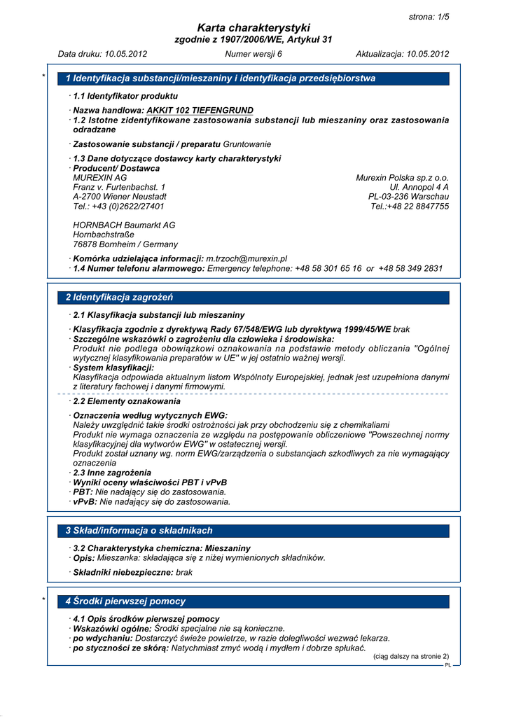 34.1.1 strona: 1/5 Karta charakterystyki zgodnie z 1907/2006/WE, Artykuł 31 Data druku: 10.05.2012 * Numer wersji 6 Aktualizacja: 10.05.2012 1 Identyfikacja substancji/mieszaniny i identyfikacja przedsiębiorstwa · 1.1 Identyfikator produktu · Nazwa handlowa: AKKIT 102 TIEFENGRUND · 1.2 Istotne zidentyfikowane zastosowania substancji lub mieszaniny oraz zastosowania odradzane · Zastosowanie substancji / preparatu Gruntowanie · 1.3 Dane dotyczące dostawcy karty charakterystyki · Producent/ Dostawca MUREXIN AG Franz v. Furtenbachst. 1 A-2700 Wiener Neustadt Tel.: +43 (0)2622/27401 Murexin Polska sp.z o.o. Ul. Annopol 4 A PL-03-236 Warschau Tel.:+48 22 8847755 HORNBACH Baumarkt AG Hornbachstraße 76878 Bornheim / Germany · Komórka udzielająca informacji: [email protected] · 1.4 Numer telefonu alarmowego: Emergency telephone: +48 58 301 65 16 or +48 58 349 2831 2 Identyfikacja zagrożeń · 2.1 Klasyfikacja substancji lub mieszaniny · Klasyfikacja zgodnie z dyrektywą Rady 67/548/EWG lub dyrektywą 1999/45/WE brak · Szczególne wskazówki o zagrożeniu dla człowieka i środowiska: Produkt nie podlega obowiązkowi oznakowania na podstawie metody obliczania "Ogólnej wytycznej klasyfikowania preparatów w UE" w jej ostatnio ważnej wersji. · System klasyfikacji: Klasyfikacja odpowiada aktualnym listom Wspólnoty Europejskiej, jednak jest uzupełniona danymi z literatury fachowej i danymi firmowymi. · 2.2 Elementy oznakowania · Oznaczenia według wytycznych EWG: Należy uwzględnić takie środki ostrożności jak przy obchodzeniu się z chemikaliami Produkt nie wymaga oznaczenia ze względu na postępowanie obliczeniowe "Powszechnej normy klasyfikacyjnej dla wytworów EWG" w ostatecznej wersji. Produkt został uznany wg. norm EWG/zarządzenia o substancjach szkodliwych za nie wymagający oznaczenia · 2.3 Inne zagrożenia · Wyniki oceny właściwości PBT i vPvB · PBT: Nie nadający się do zastosowania. · vPvB: Nie nadający się do zastosowania. 3 Skład/informacja o składnikach · 3.2 Charakterystyka chemiczna: Mieszaniny · Opis: Mieszanka: składająca się z niżej wymienionych składników. · Składniki niebezpieczne: brak * 4 Środki pierwszej pomocy · 4.1 Opis środków pierwszej pomocy · Wskazówki ogólne: Środki specjalne nie są konieczne. · po wdychaniu: Dostarczyć świeże powietrze, w razie dolegliwości wezwać lekarza. · po styczności ze skórą: Natychmiast zmyć wodą i mydłem i dobrze spłukać. (ciąg dalszy na stronie 2) PL 34.1.1 strona: 2/5 Karta charakterystyki zgodnie z 1907/2006/WE, Artykuł 31 Data druku: 10.05.2012 Numer wersji 6 Aktualizacja: 10.05.2012 Nazwa handlowa: AKKIT 102 TIEFENGRUND (ciąg dalszy od strony 1) · po styczności z okiem: Płukać oczy z otwartą powieką przez kilka minut pod bieżącą wodą. W przypadku utrzymującej się dolegliwości zasięgnąć porady lekarza. · po przełknięciu: Przy trwałych dolegliwościach porozumieć się z lekarzem. · 4.2 Najważniejsze ostre i opóźnione objawy oraz skutki narażenia Brak dostępnych dalszych istotnych danych · 4.3 Wskazania dotyczące wszelkiej natychmiastowej pomocy lekarskiej i szczególnego postępowania z poszkodowanym Brak dostępnych dalszych istotnych danych * 5 Postępowanie w przypadku pożaru · 5.1 Środki gaśnicze · Przydatne środki gaśnicze: CO2, proszek gaśniczy lub strumień wody. Większy pożar zwalczać strumieniem wody lub pianą odporną na działanie alkoholu. · 5.2 Szczególne zagrożenia związane z substancją lub mieszaniną Brak dostępnych dalszych istotnych danych · 5.3 Informacje dla straży pożarnej · Specjalne wyposażenie ochronne: Środki specjalne nie są konieczne. * 6 Postępowanie w przypadku niezamierzonego uwolnienia do środowiska · 6.1 Indywidualne środki ostrożności, wyposażenie ochronne i procedury w sytuacjach awaryjnych Nosić osobistą odzież ochronną. · 6.2 Środki ostrożności w zakresie ochrony środowiska: Nie dopuścić do przedostania się do kanalizacji lub zbiorników wodnych. Rozcieńczyć dużą ilością wody. · 6.3 Metody i materiały zapobiegające rozprzestrzenianiu się skażenia i służące do usuwania skażenia: Zebrać za pomocą materiału wiążącego ciecze (piasek, ziemia okrzemkowa, materiał wiążący kwasy, materiał wiążący uniwersalny, trociny). · 6.4 Odniesienia do innych sekcji Nie powstają żadne materiały niebezpieczne. Informacje na temat bezpiecznej obsługi patrz rozdział 7. Informacje na temat osobistego wyposażenia ochronnego patrz rozdział 8. Informacje na temat utylizacji patrz rozdział 13. * 7 Postępowanie z substancjami i mieszaninami oraz ich magazynowanie · 7.1 Środki ostrożności dotyczące bezpiecznego postępowania Środki specjalne nie są konieczne. · Wskazówki dla ochrony przeciwpożarowej i przeciwwybuchowej: Nie są potrzebne szczególne zabiegi. · 7.2 Warunki bezpiecznego magazynowania, łącznie z informacjami dotyczącymi wszelkich wzajemnych niezgodności · Składowanie: · Wymagania w stosunku do pomieszczeń składowych i zbiorników: Przechowywać tylko w oryginalnych beczkach. · Wskazówki odnośnie wspólnego składowania: nie konieczne · Dalsze wskazówki odnośnie warunków składowania: Chronić przed mrozem. (ciąg dalszy na stronie 3) PL 34.1.1 strona: 3/5 Karta charakterystyki zgodnie z 1907/2006/WE, Artykuł 31 Data druku: 10.05.2012 Numer wersji 6 Aktualizacja: 10.05.2012 Nazwa handlowa: AKKIT 102 TIEFENGRUND (ciąg dalszy od strony 2) · 7.3 Szczególne zastosowanie(-a) końcowe Brak dostępnych dalszych istotnych danych * 8 Kontrola narażenia/środki ochrony indywidualnej · Dodatkowe wskazówki dla wykonania urządzeń technicznych: Brak dalszych danych, patrz punkt 7. · 8.1 Parametry dotyczące kontroli · Składniki wraz z kontrolowanymi wartościami granicznymi zależnymi od miejsca pracy: Produkt nie zawiera znaczących ilości materiałów, których wartości graniczne musiałyby być kontrolowan
