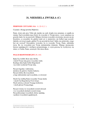 XXXI DOMINGO DEL TIEMPO ORDINARIO 4 de noviembre de 2007 31. NIEDZIELA ZWYKŁA (C) PIERWSZE CZYTANIE (Mdr 11, 22-12, 2 ) Czytanie z Księgi proroka Mądrości. Panie, świat cały przy Tobie jak ziarnko na szali, kropla rosy porannej, co spadła na ziemię. Nad wszystkim masz litość, bo wszystko w Twojej mocy, i oczy zamykasz na grzechy ludzi, by się nawrócili. Miłujesz bowiem wszystkie stworzenia, niczym się nie brzydzisz, co uczyniłeś, bo gdybyś miał coś w nienawiści, nie byłbyś tego uczynił. Jakżeby coś trwać mogło, gdybyś Ty nie powołał do bytu? Jakby się zachowało, czego byś nie wezwał? Oszczędzisz wszystko, bo to wszystko Twoje, Panie, miłośniku życia. Bo we wszystkim jest Twoje nieśmiertelne tchnienie. Dlatego nieznacznie karzesz upadających i strofujesz przypominając, w czym grzeszą, by wyzbywszy się złości, w Ciebie, Panie, uwierzyli. Oto słowo Boże. PSALM RESPONSORYJNY (Ps 145) Będę Cię wielbił, Boże mój i Królu, i sławił Twoje imię przez wszystkie wieki. Każdego dnia będę Ciebie błogosławił i na wieki wysławiał Twoje imię. Pan jest łagodny i miłosierny, nieskory do gniewu i bardzo łaskawy. Pan jest dobry dla wszystkich, a Jego miłosierdzie nad wszystkim, co stworzył. Niech Cię wielbią Panie wszystkie Twoje dzieła i niech Cię błogosławią Twoi święci. Niech mówią o chwale Twojego królestwa i niech głoszą Twoją potęgę. Pan jest wierny we wszystkich swoich słowach i we wszystkich dziełach swoich święty. Pan podtrzymuje wszystkich, którzy upadają, i podnosi wszystkich zgnębionych. CONFERENCIA EPISCOPAL ESPAÑOLA http://www.conferenciaepiscopal.es 1 XXXI DOMINGO DEL TIEMPO ORDINARIO 4 de noviembre de 2007 DRUGIE CZYTANIE (2 Tes 1, 11-2, 2 ) Czytanie Z Drugiego Listu świętego Pawła Apostoła do Tesaloniczan: Bracia: Modlimy się zawsze za was, aby Bóg nasz uczynił was godnymi swego wezwania, aby z mocą udoskonalił w was wszelkie pragnienie dobra oraz czyn płynący z wiary. Aby w was zostało uwielbione imię Pana naszego Jezusa Chrystusa, a wy w Nim, za łaską Boga naszego i Pana Jezusa Chrystusa. W sprawie przyjścia Pana naszego Jezusa Chrystusa i naszego zgromadzenia wokół Niego prosimy was, bracia, abyście się nie dali zbyt łatwo zachwiać w waszym rozumieniu ani zatracić bądź przez ducha, bądź przez mowę, bądź przez list rzekomo od nas pochodzący, jakoby już nastawał dzień Pański. Oto słowo Boże. EWANGELIA (Łk 19, 1-10 ) Słowa Ewangelii według świętego Łukasza. Jezus wszedł do Jerycha i przechodził przez miasto. A był tam pewien człowiek, imieniem Zacheusz, zwierzchnik celników i bardzo bogaty. Chciał on koniecznie zobaczyć Jezusa, kto to jest, ale nie mógł z powodu tłumu, gdyż był niskiego wzrostu. Pobiegł więc naprzód i wspiął się na sykomorę, aby móc Go ujrzeć, tamtędy bowiem miał przechodzić. Gdy Jezus przyszedł na to miejsce, spojrzał w górę i rzekł do niego: «Zacheuszu, zejdź prędko, albowiem dziś muszę się zatrzymać w twoim domu». Zszedł więc z pośpiechem i przyjął Go rozradowany. A wszyscy widząc to szemrali: «Do grzesznika poszedł w gościnę». Lecz Zacheusz stanął i rzekł do Pana: «Panie, oto połowę mego majątku daję ubogim, a jeśli kogo w czym skrzywdziłem zwracam poczwórnie». Na to Jezus rzekł do niego: «Dziś zbawienie stało się udziałem tego domu, gdyż i on jest synem Abrahama. Albowiem Syn Człowieczy przyszedł szukać i zbawić to, co zginęło». Oto słowo Pańskie. CONFERENCIA EPISCOPAL ESPAÑOLA http://www.conferenciaepiscopal.es 2
