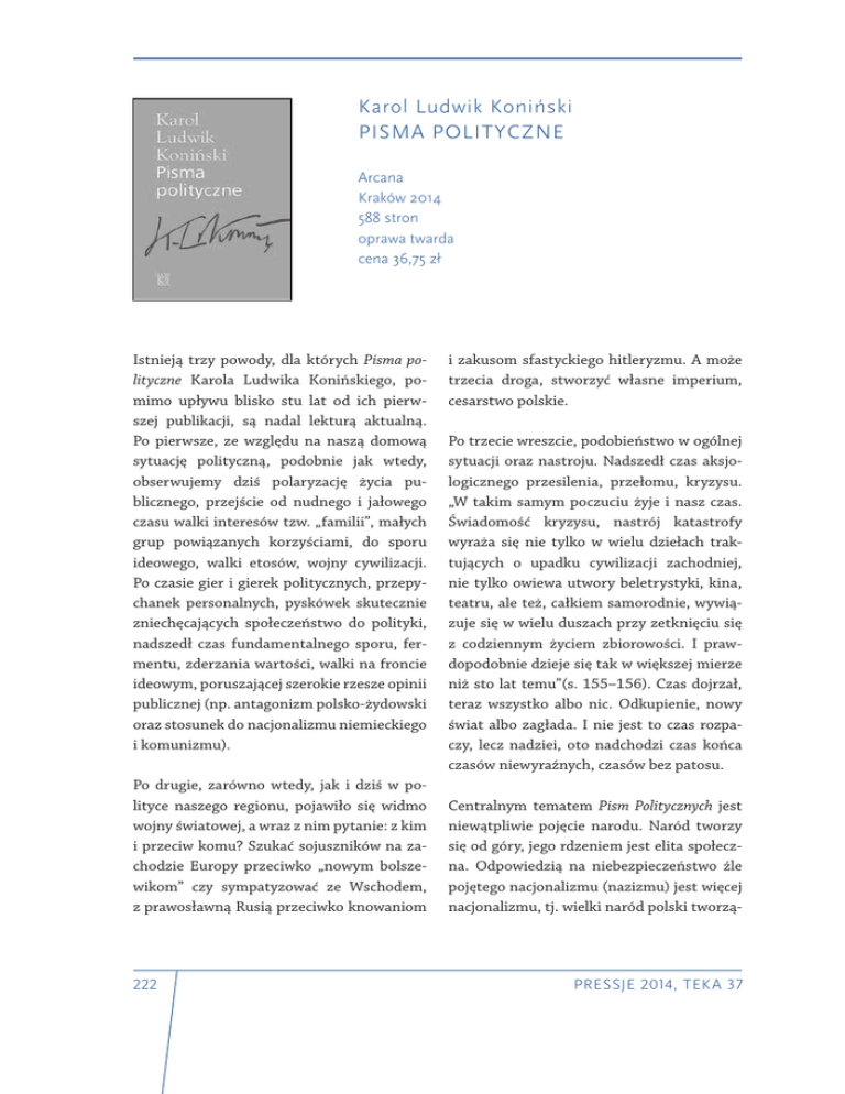 Karol Ludwik Koniński pisma polityczne Arcana Kraków 2014 588 stron oprawa twarda cena 36,75 zł Istnieją trzy powody, dla których Pisma polityczne Karola Ludwika Konińskiego, pomimo upływu blisko stu lat od ich pierwszej publikacji, są nadal lekturą aktualną. Po pierwsze, ze względu na naszą domową sytuację polityczną, podobnie jak wtedy, obserwujemy dziś polaryzację życia publicznego, przejście od nudnego i jałowego czasu walki interesów tzw. „familii”, małych grup powiązanych korzyściami, do sporu ideowego, walki etosów, wojny cywilizacji. Po czasie gier i gierek politycznych, przepychanek personalnych, pyskówek skutecznie zniechęcających społeczeństwo do polityki, nadszedł czas fundamentalnego sporu, fermentu, zderzania wartości, walki na froncie ideowym, poruszającej szerokie rzesze opinii publicznej (np. antagonizm polsko-żydowski oraz stosunek do nacjonalizmu niemieckiego i komunizmu). Po drugie, zarówno wtedy, jak i dziś w polityce naszego regionu, pojawiło się widmo wojny światowej, a wraz z nim pytanie: z kim i przeciw komu? Szukać sojuszników na zachodzie Europy przeciwko „nowym bolszewikom” czy sympatyzować ze Wschodem, z prawosławną Rusią przeciwko knowaniom 222 i zakusom sfastyckiego hitleryzmu. A może trzecia droga, stworzyć własne imperium, cesarstwo polskie. Po trzecie wreszcie, podobieństwo w ogólnej sytuacji oraz nastroju. Nadszedł czas aksjologicznego przesilenia, przełomu, kryzysu. „W takim samym poczuciu żyje i nasz czas. Świadomość kryzysu, nastrój katastrofy wyraża się nie tylko w wielu dziełach traktujących o upadku cywilizacji zachodniej, nie tylko owiewa utwory beletrystyki, kina, teatru, ale też, całkiem samorodnie, wywiązuje się w wielu duszach przy zetknięciu się z codziennym życiem zbiorowości. I prawdopodobnie dzieje się tak w większej mierze niż sto lat temu”(s. 155–156). Czas dojrzał, teraz wszystko albo nic. Odkupienie, nowy świat albo zagłada. I nie jest to czas rozpaczy, lecz nadziei, oto nadchodzi czas końca czasów niewyraźnych, czasów bez patosu. Centralnym tematem Pism Politycznych jest niewątpliwie pojęcie narodu. Naród tworzy się od góry, jego rdzeniem jest elita społeczna. Odpowiedzią na niebezpieczeństwo źle pojętego nacjonalizmu (nazizmu) jest więcej nacjonalizmu, tj. wielki naród polski tworzą- PRESSJE 2014, TEKA 37 cy silne państwo. Granicą nacjonalizmu jest humanizm. Nacjonalizm jest humanizmem albo przestaje istnieć, przeradza się w szowinizm. Humanizm jest szacunkiem dla godności człowieka, paradygmatem określającym wszystkie obszary życia, łącznie z metafizyką. Nacjonalizm jest miłością do narodu, humanizm jest miłością narodu do człowieka i do ludzkości jako takiej: „A naród, któryby z dobytków pracy wszechludzkiej korzystając, w patriotyzmie swym obrócił się przeciwko humanizmowi, tj. przeciw idei szacunku dla człowieka jako człowieka – ten naród sprawiedliwie by został zniweczony” (s. 203). Liczne postulaty Konińskiego można wyrazić w jednym zdaniu: „Musi przyjść choćby parę lat patosu” (s. 73). Patos lub „wielkie serio” to elitarność myślenia, odczuwania oraz czynu (pracy). Celem jest „nawartościowanie” wszystkich dziedzin życia, najwyższymi wartościami. Celem jest czyn celowy, a nie gest. Patos, to jakby odwrócenie idei śmierci Boga Nietzschego, to powrót do najwznioślejszych czasów chrześcijaństwa, do myślenia według kategorii absolutnych. W życiu politycznym władza patosu ma zastąpić władzę frazesów. Myślenie patetyczne ma przebić się przez duchowy fałsz, blichtr, powierzchowność: „Takie myślenie – jest dobrze uzdolnione do przezierania na wskroś wszelkiego frazesu, pomijania pozorów, wglądania w całą trudność i nieprostolinijność rzeczy” (s. 228). Szczytem myślenia patetycznego jest imperializm, nie zaś mesjanizm. Ten drugi jest resentymentem rodzącym się w czasach ucisku, pozwala przetrwać czas hekatomby i jako taki jest zjawiskiem pozytywnym, ale tymczasowym, w żadnym razie nie może stać się stylem myślenia i działania długofalowego, tworzenia projektów państwa. Przeciwnie imperializm, który jest syndromem siły, objawem zdrowia, witalności, wzrastającej świadomości własnej potęgi. To szukanie trwałej federacji, a nie ulotnych sojuszów. Imperium lub cesarstwo polskie ma być federacją państw od Bałtyku na północy po Czarnogórę na południu, a wszystko w duchu CK Habsburgów. Według Konińskiego istnieją zatem dwie drogi dla Polski: droga mocarstwa albo droga zagłady. „Wielkie serio” narodu, jego potęga, pełnia mocy to ostatecznie jego być albo nie być. W myśleniu patetycznym nie ma nic pomiędzy. Piotr Klimowski 223