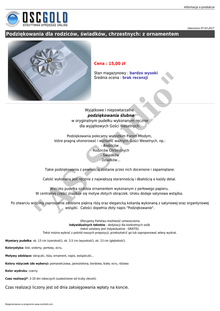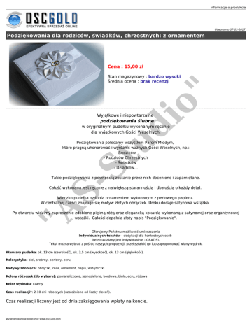 Informacje o produkcie Utworzono 07-03-2017 Podziękowania dla rodziców, świadków, chrzestnych: z ornamentem Cena : 15,00 zł o" Stan magazynowy : bardzo wysoki Średnia ocena : brak recenzji ud i Wyjątkowe i niepowtarzalne podziękowania ślubne w oryginalnym pudełku wykonanym ręcznie dla wyjątkowych Gości Weselnych. St Podziękowania polecamy wszystkim Parom Młodym, które pragną uhonorować i wyróżnić ważnych Gości Weselnych, np.: - Rodziców - Rodziców Chrzestnych - Świadków - Dziadków... S- Takie podziękowania z pewnością zostanie przez nich docenione i zapamiętane. Całość wykonana jest ręcznie z największą starannością i dbałością o każdy detal. "A Wieczko pudełka ozdobia ornamentem wykonanym z perłowego papieru. W centralnej części znajduje się motyw złotych obrączek. Uroku dodaje satynowa wstążka. Po otwarciu widzimy zaproszenie zdobione piękną różą oraz elegancką kokardą wykonaną z satynowej oraz organtynowej wstążki. Całości dopełnia złoty napis "Podziękowanie". Oferujemy Państwu możliwość umieszczenia indywidualnych tekstów - dedykacji dla konkretnych osób (tekst ustalany jest indywidualnie - GRATIS). Tekst można wybrać z pośród naszych propozycji, przekształcić go lub zaproponować włany wydruk. Wymiary pudełka: ok. 13 cm (szerokość), ok. 3,5 cm (wysokość), ok. 13 cm (głębokość). Kolorystyka: biel, srebrny, perłowy, ecru, Motywy zdobiące: obrączki, róża, ornament, napis, wstążeczki... Kolory różyczek (do wyboru): pomarańczowa, jasnozielona, bordowa, biała, ecru, różowa Kolor wydruku: czarny Czas realizacji*: 2-10 dni roboczych (uzależnione od liczby zleceń). Czas realizacji liczony jest od dnia zaksięgowania wpłaty na koncie. Wygenerowano w programie www.oscGold.com Etapy realizacji zamówienia 1. Proszę zamówić potrzebną ilość zaproszeń 2. Prosimy o zapoznanie się z wzornikiem (w zakładce "Linki" na karcie produktu - "Kliknij aby pobrać specyfikację produktu PDF") oraz wybór: Wzoru czcionki użytej do wydruku tekstu zaproszenia b. Wzoru czcionki użytej do wydruku imion i nazwisk Pary Młodej (jeżeli inna niż użyta do tekstu zaproszenia) c. Tekstu zaproszenia d. Cytatu / sentencji e. Wierszyka z prośbą o prezenty (na życzenie) Do 24h prześlemy formularz zamówienia (czas ten może ulec wydłużeniu jeżeli zamówienie zostało złożone w dniu wolnym od pracy) 4. Należy uzupełnić i odesłać "Formularz zamówienia", w którym znajdują się wszystkie niezbędne informacje potrzebne do sporządzenia projektu. o" 5. Na podstawie otrzymanego "Formularza zamówień" wykonujemy projekt tekstu a następnie przesyłamy go Państwu do wglądu w formacie .pdf (do 2 dni roboczych) 6. Czekamy na informację od Państwa czy projekt został zaakceptowany czy też wymaga wprowadzenia poprawek 7. Po akceptacji projektu oraz zaksięgowaniu wpłaty należności przystępujemy do pracy S- St ud i Wysyłkę zamówionych produktów potwierdzamy e-mailem bądź telefonicznie. "A 3. a.