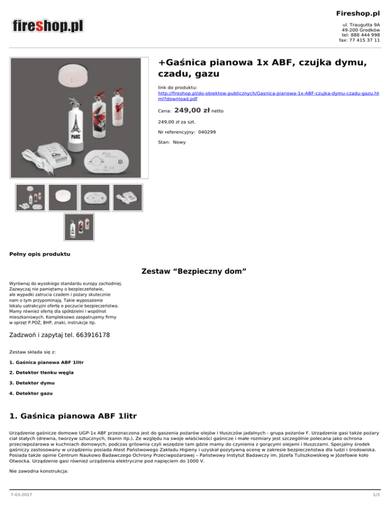Fireshop.pl ul. Traugutta 9A 49-200 Grodków tel: 888 444 998 fax: 77 415 37 11 +Gaśnica pianowa 1x ABF, czujka dymu, czadu, gazu link do produktu: http://fireshop.pl/do-obiektow-publicznych/Gasnica-pianowa-1x-ABF-czujka-dymu-czadu-gazu.ht ml?download.pdf Cena: 249,00 zł netto 249,00 zł za szt. Nr referencyjny: 040299 Stan: Nowy Pełny opis produktu Zestaw “Bezpieczny dom” Wyrównaj do wysokiego standardu europy zachodniej. Zazwyczaj nie pamiętamy o bezpieczeństwie, ale wypadki zatrucia czadem i pożary skutecznie nam o tym przypominają. Takie wyposażenie lokalu uatrakcyjni ofertę o poczucie bezpieczeństwa. Mamy również ofertę dla spółdzielni i wspólnot mieszkaniowych. Kompleksowo zaopatrujemy firmy w sprzęt P.POŻ, BHP, znaki, instrukcje itp. Zadzwoń i zapytaj tel. 663916178 Zestaw składa się z: 1. Gaśnica pianowa ABF 1litr 2. Detektor tlenku węgla 3. Detektor dymu 4. Detektor gazu 1. Gaśnica pianowa ABF 1litr Urządzenie gaśnicze domowe UGP-1x ABF przeznaczona jest do gaszenia pożarów olejów i tłuszczów jadalnych - grupa pożarów F. Urządzenie gasi także pożary ciał stałych (drewna, tworzyw sztucznych, tkanin itp.). Ze względu na swoje właściwości gaśnicze i małe rozmiary jest szczególnie polecana jako ochrona przeciwpożarowa w kuchniach domowych, podczas grilownia czyli wszędzie tam gdzie mamy do czynienia z gorącymi olejami i tłuszczami. Specjalny środek gaśniczy zastosowany w urządzeniu posiada Atest Państwowego Zakładu Higieny i uzyskał pozytywną ocenę w zakresie bezpieczeństwa dla ludzi i środowiska. Posiada także opinie Centrum Naukowo Badawczego Ochrony Przeciwpożarowej – Państwowy Instytut Badawczy im. Józefa Tuliszkowskieg w Józefowie koło Otwocka. Urządzenie gasi również urządzenia elektryczne pod napięciem do 1000 V. Nie zawodna konstrukcja: 7-03-2017 1/3 - głowica wykonana z mosiądzu pokryta niklem, - zawór bezpieczeństwa w głowicy, - zbiornik pokryty farbą proszkową odporną na promieniowanie UV i uszkodzenia mechaniczne, - spód urządzenia zabezpieczony podstawą z tworzywa, - środek gaśniczy posiadający Atest PZH, - urządzenie posiada Opinie Techniczną CNBOP-PIB w Józefowie. 2. Detektor tlenku węgla Podstawowa wersja detektora przeznaczona do monitorowania pomieszczeń zagrożonych emisją tlenku węgla. Kontrola polega na cyklicznym pomiarze, co 30 sek., stężenia tlenku węgla w powietrzu. Przekroczenie dopuszczalnego poziomu CO sygnalizowane jest optycznie (czerwona dioda LED) oraz akustycznie (głośny, pulsacyjny alarm dźwiękowy o sile 85dB). Detektor posiada przycisk Test/Reset umożliwiający sprawdzenie przez użytkownika prawidłowości działania urządzenia. Układ kontroli sprawności monitoruje na bieżąco min.: sensor, wewnętrzne obwody oraz stan baterii. W przypadku wykrycia usterki włącza się informacja odpowiednia do wykrytego uszkodzenia. Zintegrowane zasilanie bateryjne umożliwia zamontowanie detektora w najbardziej optymalnym miejscu oraz gwarantuje ochronę również w przypadku zaniku napięcia zasilania w sieci. Dzięki specjalnie zaprojektowanej obudowie urządzenie oprócz montażu na ścianie, może być także postawione na płaskiej powierzchni np. na szafce nocnej w pobliżu łóżka. Wersja podobna - czujnik tlenku węgla Biedronka ZALETY ● Technologia elektrochemiczna - jeden z najprecyzyjniejszych sensorów elektrochemicznych ● Dłuższy o 40% okres pracy w porównaniu z poprzednimi modelami ● Dwa razy mniejsze wymiary w porównaniu ze starszymi modelami ● Głośna sygnalizacja alarmowa ● Funkcja Test/Reset do kontroli i obsługi urządzenia ● Zasilanie bateryjne zapewniające ochronę również przy zaniku napięcia zasilania ● Możliwość montażu na ścianie lub postawienia detektora na płaskiej powierzchni ● Sygnalizacja końca okresu działania detektora ● Niski koszt eksploatacji, niewielkie wymiary oraz waga ● Prosty sposób montażu i obsługi ● Ergonomiczna i wytrzymała obudowa ● 7 letnia gwarancja Detektor posiada certyfikat potwierdzający spełnienie wymagań polskiej normy PN EN 50291: 2001 dla domowych detektorów tlenku węgla. Zgodność z tą normą została potwierdzona przez niezależną jednostkę badawczą British Standard Institute (BSI). Ponadto został pozytywnie zaopiniowany przez brytyjską organizację CORGI i jest polecany do montażu jako domowe zabezpieczenia przed tlenkiem węgla. 3. Detektor dymu Najważniejsze zadanie czujki to obudzić w nocy, kiedy wszyscy śpią, a dym po cichu ogarnia stopniowo kolejne pomieszczenia. Dzięki zastosowaniu techniki fotoelektrycznej czujka pozwala rozpoznać zagrożenie w początkowym stadium pożaru. Zalecamy zastosowanie czujek dymu w każdym pomieszczeniu. Przyspieszy to czas reakcji czujki i wcześniej zaalarmuje otoczenie. Szczególnie ważne to jest w nocy, kiedy śpią. W większych pokojach odległość pomiędzy urządzeniami powinna wynosić około 9 m w linii prostej. Czujka dymu zasilana baterią R9 9V, która powinna wystarczyć na min rok. Wyczerpanie baterii jest sygnalizowane krótkim piknięciem raz na minutę. Posiada przycisk służący do testowania czujki, a powyżej przycisku znajdują się dioda sygnalizująca poprawne działanie oraz szczeliny głośnika wbudowanego alarmu - wysoki dźwięk o dużym natężeniu, 95 db. Czujnik dymu GS506 – biała obudowa. Okrągła obudowa z tworzywa sztucznego ma średnicę 100 mm i wysokość 3,7 mm. Czujnik jest przeznaczony do pomieszczeń o temperaturze powietrza powyżej 5 st. C i poniżej 37 st. C. Nie należy umieszczać go w miejscu, w którym panuje duża wilgotność lub następują częste i gwałtowne zmiany temperatury. Takiego sprzętu nie wolno malować. Składniki farby mogą wpływać na skuteczność pomiarów i obieg powietrza w środku. Czujnik najlepiej umieścić najlepiej na suficie. Montaż czujki na 2 kołki rozporowe. Możesz również przykleić odstawę czujki do s