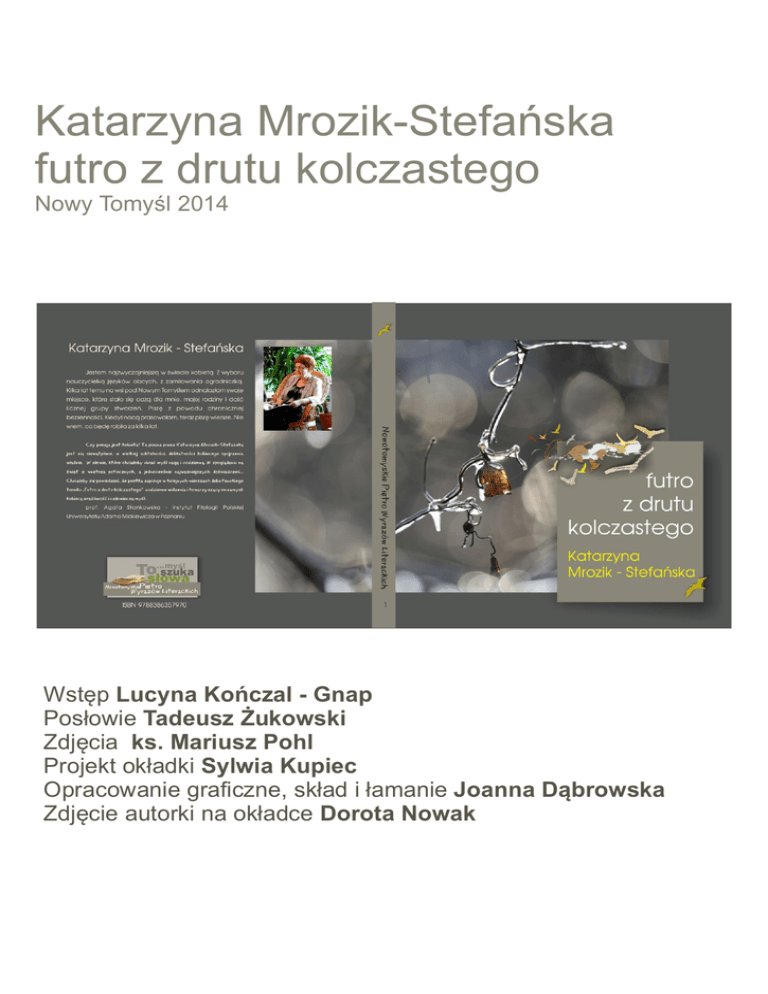 Katarzyna Mrozik-Stefańska futro z drutu kolczastego Nowy Tomyśl 2014 Wstęp Lucyna Kończal - Gnap Posłowie Tadeusz Żukowski Zdjęcia ks. Mariusz Pohl Projekt okładki Sylwia Kupiec Opracowanie graficzne, skład i łamanie Joanna Dąbrowska Zdjęcie autorki na okładce Dorota Nowak