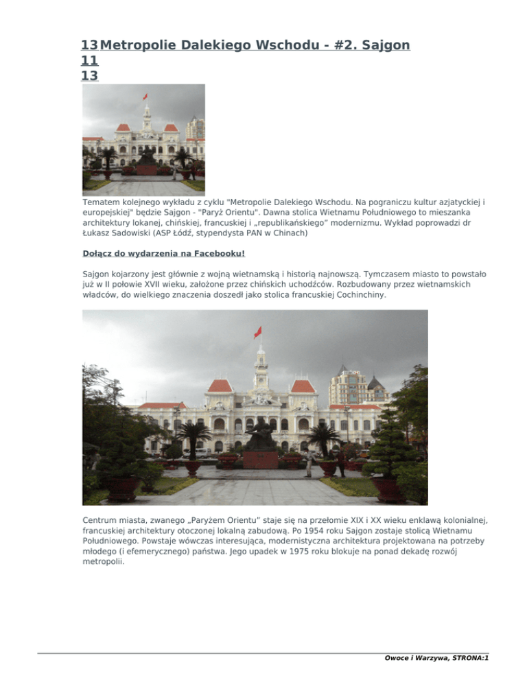 13 Metropolie Dalekiego Wschodu - #2. Sajgon 11 13 Tematem kolejnego wykładu z cyklu "Metropolie Dalekiego Wschodu. Na pograniczu kultur azjatyckiej i europejskiej" będzie Sajgon - "Paryż Orientu". Dawna stolica Wietnamu Południowego to mieszanka architektury lokanej, chińskiej, francuskiej i „republikańskiego” modernizmu. Wykład poprowadzi dr Łukasz Sadowiski (ASP Łódź, stypendysta PAN w Chinach) Dołącz do wydarzenia na Facebooku! Sajgon kojarzony jest głównie z wojną wietnamską i historią najnowszą. Tymczasem miasto to powstało już w II połowie XVII wieku, założone przez chińskich uchodźców. Rozbudowany przez wietnamskich władców, do wielkiego znaczenia doszedł jako stolica francuskiej Cochinchiny. Centrum miasta, zwanego „Paryżem Orientu” staje się na przełomie XIX i XX wieku enklawą kolonialnej, francuskiej architektury otoczonej lokalną zabudową. Po 1954 roku Sajgon zostaje stolicą Wietnamu Południowego. Powstaje wówczas interesująca, modernistyczna architektura projektowana na potrzeby młodego (i efemerycznego) państwa. Jego upadek w 1975 roku blokuje na ponad dekadę rozwój metropolii. Owoce i Warzywa, STRONA:1 W chwili obecnej Sajgon (a właściwie od 1976 Ho Chi Minh) to jedna z dynamiczniej rozwijających się azjatyckich aglomeracji z nowoczesną architekturą. Tematyka wykładu skupiać się będzie na tym co pozostało z epoki kolonialnej, oraz jakim przekształceniom uległo miasto przez ostatnie trzy stulecia. Mimo burzliwej historii dzisiejszy Sajgon to fascynująca mieszanka architektury rodzimej, chińskiej, francuskiej, oraz „międzynarodowej” z okresu republiki. __ Metropolie Dalekiego Wschodu. Na pograniczu kultur azjatyckiej i europejskiej - #2. Sajgon środa | 13.11 | godz. 18:00 Owoce i Warzywa | Traugutta 9 | Łódź prowadzenie: Łukasz Sadowski wstęp wolny Owoce i Warzywa, STRONA:2