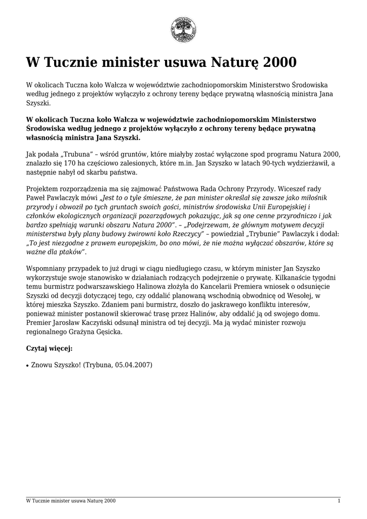 W Tucznie minister usuwa Naturę 2000 W okolicach Tuczna koło Wałcza w województwie zachodniopomorskim Ministerstwo Środowiska według jednego z projektów wyłączyło z ochrony tereny będące prywatną własnością ministra Jana Szyszki. W okolicach Tuczna koło Wałcza w województwie zachodniopomorskim Ministerstwo Środowiska według jednego z projektów wyłączyło z ochrony tereny będące prywatną własnością ministra Jana Szyszki. Jak podała „Trubuna” – wśród gruntów, które miałyby zostać wyłączone spod programu Natura 2000, znalazło się 170 ha częściowo zalesionych, które m.in. Jan Szyszko w latach 90-tych wydzierżawił, a następnie nabył od skarbu państwa. Projektem rozporządzenia ma się zajmować Państwowa Rada Ochrony Przyrody. Wiceszef rady Paweł Pawlaczyk mówi „Jest to o tyle śmieszne, że pan minister określał się zawsze jako miłośnik przyrody i obwoził po tych gruntach swoich gości, ministrów środowiska Unii Europejskiej i członków ekologicznych organizacji pozarządowych pokazując, jak są one cenne przyrodniczo i jak bardzo spełniają warunki obszaru Natura 2000”. – „Podejrzewam, że głównym motywem decyzji ministerstwa były plany budowy żwirowni koło Rzeczycy” – powiedział „Trybunie” Pawlaczyk i dodał: „To jest niezgodne z prawem europejskim, bo ono mówi, że nie można wyłączać obszarów, które są ważne dla ptaków”. Wspomniany przypadek to już drugi w ciągu niedługiego czasu, w którym minister Jan Szyszko wykorzystuje swoje stanowisko w działaniach rodzących podejrzenie o prywatę. Kilkanaście tygodni temu burmistrz podwarszawskiego Halinowa złożyła do Kancelarii Premiera wniosek o odsunięcie Szyszki od decyzji dotyczącej tego, czy oddalić planowaną wschodnią obwodnicę od Wesołej, w której mieszka Szyszko. Zdaniem pani burmistrz, doszło do jaskrawego konfliktu interesów, ponieważ minister postanowił skierować trasę przez Halinów, aby oddalić ją od swojego domu. Premier Jarosław Kaczyński odsunął ministra od tej decyzji. Ma ją wydać minister rozwoju regionalnego Grażyna Gęsicka. Czytaj więcej: ● Znowu Szyszko! (Trybuna, 05.04.2007) W Tucznie minister usuwa Naturę 2000 1