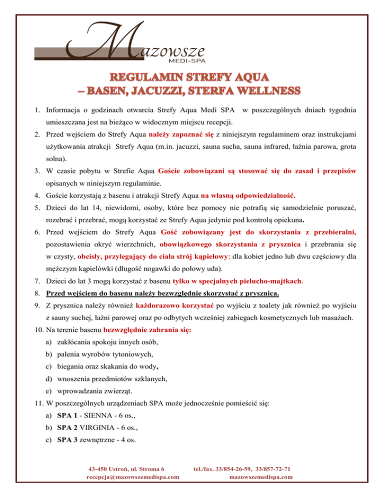 1. Informacja o godzinach otwarcia Strefy Aqua Medi SPA w poszczególnych dniach tygodnia umieszczana jest na bieżąco w widocznym miejscu recepcji. 2. Przed wejściem do Strefy Aqua należy zapoznać się z niniejszym regulaminem oraz instrukcjami użytkowania atrakcji Strefy Aqua (m.in. jacuzzi, sauna sucha, sauna infrared, łaźnia parowa, grota solna). 3. W czasie pobytu w Strefie Aqua Goście zobowiązani są stosować się do zasad i przepisów opisanych w niniejszym regulaminie. 4. Goście korzystają z basenu i atrakcji Strefy Aqua na własną odpowiedzialność. 5. Dzieci do lat 14, niewidomi, osoby, które bez pomocy nie potrafią się samodzielnie poruszać, rozebrać i przebrać, mogą korzystać ze Strefy Aqua jedynie pod kontrolą opiekuna. 6. Przed wejściem do Strefy Aqua Gość zobowiązany jest do skorzystania z przebieralni, pozostawienia okryć wierzchnich, obowiązkowego skorzystania z prysznica i przebrania się w czysty, obcisły, przylegający do ciała strój kąpielowy: dla kobiet jedno lub dwu częściowy dla mężczyzn kąpielówki (długość nogawki do połowy uda). 7. Dzieci do lat 3 mogą korzystać z basenu tylko w specjalnych pielucho-majtkach. 8. Przed wejściem do basenu należy bezwzględnie skorzystać z prysznica. 9. Z prysznica należy również każdorazowo korzystać po wyjściu z toalety jak również po wyjściu z sauny suchej, łaźni parowej oraz po odbytych wcześniej zabiegach kosmetycznych lub masażach. 10. Na terenie basenu bezwzględnie zabrania się: a) zakłócania spokoju innych osób, b) palenia wyrobów tytoniowych, c) biegania oraz skakania do wody, d) wnoszenia przedmiotów szklanych, e) wprowadzania zwierząt. 11. W poszczególnych urządzeniach SPA może jednocześnie pomieścić się: a) SPA 1 - SIENNA - 6 os., b) SPA 2 VIRGINIA - 6 os., c) SPA 3 zewnętrzne - 4 os. 43-450 Ustroń, ul. Stroma 6 [email protected] tel./fax. 33/854-26-59, 33/857-72-71 mazowszemedispa.com 12. Ze Strefy Aqua nie wolno korzystać osobom, które: a) nie posiadają odpowiedniego stroju kąpielowego, b) są w stanie wskazującym na nadmierne spożycie alkoholu lub innych środków odurzających, c) są w złym stanie zdrowia, który może stanowić zagrożenie dla nich lub dla innych, d) posiadają nie zagojone rany lub choroby skóry, cierpią na choroby zakaźne czy nieestetycznie wyglądające wysypki skórne, mają widoczne rany otwarte. 13. W trosce o zapewnienie czystości wody, zasad higieny i bezpieczeństwa, a co za tym idzie dbając o komfort Gości korzystających ze Strefy Aqua, zainstalowany został monitoring wizyjny z trwałym i ciągłym zapisem obrazu. Materiał filmowy może być użyty jako dowód rzeczowy. Mazowsze Medi SPA oświadcza, iż monitoring prowadzony jest w sposób nie naruszający godności i dóbr osobistych Gości. 14. Osoba, która celowo lub mimowolnie zanieczyściła basen (potrzeby fizjologiczne itp.), uszkodziła sprzęt lub urządzenia będzie obciążona kosztami szkody. W przypadku dzieci odpowiedzialność poniesie opiekun prawny dziecka. 15. Osoby starsze, kobiety w ciąży, osoby mające kłopoty zdrowotne (w tym między innymi osoby z nadciśnieniem tętniczym) nie powinny korzystać z sauny suchej oraz łaźni parowej. Przebywając w odrębnych pomieszczeniach sauny należy pamiętać o różnicy temperatur i bezwzględnie być świadomym stanu swojego zdrowia. 16. Prosimy o nie wnoszenie na teren basenu urządzeń mogących ulec uszkodzeniu (komórki, zegarki itp.) oraz elementów o ostrych krawędziach mogących stanowić zagrożenie (biżuteria). Zaleca się pozostawianie cennych przedmiotów w domu lub w recepcji. Za rzeczy zaginione obsługa nie ponosi odpowiedzialności. 17. Goście przebywający na terenie basenu proszeni są o podporządkowanie się poleceniom obsługi obiektu. Niezastosowanie się do niniejszego regulaminu lub do poleceń obsługi obiektu może skutkować wyproszeniem z basenu. 18. Użytkownicy korzystają z urządzeń, sprzętu i atrakcji Strefy Aqua na własne ryzyko. Hotel nie ponosi odpowiedzialności za wypadki zaistniałe wskutek czynników od niego niezależnych, za zdarzenia losowe oraz za braki, które nie były dostrzegalne pomimo dbałości o stan obiektu. Wejście na teren Strefy Aqua jest równoznaczne z akceptacją regulaminu. 43-450 Ustroń, ul. Stroma 6 [email protected] tel./fax. 33/854-26-59, 33/857-72-71 mazowszemedispa.com