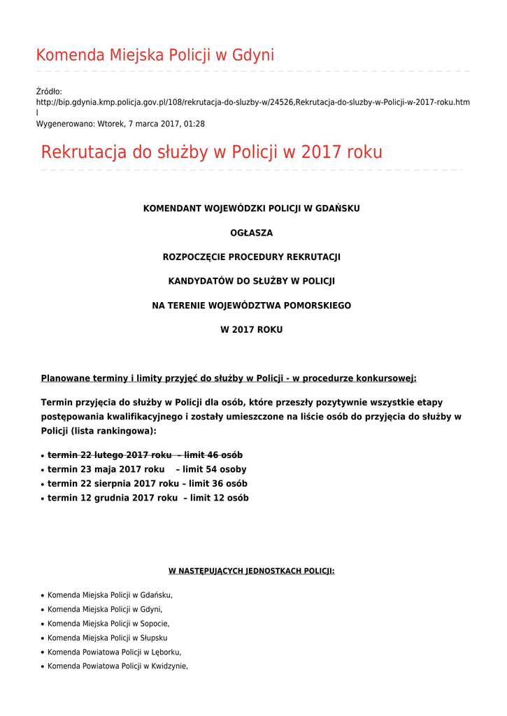 Komenda Miejska Policji w Gdyni Źródło: http://bip.gdynia.kmp.policja.gov.pl/108/rekrutacja-do-sluzby-w/24526,Rekrutacja-do-sluzby-w-Policji-w-2017-roku.htm l Wygenerowano: Wtorek, 7 marca 2017, 01:28 Rekrutacja do służby w Policji w 2017 roku KOMENDANT WOJEWÓDZKI POLICJI W GDAŃSKU OGŁASZA ROZPOCZĘCIE PROCEDURY REKRUTACJI KANDYDATÓW DO SŁUŻBY W POLICJI NA TERENIE WOJEWÓDZTWA POMORSKIEGO W 2017 ROKU Planowane terminy i limity przyjęć do służby w Policji - w procedurze konkursowej: Termin przyjęcia do służby w Policji dla osób, które przeszły pozytywnie wszystkie etapy postępowania kwalifikacyjnego i zostały umieszczone na liście osób do przyjęcia do służby w Policji (lista rankingowa): ● termin 22 lutego 2017 roku – limit 46 osób ● termin 23 maja 2017 roku ● termin 22 sierpnia 2017 roku – limit 36 osób ● termin 12 grudnia 2017 roku – limit 12 osób – limit 54 osoby W NASTĘPUJĄCYCH JEDNOSTKACH POLICJI: ● Komenda Miejska Policji w Gdańsku, ● Komenda Miejska Policji w Gdyni, ● Komenda Miejska Policji w Sopocie, ● Komenda Miejska Policji w Słupsku ● Komenda Powiatowa Policji w Lęborku, ● Komenda Powiatowa Policji w Kwidzynie, ● Komenda Powiatowa Policji w Starogardzie Gdańskim, ● Komenda Powiatowa Policji w Sztumie, ● Komenda Powiatowa Policji w Chojnicach, ● Komenda Powiatowa Policji w Człuchowie, ● Komenda Powiatowa Policji w Malborku, ● Komenda Powiatowa Policji w Wejherowie, ● Komenda Powiatowa Policji w Tczewie, ● Komenda Powiatowa Policji w Pruszczu Gdańskim, ● Komenda Powiatowa Policji w Bytowie, ● Komenda Powiatowa Policji w Pucku, ● Komenda Powiatowa Policji w Kościerzynie, ● Komenda Powiatowa Policji w Kartuzach, ● Komenda Powiatowa Policji w Nowym Dworze Gdańskim, ● Oddział Prewencji Policji w Gdańsku. Zobacz też: Informator dla kandydatów do Policji Metryczka Data publikacji 16.12.2016 Data modyfikacji 23.02.2017 Rejestr zmian Podmiot udostępniający informację: Biuletyn Informacji Publicznej Osoba wytwarzająca/odpowiadająca za informację: Osoba udostępniająca informację: Jozdowska-Tyrlik Edyta Komenda Miejska Policji w Gdyni Osoba modyfikująca informację: Jozdowska-Tyrlik Edyta