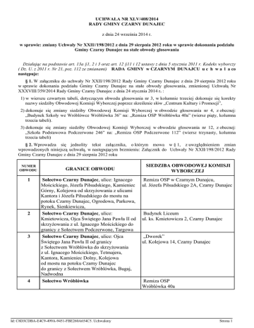 UCHWAŁA NR XLV/408/2014 RADY GMINY CZARNY DUNAJEC z dnia 24 września 2014 r. w sprawie: zmiany Uchwały Nr XXII//198/2012 z dnia 29 sierpnia 2012 roku w sprawie dokonania podziału Gminy Czarny Dunajec na stałe obwody głosowania Działając na podstawie art. 13a §1, 2 i 3 oraz art. 12 §11 i 12 ustawy z dnia 5 stycznia 2011 r. Kodeks wyborczy ( Dz. U. z 2011 r. Nr 21, poz. 112 ze zmianami) RADA GMINY w CZARNYM DUNAJCU u c h w a l a co następuje: § 1. W załączniku do uchwały Nr XXII/198/2012 Rady Gminy Czarny Dunajec z dnia 29 sierpnia 2012 roku w sprawie dokonania podziału Gminy Czarny Dunajec na stałe obwody głosowania, zmienionej Uchwałą Nr XXXVIII/359/2014 Rady Gminy Czarny Dunajec z dnia 24 stycznia 2014 r. : 1) w wierszu czwartym tabeli, dotyczącym obwodu głosowania nr 3, w kolumnie trzeciej dokonuje się korekty nazwy siedziby Obwodowej Komisji Wyborczej poprzez skreślenie słów „Centrum Kultury i Promocji”, 2) dokonuje się zmiany siedziby Obwodowej Komisji Wyborczej w obwodzie głosowania nr 4, z obecnej: „Budynek Szkoły we Wróblówce Wróblówka 36” na: „Remiza OSP Wróblówka 40a” (wiersz piąty, kolumna trzecia tabeli). 3) dokonuje się zmiany siedziby Obwodowej Komisji Wyborczej w obwodzie głosowania nr 12, z obecnej: „Szkoła Podstawowa Podczerwone 246” na: „Remiza OSP Podczerwone 112” (wiersz trzynasty, kolumna trzecia tabeli) § 2. Wprowadza się jednolity tekst załącznika, o którym mowa w § 1, z uwzględnieniem zmian wprowadzonych niniejszą uchwałą, w następującym brzmieniu: Załącznik do Uchwały Nr XXII/198/2012 Rady Gminy Czarny Dunajec z dnia 29 sierpnia 2012 roku NUMER OBWODU 1 2 3 4 GRANICE OBWODU Sołectwo Czarny Dunajec, ulice: Ignacego Mościckiego, Józefa Piłsudskiego, Kamieniec Górny, Kolejowa od skrzyżowania z ulicami Kantora i Józefa Piłsudskiego do mostu na potoku Czarny Dunajec, Ogrodowa, Parkowa, Rynek, Sienkiewicza, Sołectwo Czarny Dunajec, ulice: Kmietowicza, Ojca Świętego Jana Pawła II od skrzyżowania z ul. Ignacego Mościckiego do granicy z Sołectwem Podczerwone, Targowa Sołectwo Czarny Dunajec, ulice: Ojca Świętego Jana Pawła II od granicy z Sołectwem Wróblówka do skrzyżowania z ul. Ignacego Mościckiego, Tetmajera, Kantora, Kamieniec Dolny, Kolejowa od mostu na potoku Czarny Dunajec do granicy z Sołectwem Wróblówka, Bugaj, Nadwodna Sołectwo Wróblówka Id: C8D3CDBA-E4C9-499A-9451-FBE260A654C5. Uchwalony SIEDZIBA OBWODOWEJ KOMISJI WYBORCZEJ Remiza OSP w Czarnym Dunajcu, ul. Józefa Piłsudskiego 2A, Czarny Dunajec Budynek Liceum ul. ks. Kmietowicza 2, Czarny Dunajec „Dworek” ul. Kolejowa 14, Czarny Dunajec Remiza OSP Wróblówka 40a Strona 1 5 Sołectwo Pieniążkowice Szkoła Podstawowa Pieniążkowice 142 6 Sołectwo Dział Szkoła Podstawowa Dział 9 7 Sołectwo Odrowąż Szkoła Podstawowa Odrowąż 41 8 Sołectwo Załuczne Gimnazjum Załuczne 84A 9 Sołectwo Podszkle Szkoła Podstawowa Podszkle 47 10 Sołectwo Piekielnik od nr 1 do nr 205 Ośrodek Zdrowia Piekielnik 129c 11 Sołectwo Piekielnik od nr 206 do końca 12 Sołectwo Podczerwone Zespół Szkół Podstawowej i Gimnazjum Piekielnik 202 Remiza OSP Podczerwone 112 13 Sołectwo Koniówka Remiza OSP Koniówka 215c 14 Sołectwo Chochołów Szkoła Podstawowa Chochołów 184B 15 Sołectwo Ciche od nr 1 do nr 194 Szkoła Podstawowa Nr1 Ciche 152 16 Sołectwo Ciche od nr 195 do nr 449 Remiza OSP (Ciche środkowe) Ciche 343B 17 Sołectwo Ciche od nr 450 do końca Szkoła Podstawowa Nr 3 Ciche 611A 18 Sołectwo Ratułów od nr 1 do nr 173 Remiza OSP (Ratułów dolny) Ratułów 110c 19 Sołectwo Ratułów od nr 174 do końca Remiza OSP (Ratułów górny) Ratułów 252a 20 Sołectwo Czerwienne od nr 1 do nr 170 Szkoła Podstawowa Nr 1 Czerwienne 89 21 Sołectwo Czerwienne od nr 171 do końca 22 Sołectwo Stare Bystre od nr 1 do nr 229 23 Sołectwo Stare Bystre od nr 230 do końca Katolickie Gimnazjum i Szkoła Podstawowa Stowarzyszenia Przyjaciół Szkół Katolickich Czerwienne 245 Szkoła Podstawowa Nr 2 Stowarzyszenia Przyjaciół Szkół Katolickich Stare Bystre124 Szkoła Podstawowa Nr 1 i Gimnazjum Stowarzyszenia Przyjaciół Szkół Katolickich Stare Bystre 347 § 3. Uchwała podlega przekazaniu Wojewodzie Małopolskiemu i Komisarzowi Wyborczemu w Nowym Sączu. Id: C8D3CDBA-E4C9-499A-9451-FBE260A654C5. Uchwalony Strona 2 § 4. Wykonanie uchwały powierza się Wójtowi Gminy Czarny Dunajec. § 5. Uchwała podlega ogłoszeniu w Dzienniku Urzędowym Województwa Małopolskiego oraz na tablicach ogłoszeń w Urzędzie Gminy oraz BIP Urzędu Gminy i wchodzi w życie po upływie 14 dni od dnia ogłoszenia. Przewodnicząca Rady Gminy Beata Anna Palenik Id: C8D3CDBA-E4C9-499A-9451-FBE260A654C5. Uchwalony Strona 3 Uzasadnienie Zgodnie z art. 13a §1 i 2 ustawy z dnia 5 stycznia 2011 r. Kodeks wyborczy Wójt może przedłożyć radzie gminy wnioski w sprawie zmian siedzib obwodowych komisji wyborczych natomiast zmian siedzib obwodowych komisji wyborczych dokonuje się najpóźniej w 45 dniu przed dniem wyborów. Wójt przedkładając wniosek w przedmiotowej sprawie oraz projekt zamiany Uchwały Nr XXII//198/2012 z dnia 29 sierpnia 2012 roku w sprawie dokonania podziału Gminy Czarny Dunajec na stałe obwody głosowania przedstawił stosowne uzasadnienie. Zmiany zawarte w uchwale są podyktowane: 1) w przypadku zmiany dokonanej w § 1 pkt 1 ma ona charakter porządkujący, a jej celem jest doprecyzowanie zapisów Uchwały Nr XXII//198/2012 w zakresie uaktualnienia nazwy siedziby Obwodowej Komisji Wyborczej w obwodzie głosownia nr 2 („Dworek” pod adresem ul. Kolejowa 14, Czarny Dunajec nie stanowi już obecnie siedziby Centrum Kultury i Promocji). 2) w przypadku zmiany dokonanej w § 1 pkt 2 ma ona na celu ustalenie nowej siedziby dla jednej z komisji obwodowych – Obwodowej Komisji Wyborczej dla Obwodu nr 4 obejmującego miejscowość Wróblówka. Dotychczasowa siedziba – Budynek Szkoły we Wróblówce Wróblówka 36 