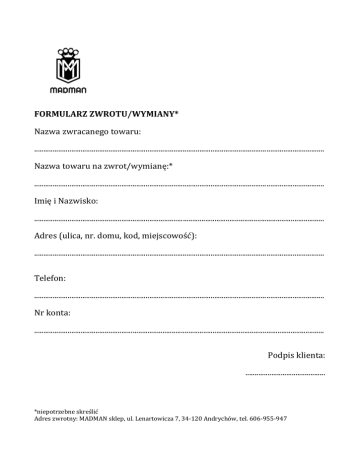 FORMULARZ ZWROTU/WYMIANY* Nazwa zwracanego towaru: ............................................................................................................................................................ Nazwa towaru na zwrot/wymianę:* ............................................................................................................................................................ Imię i Nazwisko: ............................................................................................................................................................ Adres (ulica, nr. domu, kod, miejscowość): ............................................................................................................................................................ Telefon: ............................................................................................................................................................ Nr konta: ............................................................................................................................................................ Podpis klienta: ........................................... *niepotrzebne skreślić Adres zwrotny: MADMAN sklep, ul. Lenartowicza 7, 34-120 Andrychów, tel. 606-955-947