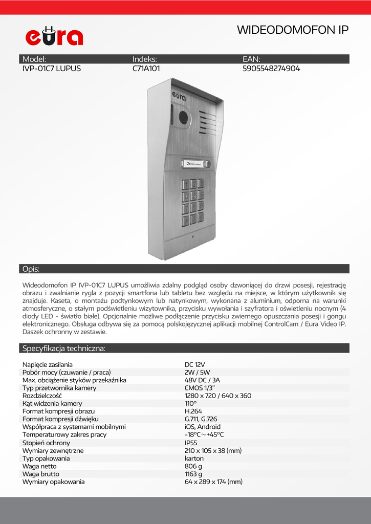 WIDEODOMOFON IP Model: IVP-01C7 LUPUS Indeks: C71A101 EAN: 5905548274904 Opis: Wideodomofon IP IVP-01C7 LUPUS umożliwia zdalny podgląd osoby dzwoniącej do drzwi posesji, rejestrację obrazu i zwalnianie rygla z pozycji smartfona lub tabletu bez względu na miejsce, w którym użytkownik się znajduje. Kaseta, o montażu podtynkowym lub natynkowym, wykonana z aluminium, odporna na warunki atmosferyczne, o stałym podświetleniu wizytownika, przycisku wywołania i szyfratora i oświetleniu nocnym (4 diody LED - światło białe). Opcjonalnie możliwe podłączenie przycisku zwiernego opuszczania posesji i gongu elektronicznego. Obsługa odbywa się za pomocą polskojęzycznej aplikacji mobilnej ControlCam / Eura Video IP. Daszek ochronny w zestawie. Specyfikacja techniczna: Napięcie zasilania Pobór mocy (czuwanie / praca) Max. obciążenie styków przekaźnika Typ przetwornika kamery Rozdzielczość Kąt widzenia kamery Format kompresji obrazu Format kompresji dźwięku Współpraca z systemami mobilnymi Temperaturowy zakres pracy Stopień ochrony Wymiary zewnętrzne Typ opakowania Waga netto Waga brutto Wymiary opakowania DC 12V 2W / 5W 48V DC / 3A CMOS 1/3'' 1280 x 720 / 640 x 360 110° H.264 G.711, G.726 iOS, Android -18°C~+45°C IP55 210 x 105 x 38 (mm) karton 806 g 1163 g 64 x 289 x 174 (mm)