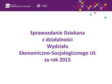 Sprawozdanie Dziekana z działalności Wydziału Ekonomiczno-Socjologicznego UŁ za rok 2015 I. Struktura organizacyjna Wydziału Zmiana ilości jednostek Wydziału Ekonomiczno-Socjologicznego w roku 2012 i 2015 Instytuty Katedry Zakłady Katedry nie wchodzące w skład instytutów RAZEM katedry i zakłady 2012 7 33 10 2015 7 36 6 3 46 2 44 Nowe jednostki administracyjne powstałe w latach 2012-2015 • • • • Sekcja Współpracy z Zagranicą Sekcja Projektów Wydziałowych Centrum Szkoleń i Praktyk Zawodowych Interdyscyplinarne Centrum Studiów Miejskich Zmiana w strukturze liczby pracowników Wydziału wg. poszczególnych kategorii, lata 2012-2015 2012 2015 liczba osób liczba osób • nauczyciele akademiccy 415 osób 396 osób pracownicy nie będący nauczycielami akademickimi, w tym: • naukowo-techniczni 38 osób 37 osób • pracownicy biblioteczni 12 osób 12 osób • administracyjni 70 osób 62 osób • pracownicy obsługi 21 osób 19 osób RAZEM 556 osób 526 osób Zmiana w strukturze etatów pracowników Wydziału wg. poszczególnych kategorii, lata 2012-2015 2012 2015 liczba etatów liczba etatów • nauczyciele akademiccy 400,33 etatów 386,50 etatów pracownicy nie będący nauczycielami akademickimi, w tym: • naukowo-techniczni 34,50 etatów 34,75 etatów • pracownicy biblioteczni 12 etatów 12 etatów • administracyjni 64,75 etatów 58,75 etatów • pracownicy obsługi 21 etatów 18,50 etatów RAZEM 532,58 etatów 510,50 etatów Zmiana w strukturze nauczycieli akademickich według kategorii zatrudnienia (wg. stanowisk) 2012-2015 2012 Kategoria zatrudnienia 2015 osoby etaty osoby etaty liczba % liczba % liczba % liczba % Profesor zwyczajny 39 9,4 37,58 9,4 31 7,83 31 8,02 Profesor nadzwyczajny 55 13,3 52,75 13,2 57 14,39 56,5 14,62 186 44,8 182,5 45,6 Adiunkt, w tym adiunkt naukowy* Asystent, 193 1* 83 48,74 1* 78,5 49,03 93 22,4 87 21,7 St. wykładowca 42 10,1 40,5 10,1 32 8,08 31 8,02 Razem 415 100 400,33 100 396 100 386,5 100 w tym asystent naukowy* * etaty finansowane z grantów naukowych (NCN) 6* 20,96 189,50 5,5* 20,31 II. Działalność naukowa a. finansowanie badań naukowych Dotacje podmiotowe Wydziału Ekonomiczno-Socjologicznego UŁ w latach 2012-2015 Działalność statutowa (w zł) Dotacja celowa na zadania służące rozwojowi młodych naukowców Liczba grantów MNiSW Liczba grantów NCN realizowanych, w tym : - granty pracowników, - granty doktorantów Łącznie środki uzyskane z tytułu grantów MNiSW i NCN (w zł) Liczba grantów zagranicznych Restrukturyzacja 2012 r. 2013 r. 2014 r. 2015r. 2 751 650 2 227 110 1 948 090 1 650 940 282 490 275 290 266 230 289 750 - 6* inne niż NCN 35 32 3 36 32 4 25 19 15 4 14 27 24 3 1 762 330 2 975 241,66 2 430 821 2 918 479,26 10 6 3 3 198 000 0 94 800 95 500 W 2016 roku otrzymaliśmy 1 739 540 zł dotacji statutowej Dotacja podmiotowa W 2015 roku Wydział otrzymał dotację podmiotową na dofinansowanie zadań projakościowych w wysokości 664 100 zł. Powyższa dotacja wiązała się ze spełnieniem dwóch warunków: • posiadania kategorii naukowej A lub A+, • prowadzenia kierunku studiów, który otrzymał oceną wyróżniającą Polskiej Komisji Akredytacyjnej. Wymienione dwa warunki spełniło zaledwie 20 jednostek organizacyjnych w całym kraju. W przypadku Wydziału Ekonomiczno-Socjologicznego UŁ kierunkiem, który otrzymał ocenę wyróżniającą PKA był kierunek informatyka i ekonometria. Kwota dotacji została podzielona w proporcji ½ dla potrzeb Instytutów opiekujących się kierunkiem Informatyka i ekonometria, ½ na cele ogólnowydziałowe. Dotacje podmiotowe – rok 2015, porównanie Wydziałów DZIAŁALNOŚĆ STATUTOWA w 2015r. WYDZIAŁ Kategoria DOTACJA NA UTRZYMANIE POTENCJAŁU BADAWCZEGO KWOTA BiOŚ CH E-S FL F-H F i IS Mat. i Inf. NG NoW PiA SM i P ZARZ. UŁ A A A B B A B B B A* B A 2 482 790 1 068 990 1 650 940 1 269 480 527 850 637 390 320 840 467 910 467 420 490 810 250 380 490 750 10 125 550 DOTACJA CELOWA DLA MŁODYCH NAUKOWCÓW LICZBA TEMATÓW 82 8 59 33 50+22 styp. 6 25 13 3 19 10 15 323+22 styp. KWOTA 630 390 163 770 289 750 210 580 191 540 127 240 50 260 92 420 6 880 160 850 37 040 127 490 2 088 210 RESTRUKTURYZACJA/ Specjalne Urządzenie Badawcze KWOTA 95 500 104 200 199 700 RAZEM KWOTA 3 113 180 1 232 760 2 036 190 1 584 260 719 390 764 630 371 100 560 330 474 300 651 660 287 420 618 240 12 413 460 * decyzją z dnia 16.12.2015r. Minister Nauki i Szkolnictwa Wyższego przyznał Wydziałowi Prawa i Administracji kategorię naukową A Środki finansowe na działalność naukowo-badawczą poza dotacjami w latach 2012-2015 PROJEKTY NPRH Narodowy Program Rozwoju Humanistyki PROJEKTY BADAWCZE SPRZEDAŻ USŁUG NAUK. - BAD. LICZBA KWOTA LICZBA KWOTA LICZBA KWOTA KWOTA E-S 2012 40 1 762 325 2 149 396 3* 103 659* 2 015 380 E-S 2013 40 2 152 726 2 77 691 1 315 456 2 545 873 E-S 2014 41 2 227 813 5 261 504 1 235 328 2 724 645 E-S 2015 37 2 530 653 2 103 818 1 249 772 2 884 243 RAZEM WYDZIAŁ * Granty Urzędu Miasta Łodzi Środki finansowe na działalność naukowo-badawczą poza dotacjami - rok 2015, porównanie Wydziałów PROJEKTY BADAWCZE NCN SPRZEDAŻ USŁUG NAUK. - BAD. PROJEKTY NPRH Narodowy Program Rozwoju Humanistyki RAZEM WYDZIAŁ LICZBA KWOTA LICZBA KWOTA LICZBA KWOTA KWOTA BiOŚ 48 4 023 959 15 647 630 0 0 4 671 589 CH E-S FL FH F iIS MiI NG NoW PiA SMiP Zarz. 29 37 12 11 5 4 10 1 11 11 6 3 790 647 2 530 653 732 426 329 540 470 379 114 920 396 966 28 340 457 859 345 196 320 047 124 811 103 818 0 0 5 285 0 0 0 0 0 20 698 0 1 7 3 0 0 0 0 0 0 0 0 249 772 329 822 470 792 0 0 0 0 0 0 0 3 915 458 2 884 243 1 062 248 805 617 470 379 114 920 396 966 28 340 457 859 345 196 340 745 1 8 2 0 1 1 0 0 0 0 0 2 2 95 420 (Centrum Transferu Technologii) 10 500 1 (OBIWWŁR) 15 324 121 244 13 636 352 31 912 742 12 1 065 710 15 614 804 Pozostałe jednostki UŁ (Ceraneum) 186 Wyniki konkursów NCN rozstrzygniętych w latach 2012-2015 Wydział EkonomicznoSocjologiczny UŁ Wnioski złożo