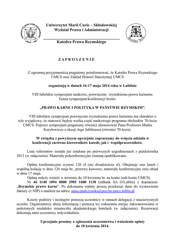 Uniwersytet Marii Curie – Skłodowskiej Wydział Prawa i Administracji Katedra Prawa Rzymskiego ZAPR O S ZE N I E Z ogromną przyjemnością pragniemy poinformować, że Katedra Prawa Rzymskiego UMCS oraz Zakład Historii Starożytnej UMCS organizują w dniach 16-17 maja 2014 roku w Lublinie VIII lubelskie sympozjum naukowe, poświęcone rzymskiemu prawu karnemu. Temat sympozjum/konferencji brzmi: „PRAWO KARNE I POLITYKA W PAŃSTWIE RZYMSKIM”. VIII lubelskie sympozjum poświęcone rzymskiemu prawu karnemu ma charakter o tyle wyjątkowy, że stanowić będzie ważką część naukowego programu obchodów 70-lecia UMCS. Poprzez sympozjum pragniemy również uhonorować Pana Profesora Marka Kuryłowicza z okazji Jego Jubileuszu (również 70-lecia). W związku z powyższym uprzejmie zapraszamy do wzięcia udziału w konferencji zarówno kierowników katedr, jak i współpracowników. Lista referentów została już ustalona po pierwszych uzgodnieniach z października 2013 (w załączeniu). Materiały pokonferencyjne zostaną opublikowane. Opłata konferencyjna wynosi 120 zł (sto dwadzieścia zl). Obejmuje ona lunch i wspólną kolację w dniu 126 maja br., przerwy kawowe, materiały konferencyjne oraz obiad w dniu 17 maja. Opłatę należy wnieść w terminie do 10 kwietnia br. na konto (sub konto UMCS) Nr 46 1140 1094 0000 2905 1600 1138 (mBank SA O/Lublin) z dopiskiem: „Rzymskie prawo karne”. Po dokonaniu wpłaty proszę przekazać dane do wystawienia faktury (z NIP) e-mailem na adres: [email protected] Koszty podróży i noclegów ponoszą uczestnicy w ramach delegacji z macierzystych uczelni. Organizatorzy służą informacją i pomocą we wskazaniu miejsc zakwaterowania w położonych niedaleko miasteczka akademickiego hotelach (w załączeniu). Rezerwacji dokonują sami uczestnicy indywidualnie. Uprzejmie prosimy o zgłoszenia uczestnictwa i wniesienie opłaty do 10 kwietnia 2014. Ramowy program konferencji obejmuje: 16 maja 2014 (piątek): Rozpoczęcie konferencji oraz wystąpienia jubileuszowe od godz. 11.00 w siedzibie Lubelskiego Towarzystwa Naukowego, Plac Litewski 2. Lunch o godz. 13.00 (tamże). Obrady konferencyjne (referaty) od godz. 15.30 w budynku Wydziału Prawa i Administracji UMCS, Plac Marii Curie-Skłodowskiej 5 (sala 202). wspólna kolacja uczestników w restauracji hotelu „Huzar” od godz. 19.30. 17 maja 2014 (sobota): Obrady konferencyjne od godz. 9.30 w budynku Wydziału Prawa i Administracji UMCS, Plac Marii Curie-Skłodowskiej 5 (sala 202). Zakończenie konferencji ok. 13.30. Ok. godz. 14-tej obiad w Iuris Club w tymże budynku. Ewentualne uwagi i pytania należy kierować pod adresami: [email protected] oraz [email protected] Z wyrazami szacunku i pozdrowieniami: Lublin, 3 marca 2014 r. Dr hab. Krzysztof Amielańczyk, Prof. nadzw.UMCS Załączniki: I. Wystąpienia jubileuszowe: Ks. prof. Antoni Dębiński Prof. Krzysztof Amielańczyk Prof. Marek Kuryłowicz II. Referaty (w kolejności alfabetycznej): 1. Krzysztof Amielańczyk, Prawo karne i polityka. Czy rzymscy prawodawcy prowadzili ukierunkowaną politykę karną? 2. Andrzej Chmiel, Proces katylinarczyków jako przykład rzymskiego „procesu politycznego”. 3. Marzena Dyjakowska, Aulus Gellius, Noctes Atticae 4,14 czyli o prawnokarnych granicach ochrony godności urzędniczej. 4. Maciej Jońca, Telum manu fugit. Uwagi na temat nieumyślności w Dekrecie Gracjana 5. Henryk Kowalski, Polityka a prawo karne. Ustawodawstwo karne cesarza Augusta na tle wydarzeń w latach 22-18 p.n.e. 6. Piotr Niczyporuk, Represje karne stosowane wobec bankierów rzymskich (nummularii). 7. Anna Pawłowska, Sposoby wykonania kary śmierci: polityka czy "fantazja" cesarska ? 8. Anna Pikulska-Radomska, "... A kiedy pieniędzy publicznych na to nie wystarczało…”. Uwagi o karaniu lichwiarstwa w rzymskiej republice. 9. Bronisław Sitek, Pozycja prawna advocatus fisci. 10. Dariusz Słapek, Instrumentum vocale czyli o niezwykłych negocjacjach władz rzymskich z... niewolnikami Antoniusza. 11. Renata Świrgoń – Skok, Polityczne aspekty ustaw karnych cesarza Justyniana w sprawach religijnych. 12. Anna Tarwacka, Jak się zemścić na cenzorach? Zakres odpowiedzialności karnej strażników moralności. 13. Jacek Wiewiorowski, CTh 9.14.1 = C. 9.16.7 (a. 374) – pierwszy dziejowy zakaz dzieciobójstwa? 14. Jan Zabłocki, Iudicis et amici officium salvare’. Na marginesie Gell. 1.3. III. Hotele Hotel Huzar ul. Spadochroniarzy 9 81 533 05 36 Hotel Młyn Aleje Racławickie 23a, 81 536 70 20 Hotel Mercure Centrum Aleje Racławickie 12 81 533 20 61 Hotel Campanile ul. Lubomelska 14 81 531 84 00 Hotel Victoria ul. Narutowicza 58/60 81 532 70 11