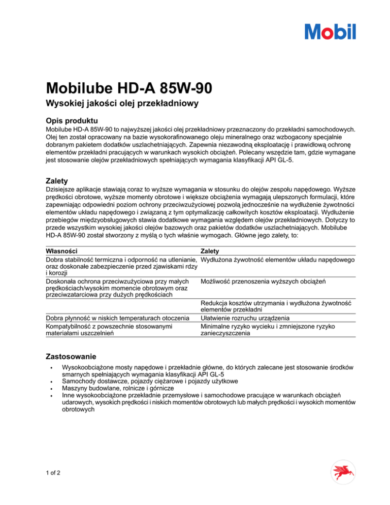 Mobilube HD-A 85W-90 Wysokiej jakości olej przekładniowy Opis produktu Mobilube HD-A 85W-90 to najwyższej jakości olej przekładniowy przeznaczony do przekładni samochodowych. Olej ten został opracowany na bazie wysokorafinowanego oleju mineralnego oraz wzbogacony specjalnie dobranym pakietem dodatków uszlachetniających. Zapewnia niezawodną eksploatację i prawidłową ochronę elementów przekładni pracujących w warunkach wysokich obciążeń. Polecany wszędzie tam, gdzie wymagane jest stosowanie olejów przekładniowych spełniających wymagania klasyfikacji API GL-5. Zalety Dzisiejsze aplikacje stawiają coraz to wyższe wymagania w stosunku do olejów zespołu napędowego. Wyższe prędkości obrotowe, wyższe momenty obrotowe i większe obciążenia wymagają ulepszonych formulacji, które zapewniając odpowiedni poziom ochrony przeciwzużyciowej pozwolą jednocześnie na wydłużenie żywotności elementów układu napędowego i związaną z tym optymalizację całkowitych kosztów eksploatacji. Wydłużenie przebiegów międzyobsługowych stawia dodatkowe wymagania względem olejów przekładniowych. Dotyczy to przede wszystkim wysokiej jakości olejów bazowych oraz pakietów dodatków uszlachetniających. Mobilube HD-A 85W-90 został stworzony z myślą o tych właśnie wymogach. Główne jego zalety, to: Własności Zalety Dobra stabilność termiczna i odporność na utlenianie, Wydłużona żywotność elementów układu napędowego oraz doskonałe zabezpieczenie przed zjawiskami rdzy i korozji Doskonała ochrona przeciwzużyciowa przy małych Możliwość przenoszenia wyższych obciążeń prędkościach/wysokim momencie obrotowym oraz przeciwzatarciowa przy dużych prędkościach Redukcja kosztów utrzymania i wydłużona żywotność elementów przekładni Dobra płynność w niskich temperaturach otoczenia Ułatwienie rozruchu urządzenia Kompatybilność z powszechnie stosowanymi Minimalne ryzyko wycieku i zmniejszone ryzyko materiałami uszczelnień zanieczyszczenia Zastosowanie • • • • 1 of 2 Wysokoobciążone mosty napędowe i przekładnie główne, do których zalecane jest stosowanie środków smarnych spełniających wymagania klasyfikacji API GL-5 Samochody dostawcze, pojazdy ciężarowe i pojazdy użytkowe Maszyny budowlane, rolnicze i górnicze Inne wysokoobciążone przekładnie przemysłowe i samochodowe pracujące w warunkach obciążeń udarowych, wysokich prędkości i niskich momentów obrotowych lub małych prędkości i wysokich momentów obrotowych Specyfikacje Mobilube HD-A 85W-90 spełnia wymagania poniższych specyfikacji: API GL-5 Mobilube HD-A 85W-90 posiada następujące dopuszczenia producentów: Daimler Chrysler MB 235.0 ZF-TE-ML 05A/07A/12A/16C/17B MAN 342 Type N Typowa charakterystyka fizykochemiczna Mobilube HD-A 85W-90 Klasa Lepkości SAE Lepkość kin., ASTM D 445 [cSt] w 40ºC [cSt] w 100ºC Wskaźnik lepkości, [-], ASTM D 2270 Temp. płynięcia, [ºC], ASTM D 97 Temp. zapłonu, [ºC], ASTM D 92 Ciężar właściwy w 15ºC [kg/l], ASTM D 4052 85W-90 184 17.0 99 -24 222 0.90 Informacje na temat: przechowywania, zdrowia, bezpieczeństwa i środowiska Wszelkie opakowania z produktem powinny być przechowywane w zadaszonych pomieszczeniach. Jeżeli beczki przechowuje się na otwartej przestrzeni, gdzie mogą być narażone na opady atmosferyczne, należy je ustawić w pozycji poziomej, tak aby uniemożliwić dostęp wody oraz zapobiec zniszczeniu oznakowania beczek. Produkty nie mogą być przechowywane w temperaturze wyższej niż 60ºC, ani też narażone na działanie promieni słonecznych lub bardzo niskich temperatur. Bazując na wszystkich dostępnych informacjach produkt nie powinien powodować negatywnego wpływu na zdrowie ludzkie, w przypadkach kiedy stosowany jest zgodnie ze swoim przeznaczeniem. Informacje, oraz instrukcje dotyczące bezpiecznego stosowania produktu zawarte są Katcie Bezpieczeństwa produktu. Produkt nie powinien być stosowany niezgodnie ze swoim przeznaczeniem. Utylizując produkt postępuj tak by chronić środowisko naturalne. Logo Mobil, nazwa Mobilube HD-A, a także wizerunek Biegnącego Pegaza są zarejestrowanymi znakami handlowymi organizacji należących do Exxon Mobil Corporation. Smary i środki specjalne firmy ExxonMobil Nie wszystkie produkty mogą być lokalnie dostępne. Więcej informacji można uzyskać w lokalnym punkcie sprzedaży lub pod adresem www.exxonmobil.com W skałd firmy ExxonMobil wchodzą liczne firmy stowarzyszone i podległe. W nazwach wielu z nich znajduje się Esso, Mobil lub ExxonMobil. Żadne informacje zawarte w niniejszym dokumencie nie nie mają na celu zmainy lub pominięcia faktu koropracyjnej odrębności lokalnych jednostek. Wszelką odpowiedzialność, również za lokalnie podejmowane działania, ponoszą jednostki stowarzyszone z ExxonMobil. Ze względu na nieustannie prowadzone działania w zakresie badawczo-rozwojowym, informacje tu zamieszczone mogą ulec zmianie bez uprzedniego powiadomienia. Typowe właściwości mogą się nieco różnić. © 2001 Exxon Mobil Corporation. Wszystkie prawa zastrzeżone. 2 of 2