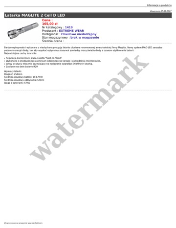 Informacje o produkcie Utworzono 07-03-2017 Latarka MAGLITE 2 Cell D LED Cena : 165,00 zł Nr katalogowy : 1419 Producent : EXTREME WEAR Dostępność : Chwilowo niedostępny Stan magazynowy : brak w magazynie Średnia ocena : Bardzo wytrzymała i wykonana z niesłychaną precyzją latarka diodowa renomowanej amerykańskiej firmy Maglite. Nowy system MAG-LED zarządza poborem energii diody, tak aby uzyskać optymalny stosunek pomiędzy mocą światła diody a czasem użytkowania baterii. Najważniejsze cechy latarki to: ● ● ● Regulacja koncentracji słupa światła "Spot-to-Flood", Wykonana z anodowanego aluminium odpornego na korozję i uszkodzenia mechaniczne, Łatwy w użyciu włącznik pozwalający na nadawanie sygnałów świetlnych latarką, Zasilanie na dwie baterie R20 w at Wymiary latarki: Długość: 254mm Średnica obudowy baterii: 39.67mm Średnica obudowy odbłyśnika: 57mm Waga z bateriami: 674g er m ar k ● Wygenerowano w programie www.oscGold.com