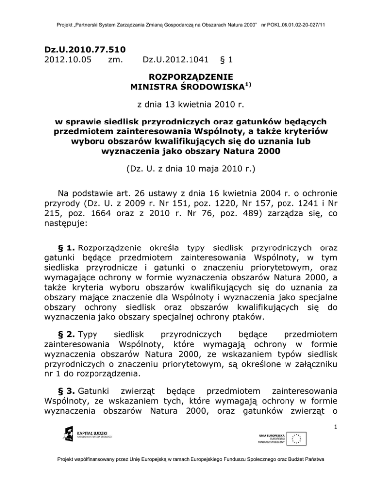 Projekt „Partnerski System Zarządzania Zmianą Gospodarczą na Obszarach Natura 2000” nr POKL.08.01.02-20-027/11 Dz.U.2010.77.510 2012.10.05 zm. Dz.U.2012.1041 §1 ROZPORZĄDZENIE MINISTRA ŚRODOWISKA1) z dnia 13 kwietnia 2010 r. w sprawie siedlisk przyrodniczych oraz gatunków będących przedmiotem zainteresowania Wspólnoty, a także kryteriów wyboru obszarów kwalifikujących się do uznania lub wyznaczenia jako obszary Natura 2000 (Dz. U. z dnia 10 maja 2010 r.) Na podstawie art. 26 ustawy z dnia 16 kwietnia 2004 r. o ochronie przyrody (Dz. U. z 2009 r. Nr 151, poz. 1220, Nr 157, poz. 1241 i Nr 215, poz. 1664 oraz z 2010 r. Nr 76, poz. 489) zarządza się, co następuje: § 1. Rozporządzenie określa typy siedlisk przyrodniczych oraz gatunki będące przedmiotem zainteresowania Wspólnoty, w tym siedliska przyrodnicze i gatunki o znaczeniu priorytetowym, oraz wymagające ochrony w formie wyznaczenia obszarów Natura 2000, a także kryteria wyboru obszarów kwalifikujących się do uznania za obszary mające znaczenie dla Wspólnoty i wyznaczenia jako specjalne obszary ochrony siedlisk oraz obszarów kwalifikujących się do wyznaczenia jako obszary specjalnej ochrony ptaków. § 2. Typy siedlisk przyrodniczych będące przedmiotem zainteresowania Wspólnoty, które wymagają ochrony w formie wyznaczenia obszarów Natura 2000, ze wskazaniem typów siedlisk przyrodniczych o znaczeniu priorytetowym, są określone w załączniku nr 1 do rozporządzenia. § 3. Gatunki zwierząt będące przedmiotem zainteresowania Wspólnoty, ze wskazaniem tych, które wymagają ochrony w formie wyznaczenia obszarów Natura 2000, oraz gatunków zwierząt o 1 Projekt współfinansowany przez Unię Europejską w ramach Europejskiego Funduszu Społecznego oraz Budżet Państwa Projekt „Partnerski System Zarządzania Zmianą Gospodarczą na Obszarach Natura 2000” nr POKL.08.01.02-20-027/11 znaczeniu priorytetowym, rozporządzenia. są określone w załączniku nr 2 do § 4. Gatunki roślin będące przedmiotem zainteresowania Wspólnoty, ze wskazaniem tych, które wymagają ochrony w formie wyznaczenia obszarów Natura 2000, oraz gatunków roślin o znaczeniu priorytetowym, są określone w załączniku nr 3 do rozporządzenia. § 5. Kryteria wyboru obszarów kwalifikujących się do uznania za obszary mające znaczenie dla Wspólnoty i wyznaczenia jako specjalne obszary ochrony siedlisk Natura 2000 są następujące: 1) występowanie typu siedliska przyrodniczego wymienionego w załączniku nr 1 do rozporządzenia, uwzględniając: a) priorytetowe znaczenie typu siedliska przyrodniczego, b) zachowanie pełnej zmienności danego typu siedliska przyrodniczego, c) wielkości krajowych zasobów typu siedliska przyrodniczego i ich rozmieszczenia, d) podatność typu siedliska przyrodniczego na proces degradacji, e) znaczenie obszaru Natura 2000 dla zachowania typu siedliska przyrodniczego w kraju, uwzględniając: – stopień reprezentatywności i wykształcenia siedliska przyrodniczego na obszarze, – powierzchnię zajmowaną przez siedlisko przyrodnicze na obszarze w stosunku do całkowitej powierzchni tego typu siedliska przyrodniczego na obszarze kraju, – stan zachowania struktury i funkcji siedliska przyrodniczego na obszarze lub możliwość jego renaturyzacji, – istniejące i potencjalne zagrożenia powodujące utratę wartości przyrodniczych siedliska; 2) występowanie gatunków wymienionych w załącznikach nr 2 i 3 do rozporządzenia, uwzględniając: a) priorytetowe znaczenie gatunku, b) rozmieszczenie gatunku na obszarze kraju, c) znaczenie obszaru dla zachowania gatunków roślin i zwierząt w kraju, uwzględniając: – wielkość i zagęszczenie lokalnej populacji gatunku w stosunku do populacji krajowej, 2 Projekt współfinansowany przez Unię Europejską w ramach Europejskiego Funduszu Społecznego oraz Budżet Państwa Projekt „Partnerski System Zarządzania Zmianą Gospodarczą na Obszarach Natura 2000” nr POKL.08.01.02-20-027/11 – stan zachowania cech siedliska ważnych dla gatunku oraz możliwość renaturyzacji zdegradowanych siedlisk gatunku, – stopień izolacji lokalnej populacji gatunku w stosunku do naturalnego zasięgu gatunku, – istniejące i potencjalne zagrożenia dla lokalnej populacji gatunku i jego siedliska powodujące utratę ich wartości przyrodniczych, d) znaczenie obszaru dla przemieszczania się gatunków, uwzględniając jego: – położenie na trasie wędrówek innych gatunków niż wymienione w załącznikach nr 2 i 3 do rozporządzenia, – funkcjonowanie jako korytarza ekologicznego łączącego inne obszary istotne dla ochrony siedlisk gatunków, w szczególności gatunków priorytetowych, wymienionych w załącznikach nr 2 i 3 do rozporządzenia; 3) powierzchnia obszaru, która powinna umożliwiać skuteczne i trwałe zachowanie siedlisk przyrodniczych i gatunków, dla których ochrony ten obszar się wyznacza, przy czym: a) w odniesieniu do siedlisk przyrodniczych wymienionych w załączniku nr 1 do rozporządzenia powierzchnia ta powinna obejmować reprezentatywne występowanie wszystkich stwierdzonych na obszarze siedlisk przyrodniczych, b) w odniesieniu do gatunków wymienionych w załącznikach nr 2 i 3 do rozporządzenia powierzchnia powinna obejmować całą przestrzeń życiową stabilnych, rozmnażających się lokalnych populacji tych gatunków lub kluczowe dla ich ochrony miejsca występowania, w szczególności miejsca rozrodu, żerowiska, zimowiska i miejsca odpoczynku także w czasie migracji; 4) współwystępowanie typów siedlisk przyrodniczych i gatunków wymienionych w załącznikach do rozporządzenia; 5) powiązanie obszaru z innymi obszarami ważnymi dla ochrony siedlisk gatunków i siedlisk przyrodniczych wymienionych w załączniku nr 1 do rozporządzenia, w szczególności z innymi obszarami Natura 2000 lub innymi formami ochrony przyrody. § 6. Kryteria wyboru obszarów kwalifikujących się do wyznaczenia jak
