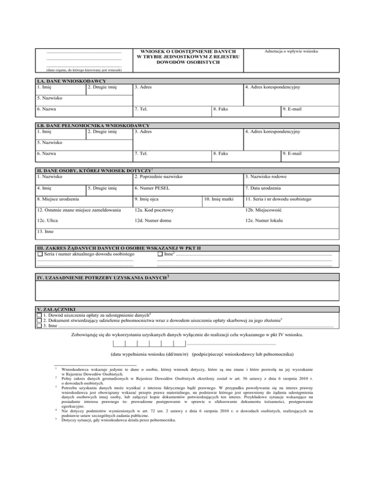 ............................................................ WNIOSEK O UDOSTĘPNIENIE DANYCH W TRYBIE JEDNOSTKOWYM Z REJESTRU DOWODÓW OSOBISTYCH ............................................................ ............................................................ Adnotacja o wpływie wniosku (dane organu, do którego kierowany jest wniosek) I.A. DANE WNIOSKODAWCY 1. Imię 2. Drugie imię 3. Adres 4. Adres korespondencyjny 5. Nazwisko 6. Nazwa 7. Tel. 8. Faks I.B. DANE PEŁNOMOCNIKA WNIOSKODAWCY 3. Adres 1. Imię 2. Drugie imię 9. E-mail 4. Adres korespondencyjny 5. Nazwisko 6. Nazwa 7. Tel. 8. Faks 9. E-mail II. DANE OSOBY, KTÓREJ WNIOSEK DOTYCZY1 1. Nazwisko 2. Poprzednie nazwisko 3. Nazwisko rodowe 4. Imię 7. Data urodzenia 5. Drugie imię 6. Numer PESEL 8. Miejsce urodzenia 9. Imię ojca 10. Imię matki 11. Seria i nr dowodu osobistego 12. Ostatnie znane miejsce zameldowania 12a. Kod pocztowy 12b. Miejscowość 12c. Ulica 12d. Numer domu 12e. Numer lokalu 13. Inne III. ZAKRES ŻĄDANYCH DANYCH O OSOBIE WSKAZANEJ W PKT II Seria i numer aktualnego dowodu osobistego Inne2 ............................................................................................................................. ............................................................................. ............................................................................................................................................ ............................................................................. ............................................................................................................................................ IV. UZASADNIENIE POTRZEBY UZYSKANIA DANYCH3 V. ZAŁĄCZNIKI 1. Dowód uiszczenia opłaty za udostępnienie danych4 2. Dokument stwierdzający udzielenie pełnomocnictwa wraz z dowodem uiszczenia opłaty skarbowej za jego złożenie5 3. Inne ............................................................................................................................................................................................................................ Zobowiązuję się do wykorzystania uzyskanych danych wyłącznie do realizacji celu wykazanego w pkt IV wniosku. ....................................................................... (data wypełnienia wniosku (dd/mm/rr) (podpis/pieczęć wnioskodawcy lub pełnomocnika) ______________________ 1 2 3 4 5 Wnioskodawca wskazuje jedynie te dane o osobie, której wniosek dotyczy, które są mu znane i które pozwolą na jej wyszukanie w Rejestrze Dowodów Osobistych. Pełny zakres danych gromadzonych w Rejestrze Dowodów Osobistych określony został w art. 56 ustawy z dnia 6 sierpnia 2010 r. o dowodach osobistych. Potrzeba uzyskania danych może wynikać z interesu faktycznego bądź prawnego. W przypadku powoływania się na interes prawny wnioskodawca jest obowiązany wskazać przepis prawa materialnego, na podstawie którego jest uprawniony do żądania udostępnienia danych osobowych innej osoby, lub załączyć kopie dokumentów potwierdzających ten interes. Przykładowe sytuacje wskazujące na posiadanie interesu prawnego to: prowadzone postępowanie w sprawie o sfałszowanie dokumentu tożsamości, postępowanie egzekucyjne. Nie dotyczy podmiotów wymienionych w art. 72 ust. 2 ustawy z dnia 6 sierpnia 2010 r. o dowodach osobistych, realizujących na podstawie ustaw szczególnych zadania publiczne. Dotyczy sytuacji, gdy wnioskodawca działa przez pełnomocnika.