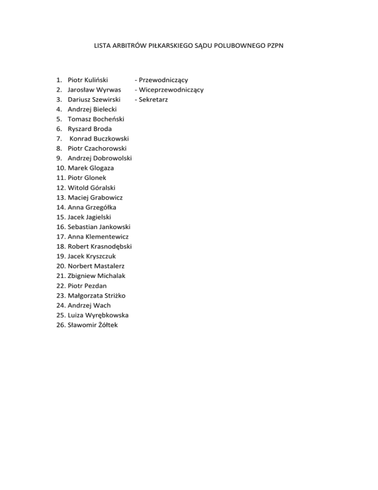 LISTA ARBITRÓW PIŁKARSKIEGO SĄDU POLUBOWNEGO PZPN 1. Piotr Kuliński - Przewodniczący 2. Jarosław Wyrwas - Wiceprzewodniczący 3. Dariusz Szewirski - Sekretarz 4. Andrzej Bielecki 5. Tomasz Bocheński 6. Ryszard Broda 7. Konrad Buczkowski 8. Piotr Czachorowski 9. Andrzej Dobrowolski 10. Marek Glogaza 11. Piotr Glonek 12. Witold Góralski 13. Maciej Grabowicz 14. Anna Grzegółka 15. Jacek Jagielski 16. Sebastian Jankowski 17. Anna Klementewicz 18. Robert Krasnodębski 19. Jacek Kryszczuk 20. Norbert Mastalerz 21. Zbigniew Michalak 22. Piotr Pezdan 23. Małgorzata Striżko 24. Andrzej Wach 25. Luiza Wyrębkowska 26. Sławomir Żółtek