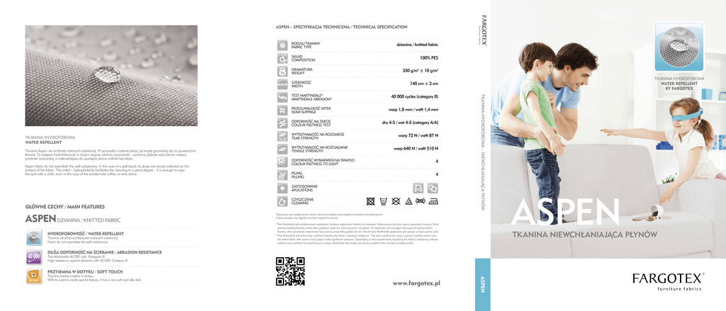 ASPEN – SPECYFIKACJA TECHNICZNA / TECHNICAL SPECIFICATION RODZAJ TKANINY FABRIC TYPE dzianina / knitted fabric SKŁAD COMPOSITION 100% PES GRAMATURA WEIGHT 330 g/m2 ± 10 g/m2 SZEROKOŚĆ WIDTH Tkanina Aspen nie wchłania rozlanych substancji. W przypadku rozlanej cieczy, jej krople gromadzą się na powierzchni tkaniny. Ta wstępna hydrofobowość w dużym stopniu ułatwia czyszczenie – wystarczy jedynie zabrudzone miejsce przetrzeć ściereczką, a najtrudniejsza do usunięcia plama zniknie bez śladu. Aspen fabric do not assimilate the spilt substances. In the case of a spilt liquid, its drops are simply collected on the surface of the fabric. This initial – hydrophobicity facilitates the cleaning to a great degree – it is enough to wipe the spot with a cloth, even in the case of the problematic coffee or wine stains. 140 cm ± 2 cm TEST MARTINDALE* MARTINDALE ABRASION* 40 000 cycles (category B) PRZESUWALNOŚĆ NITEK SEAM SLIPPAGE warp 1,8 mm / weft 1,4 mm ODPORNOŚĆ NA TARCIE COLOUR FASTNESS TEST dry 4-5 / wet 4-5 (category A/A) WYTRZYMAŁOŚĆ NA ROZDARCIE TEAR STRENGTH WYTRZYMAŁOŚĆ NA ROZCIĄGANIE TENSILE STRENGTH warp 72 N / weft 87 N warp 640 N / weft 510 N ODPORNOŚĆ WYBARWIEŃ NA ŚWIATŁO COLOUR FASTNESS TO LIGHT 4 PILING PILLING 4 ZASTOSOWANIE APLICATIONS GŁÓWNE CECHY / MAIN FEATURES ASPEN DZIANINA / KNITTED FABRIC HYDROFOBOWOŚĆ / WATER REPELLENT Tkanina utrudnia wchłanianie rozlanych substancji. Fabric do not assimilate the spilt substances. CZYSZCZENIE CLEANING TKANINA HYDROFOBOWA – NIEWCHŁANIAJĄCA PŁYNÓW TKANINA HYDROFOBOWA WATER REPELLENT TKANINA HYDROFOBOWA WATER REPELLENT BY FARGOTEX Dopuszcza się występowanie różnic odcieni pomiędzy poszczególnymi partiami produkcyjnymi. Colour shades may slightly vary from dye-lot to dye-lot. *Test Martindale jest podstawowym sposobem badania odporności tkaniny na ścieranie. Wykonywany jest przy użyciu specjalnej maszyny, która pociera badaną tkaninę wełną albo papierem ściernym pod znacznym naciskiem. W zależności od wymagań dotyczących wytrzymałości tkaniny, silne pocieranie może trwać bez przerwy przez kilka godzin lub dni. Wynik testu Martindale podawany jest zawsze w ilości suwów-cykli. *The Martindale test is the basic method of testing the fabric’s abrasion resistance. The test is performed using a special machine which rubs the tested fabric with wool or sand paper under significant pressure. Depending on the requirements regarding the fabric’s resistance, intense rubbing may continue for several hours or days. Martindale test results are always quoted in the number of stroke-cycles. TKANINA NIEWCHŁANIAJĄCA PŁYNÓW DUŻA ODPORNOŚĆ NA ŚCIERANIE / ABRASION RESISTANCE Test Martindale 40 000 cykli. Kategoria B. High resistance against abrasion with 40 000. Category B. PRZYJEMNA W DOTYKU / SOFT TOUCH ASPEN Tkanina bardzo miękka w dotyku. With its custom-made special texture, it has a very soft and silky feel. ASPEN ASPEN 04 light grey ASPEN 01 white ASPEN 02 beige vanille ASPEN 07 navy blue ASPEN 08 graphit ASPEN 03 cold beige ASPEN 04 light grey ASPEN 09 grey ASPEN 10 stone ASPEN 05 turquise ASPEN 15 raspberry ASPEN 11 brown ASPEN 12 dark grey ASPEN 14 yellow ASPEN 06 lavender ASPEN 13 black