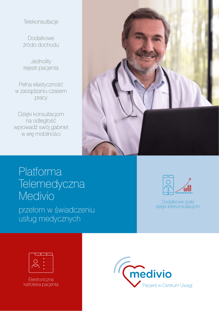 Telekonsultacje Dodatkowe źródo dochodu Jednolity rejestr pacjenta Pełna elastyczność w zarządzaniu czasem pracy Dzięki konsultacjom na odległość wprowadź swój gabinet w erę mobilności Platforma Telemedyczna Medivio przełom w świadczeniu usług medycznych Elektroniczna kartoteka pacjenta Dodatkowe zyski dzięki telekonsultacjom Pacjent w Centrum Uwagi Bezpieczeństwo i skuteczność procesowa Pacjent w Centrum Uwagi Platforma Telemedyczna Medivio – korzyści dla Lekarza: dodatkowe zyski dzięki prowadzeniu telekonsultacji w dowolnie zdefiniowanym czasie i miejscu szybki dostęp do dokumentacji pacjenta oraz współdzielenie kartotek pacjentów wgląd w wyniki badań pomiarowych pacjenta pełna elastyczność w zarządzaniu swoim czasem pracy poprawa efektywności prowadzonej terapii poprzez stały nadzór nad przyjmowaniem leków przez pacjentów – compliance lekowy Centrum Kształcenia Telemedycznego MEDIVIO – szkolenia stacjonarne i mobilne dla lekarzy spersonalizowane szablony wywiadów z pacjentem Platforma Telemedyczna Medivio – wyrób medyczny (certyfikat , ISO 13485) Telemedycyna Silvermedia Sp. z o.o. ul. Jana Pawła II 3a, 37-500 Jarosław e-mail: [email protected], TeleCentrum: 800 123 456 www.medivio.pl Optymalizacja czasu pracy lekarza
