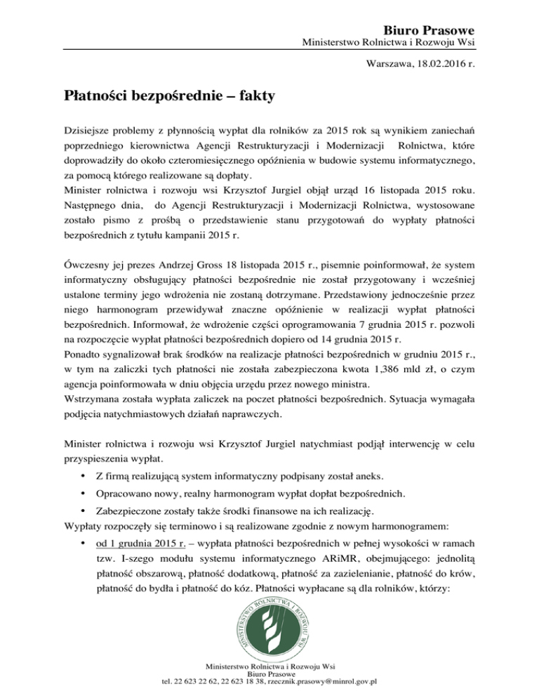 Biuro Prasowe Ministerstwo Rolnictwa i Rozwoju Wsi Warszawa, 18.02.2016 r. Płatności bezpośrednie – fakty Dzisiejsze problemy z płynnością wypłat dla rolników za 2015 rok są wynikiem zaniechań poprzedniego kierownictwa Agencji Restrukturyzacji i Modernizacji Rolnictwa, które doprowadziły do około czteromiesięcznego opóźnienia w budowie systemu informatycznego, za pomocą którego realizowane są dopłaty. Minister rolnictwa i rozwoju wsi Krzysztof Jurgiel objął urząd 16 listopada 2015 roku. Następnego dnia, do Agencji Restrukturyzacji i Modernizacji Rolnictwa, wystosowane zostało pismo z prośbą o przedstawienie stanu przygotowań do wypłaty płatności bezpośrednich z tytułu kampanii 2015 r. Ówczesny jej prezes Andrzej Gross 18 listopada 2015 r., pisemnie poinformował, że system informatyczny obsługujący płatności bezpośrednie nie został przygotowany i wcześniej ustalone terminy jego wdrożenia nie zostaną dotrzymane. Przedstawiony jednocześnie przez niego harmonogram przewidywał znaczne opóźnienie w realizacji wypłat płatności bezpośrednich. Informował, że wdrożenie części oprogramowania 7 grudnia 2015 r. pozwoli na rozpoczęcie wypłat płatności bezpośrednich dopiero od 14 grudnia 2015 r. Ponadto sygnalizował brak środków na realizacje płatności bezpośrednich w grudniu 2015 r., w tym na zaliczki tych płatności nie została zabezpieczona kwota 1,386 mld zł, o czym agencja poinformowała w dniu objęcia urzędu przez nowego ministra. Wstrzymana została wypłata zaliczek na poczet płatności bezpośrednich. Sytuacja wymagała podjęcia natychmiastowych działań naprawczych. Minister rolnictwa i rozwoju wsi Krzysztof Jurgiel natychmiast podjął interwencję w celu przyspieszenia wypłat. • Z firmą realizującą system informatyczny podpisany został aneks. • Opracowano nowy, realny harmonogram wypłat dopłat bezpośrednich. • Zabezpieczone zostały także środki finansowe na ich realizację. Wypłaty rozpoczęły się terminowo i są realizowane zgodnie z nowym harmonogramem: • od 1 grudnia 2015 r. – wypłata płatności bezpośrednich w pełnej wysokości w ramach tzw. I-szego modułu systemu informatycznego ARiMR, obejmującego: jednolitą płatność obszarową, płatność dodatkową, płatność za zazielenianie, płatność do krów, płatność do bydła i płatność do kóz. Płatności wypłacane są dla rolników, którzy: Ministerstwo Rolnictwa i Rozwoju Wsi Biuro Prasowe tel. 22 623 22 62, 22 623 18 38, [email protected] Biuro Prasowe Ministerstwo Rolnictwa i Rozwoju Wsi 1) nie są objęci dyscypliną finansową, a więc otrzymują płatności w kwocie do 2 tys. euro (8 489,60 zł), 2) nie są objęci kontrolą na miejscu, oraz 3) nie mają pomniejszonych płatności (np. z tytułu złożenia wniosku po terminie, złożenia zmian do wniosków, przedeklarowania powierzchni). • od 26.01.2016 r. są dodatkowo realizowane płatności do roślin wysokobiałkowych oraz płatności do owoców miękkich, dla rolników, którzy posiadają gospodarstwa do 15 ha gruntów ornych i spełniają wymogi dywersyfikacji upraw, a we wnioskach nie zostały stwierdzone błędy (nieprawidłowości). Płatności są też realizowane dla gospodarstw o powierzchni ponad 15 ha gruntów ornych, jeżeli rolnicy są zwolnieni z obowiązku realizacji praktyki dywersyfikacji upraw i utrzymania obszarów proekologicznych. Wdrożona również została funkcjonalność umożliwiająca naliczanie dyscypliny finansowej. W celu przyspieszenia realizacji płatności w dniu 5 lutego 2016 r. nowe kierownictwo ARiMR zawarło kolejny aneks do umowy z wykonawcą systemu informatycznego Agencji, zgodnie z którym wdrażanie poszczególnych modułów w tym systemie jest realizowane w następujących terminach: • 8 lutego br. – wdrożenie funkcjonalności umożliwiającej naliczanie płatności dla następujących schematów pomocowych: płatność do buraków cukrowych, płatność do ziemniaków skrobiowych, płatność dla młodych rolników, płatność do tytoniu, płatność do chmielu, płatność do lnu, płatność do pomidorów. • 15 lutego br. – wdrożenie funkcjonalności manualnej kontroli administracyjnej z wyłączeniem wniosków podlegających sankcjonowaniu (z tytułu przedeklarowania powierzchni, złożenia wniosku po terminie) oraz z wyłączeniem płatności do owiec oraz płatności do konopi włóknistych. Ponadto planowane jest wdrożenie następnych modułów w terminach: • 22 lutego br. – wdrożenie w pełnym zakresie kontroli administracyjnej spraw obszarowych oraz naliczania płatności obszarowych. • 11 kwietnia br. – wdrożenie funkcjonalności umożliwiającej kontrolę administracyjną oraz naliczanie płatności dla rolników podlegających kontroli na miejscu, u których stwierdzono nieprawidłowości oraz rolników podlegających obowiązkowi utrzymania obszarów proekologicznych. W kampanii 2015 wnioski o przyznanie płatności bezpośrednich złożyło 1,355 mln rolników. Ministerstwo Rolnictwa i Rozwoju Wsi Biuro Prasowe tel. 22 623 22 62, 22 623 18 38, [email protected] Biuro Prasowe Ministerstwo Rolnictwa i Rozwoju Wsi Do 16 lutego br. 785 836 rolników, czyli blisko 58% otrzymało płatności bezpośrednie. Natomiast 1 072 051 rolników (prawie 80% uprawnionych) otrzymało zaliczki (50% należnej sumy) na poczet płatności bezpośrednich. Zmiany kadrowe w ARiMR dotyczyły kilku procent zatrudnionych i spowodowane były m.in. brakiem przygotowania agencji do realizacji nowego systemu płatności bezpośrednich w kampanii 2015 roku. MRiRW niezwłocznie przedstawi raport z funkcjonowania ARiMR za rządów poprzedniej koalicji PO-PSL. Ministerstwo Rolnictwa i Rozwoju Wsi Biuro Prasowe tel. 22 623 22 62, 22 623 18 38, [email protected]