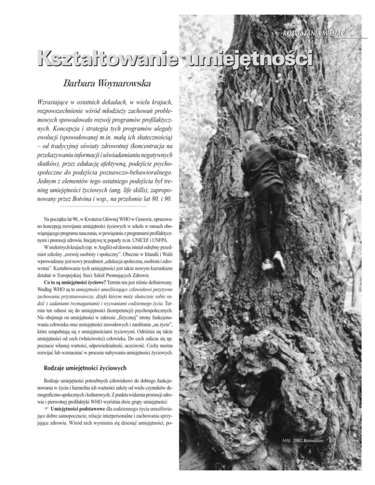 ROZWA¯ANIA ROZWA¯ANIAMIESI¥CA MIESI¥CA Kszta³towanie umiejêtnoci Barbara Woynarowska Wzrastaj¹ce w ostatnich dekadach, w wielu krajach, rozpowszechnienie wród m³odzie¿y zachowañ problemowych spowodowa³o rozwój programów profilaktycznych. Koncepcja i strategia tych programów ulega³y ewolucji (spowodowanej m.in. ma³¹ ich skutecznoci¹) od tradycyjnej owiaty zdrowotnej (koncentracja na przekazywaniu informacji i uwiadamianiu negatywnych skutków), przez edukacjê afektywn¹, podejcie psychospo³eczne do podejcia poznawczo-behawioralnego. Jednym z elementów tego ostatniego podejcia by³ trening umiejêtnoci ¿yciowych (ang. life skills), zaproponowany przez Botvina i wsp., na prze³omie lat 80. i 90. Na pocz¹tku lat 90., w Kwaterze G³ównej WHO w Genewie, opracowano koncepcjê rozwijania umiejêtnoci ¿yciowych w szkole w ramach obowi¹zuj¹cego programu nauczania, w powi¹zaniu z programami profilaktycznymi i promocji zdrowia. Inicjatywê tê popar³y m.in. UNICEF i UNFPA. W niektórych krajach (np. w Anglii) od dawna istnia³ odrêbny przedmiot szkolny rozwój osobisty i spo³eczny. Obecnie w Irlandii i Walii wprowadzany jest nowy przedmiot edukacja spo³eczna, osobista i zdrowotna. Kszta³towanie tych umiejêtnoci jest tak¿e nowym kierunkiem dzia³añ w Europejskiej Sieci Szkó³ Promuj¹cych Zdrowie. Co to s¹ umiejêtnoci ¿yciowe? Termin ten jest ró¿nie definiowany. Wed³ug WHO s¹ to umiejêtnoci umo¿liwiaj¹ce cz³owiekowi pozytywne zachowania przystosowawcze, dziêki którym mo¿e skutecznie sobie radziæ z zadaniami (wymaganiami) i wyzwaniami codziennego ¿ycia. Termin ten odnosi siê do umiejêtnoci (kompetencji) psychospo³ecznych. Nie obejmuje on umiejêtnoci w zakresie fizycznej strony funkcjonowania cz³owieka oraz umiejêtnoci zawodowych i zarabiania na ¿ycie, które uzupe³niaj¹ siê z umiejêtnociami ¿yciowymi. Odró¿nia siê tak¿e umiejêtnoci od cech (w³aciwoci) cz³owieka. Do cech zalicza siê np. poczucie w³asnej wartoci, odpowiedzialnoæ, uczciwoæ. Cechy mo¿na rozwijaæ lub wzmacniaæ w procesie nabywania umiejêtnoci ¿yciowych. Rodzaje umiejêtnoci ¿yciowych Rodzaje umiejêtnoci potrzebnych cz³owiekowi do dobrego funkcjonowania w ¿yciu i hierarchia ich wa¿noci zale¿y od wielu czynników demograficzno-spo³ecznych i kulturowych. Z punktu widzenia promocji zdrowia i pierwotnej profilaktyki WHO wyró¿nia dwie grupy umiejêtnoci: F Umiejêtnoci podstawowe dla codziennego ¿ycia umo¿liwiaj¹ce dobre samopoczucie, relacje interpersonalne i zachowania sprzyjaj¹ce zdrowiu. Wród nich wymienia siê dziesiêæ umiejêtnoci, poMAJ MAJ 2002 Remedium Remedium 11 ROZWA¯ANIA MIESI¥CA ³¹czonych w 5 kategorii zawieraj¹cych wiele szczegó³owych umiejêtnoci: 1. Podejmowanie decyzji i rozwi¹zywanie problemów (w tym tak¿e poszukiwanie alternatyw, ocena ryzyka, uzyskiwanie informacji i ich ocena, ocenianie konsekwencji dzia³añ i zachowañ, stawianie sobie celów itd); 2. Twórcze mylenie i krytyczne mylenie; 3. Skuteczne porozumiewanie siê i utrzymywanie dobrych relacji interpersonalnych (np. aktywne s³uchanie, przekazywanie i przyjmowanie informacji zwrotnych, komunikowanie siê werbalne i niewerbalne, asertywnoæ, umiejêtnoæ negocjowania, rozwi¹zywania konfliktów, wspó³dzia³anie, praca w zespole); 4. Samowiadomoæ i empatia (np. samoocena, identyfikacja w³asnych mocnych i s³abych stron, pozytywne mylenie, budowanie obrazu w³asnej osoby i w³asnego cia³a, samowychowanie); 5. Radzenie sobie z emocjami i kierowanie stresem (w tym tak¿e samokontrola, radzenie sobie z presj¹, lêkiem, trudnymi sytuacjami, poszukiwanie pomocy, gospodarowanie czasem). F Umiejêtnoci specyficzne umo¿liwiaj¹ce radzenie sobie z zagro¿eniami np.: asertywne odmawianie u¿ywania narkotyków, podejmowania stosunków p³ciowych, uczestniczenia w aktach przemocy, wandalizmu itd. S¹ one rozwijane w powi¹zaniu z ww. umiejêtnociami podstawowymi. Istniej¹ jeszcze inne propozycje podzia³u umiejêtnoci ¿yciowych (np. umiejêtnoci spo³eczne, poznawcze i emocjonalnego radzenia sobie). Niezale¿nie od przyjêtego kryterium podzia³u wszystkie umiejêtnoci s¹ ze sob¹ powi¹zane i trudno jednoznacznie zakwalifikowaæ je do danej kategorii. Dlaczego wa¿ne jest rozwijanie umiejêtnoci ¿yciowych? We wszystkich okresach ¿ycia ludziom potrzebne s¹ ró¿ne umiejêtnoci, by mogli sprostaæ licznym wyzwaniom i trudnociom w gwa³townie zmieniaj¹cym siê wiecie. Rozwijanie tych umiejêtnoci ma szczególne znaczenie w dzieciñstwie i m³odoci, gdy¿ sprzyja: prawid³owemu rozwojowi psychospo³ecznemu, realizacji zadañ rozwojowych, zaspokajaniu potrzeb, przygotowaniu do ¿ycia, radzeniu sobie z trudnociami, pierwotnej profilaktyce wielu problemów zdrowotnych i spo³ecznych. Potrzebê kszta³towania tych umiejêtnoci u dzieci i m³odzie¿y uzasadniaj¹ m. in.: ogromna dynamika zmian politycznych, demograficznych, spo³ecznych i ekonomicznych we wspó³czesnym wiecie (utrudniaj¹ca tak¿e dorastanie m³odych ludzi) oraz utrzymuj¹cy siê wzrost czêstoci zachowañ problemowych (palenie tytoniu, picie alkoholu, u¿ywanie innych substancji psychoaktywnych, wczesna inicjacja seksualna i ryzykowne zachowania seksualne, przemoc) i ich wspó³wystêpowanie (syndrom zachowañ ryzykownych). Podejcie ukierunkowane na rozwijanie umiejêtnoci ¿yciowych Potrzeba kszta³towania u dzieci i m³odzie¿y umiejêtnoci ¿yciowych nie jest czym nowym, gdy¿ zawsze rodzice uczyli ¿ycia swoje potomstwo i wspiera³a ich w tym szko³a. Nowym elementem koncepcji proponowanej przez WHO, jest w³¹czenie edukacji w zakresie umiejêtnoci ¿yciowych do podstawowych zadañ szko³y, jako wa¿nego elementu ca³ego jej programu, powi¹zanego z codziennym ¿yciem szko³y. Okrela siê to jako podejcie ukierunkowane na rozwijanie umiejêtnoci ¿yciowych (ang. life skills approach). Oznacza ono interakcyjny proces nauczania i uczenia siê, który polega na zdobywaniu wiedzy, kszta³towaniu p