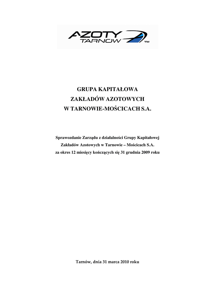 GRUPA KAPITAŁOWA ZAKŁADÓW AZOTOWYCH W TARNOWIE-MOŚCICACH S.A. Sprawozdanie Zarządu z działalności Grupy Kapitałowej Zakładów Azotowych w Tarnowie – Mościcach S.A. za okres 12 miesięcy kończących się 31 grudnia 2009 roku Tarnów, dnia 31 marca 2010 roku Grupa Kapitałowa Zakładów Azotowych w Tarnowie-Mościcach S.A. Sprawozdanie Zarządu z działalności Grupy Kapitałowej za okres 12 miesięcy kończących się 31 grudnia 2009 roku SPIS TREŚCI PODSTAWOWE INFORMACJE NA TEMAT GRUPY KAPITAŁOWEJ .......................... 5 1. 1.1. Opis organizacji Grupy Kapitałowej ...........................................................................................5 1.2. Opis zmian w organizacji Grupy Kapitałowej .........................................................................10 1.3. Informacje o powiązaniach organizacyjnych lub kapitałowych spółek z Grupy Kapitałowej z innymi podmiotami.............................................................................................13 1.4. Informacje o posiadanych przez Jednostkę Dominującą oddziałach (zakładach).............14 1.5. Informacje dotyczące zatrudnienia.............................................................................................14 ZASADY ZARZĄDZANIA GRUPĄ KAPITAŁOWĄ....................................................... 15 2. 2.1. Zmiany w podstawowych zasadach zarządzania Grupą Kapitałową ..................................15 ORGANY JEDNOSTKI DOMINUJĄCEJ.......................................................................... 16 3. 3.1. Wartość wynagrodzeń i świadczeń dodatkowych ...................................................................16 3.2. Umowy zawarte między Jednostką Dominującą a osobami zarządzającymi, przewidujące rekompensatę w przypadku ich rezygnacji lub zwolnienia z zajmowanego stanowiska bez ważnej przyczyny lub gdy ich odwołanie lub zwolnienie następuje z powodu połączenia Spółki przez przejęcie............................................................................17 4. INFORMACJA O AKCJACH I INNYCH PAPIERACH WARTOŚCIOWYCH JEDNOSTKI DOMINUJĄCEJ ORAZ ZNACZĄCYCH AKCJONARIUSZACH ............. 18 4.1. Łączna liczba i wartość nominalna akcji Jednostki Dominującej, stan ich posiadania przez osoby nadzorujące i zarządzające Jednostką Dominującą oraz udziały tych osób w jednostkach powiązanych Jednostki Dominującej .............................................................18 4.2. Informacje o znanych Jednostce Dominującej umowach, w wyniku których mogą w przyszłości nastąpić zmiany w proporcjach posiadanych akcji przez dotychczasowych akcjonariuszy i obligatoriuszy.....................................................................................................18 4.3. Informacje o systemie kontroli programów akcji pracowniczych ........................................19 4.4. Udziały ( akcje ) własne posiadane przez Jednostkę Dominującą, jednostki wchodzące w skład Grupy Kapitałowej oraz osoby działające w ich imieniu .......................................19 4.5. Wykorzystanie środków pozyskanych z emisji .......................................................................20 CHARAKTERYSTYKA DZIAŁALNOŚCI GRUPY KAPITAŁOWEJ .............................. 22 5. 5.1. Informacje o podstawowych produktach, towarach i usługach ............................................22 2 Grupa Kapitałowa Zakładów Azotowych w Tarnowie-Mościcach S.A. Sprawozdanie Zarządu z działalności Grupy Kapitałowej za okres 12 miesięcy kończących się 31 grudnia 2009 roku 5.2. Informacje o rynkach zbytu oraz o źródłach zaopatrzenia w materiały do produkcji, w towary i usługi............................................................................................................................28 5.3. Główne inwestycje krajowe i zagraniczne Grupy Kapitałowej............................................31 5.4. Główne inwestycje kapitałowe Grupy Kapitałowej dokonane poza grupą jednostek powiązanych ...................................................................................................................................32 5.1. Lokaty i inwestycje kapitałowe w ramach Grupy Kapitałowej ............................................33 5.2. Umowy znaczące ............................................................................................................................33 5.3. Istotne transakcje z podmiotami powiązanymi .......................................................................36 5.4. Ważniejsze osiągnięcia w dziedzinie badań i rozwoju ..........................................................36 5.5. Informacje dotyczące zagadnień środowiska naturalnego.....................................................39 5.6. Istotne zdarzenia ............................................................................................................................40 AKTUALNA SYTUACJA FINANSOWA I MAJĄTKOWA GRUPY KAPITAŁOWEJ .... 44 6. 6.1. Ważniejsze zdarzenia mające znaczący wpływ na działalność oraz wyniki finansowe Grupy Kapitałowej ........................................................................................................................44 6.2. Omówienie podstawowych wielkości ekonomiczno- finansowych ....................................45 6.3. Charakterystyka struktury aktywów i pasywów .....................................................................47 6.4. Wskaźniki finansowe ....................................................................................................................50 6.5. Ocena czynników i nietypowych zdarzeń.................................................................................51 6.6. Objaśnienie różnic pomiędzy wynikami finansowymi a prognozami wyników na 2009 rok ...............................................................................................................................