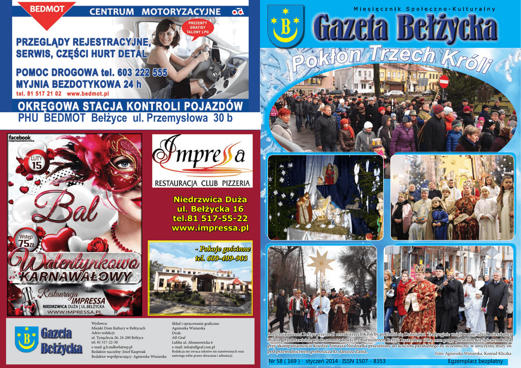 Miesięcznik Społeczno-Kulturalny z r e T c h n o K ł k r óli o P PHU BEDMOT Bełżyce ul. Przemysłowa 30 b Niedrzwica Duża ul. Bełżycka 16 tel.81 517-55-22 www.impressa.pl - Pokoje gościnne tel. 609-409-903 Wydawca: Miejski Dom Kultury w Bełżycach Adres redakcji: ul. Tysiąclecia 26, 24-200 Bełżyce tel. 81 517-22-30 e-mail: [email protected] Redaktor naczelny: Józef Kasprzak Redaktor współpracujący: Agnieszka Winiarska Skład i opracowanie graficzne: Agnieszka Winiarska Druk: Alf-Graf Lublin ul. Abramowicka 6 e-mail: [email protected] Redakcja nie zwraca tekstów nie zamówionych oraz zastrzega sobie prawo skracania i adiustacji. 6 stycznia ulicami Bełżyc przeszedł orszak Trzech Króli by pokłonić się Dzieciątku. Tradycyjnie wzięli w nim udział mieszkańcy miasta, przedstawiciele władz samorządowych z Burmistrzem Bełżyc Ryszardem Górą oraz grupy parafialne. Ze śpiewem kolęd, przy akompaniamencie ksiedza Tomasza Niedziałka przeszlismy do kościoła parafialnego by uczestniczyć w uroczystej mszy św. pod przewodnictwem proboszcza ks. Janusza Zania. Foto: Agnieszka Winiarska, Konrad Kliczka Nr 58 ( 169 ) · styczeń 2014 · ISSN 1507 - 8353 Egzemplarz bezpłatny X Koncert Noworoczny Samorządowego Przedszkola Publicznego Zbierali na WielkaOrkiestre X Koncert Noworoczny Samorządowego Przedszkola Publicznego w Bełżycach miał miejsce 18 stycznia na hali CKFiS. Motywem przewodnim tegorocznego występu była stajenka, a w niej Maria z Józefem i narodzony Jezus. Oczywiście nie zabrakło Trzech Króli oraz aniołów śpiewających „Gloria in excelsis Deo”. Gości przywitała na wstępie dyrektor SPP Jolanta Barszcz-Skowronek. Nastepnie przepięknie przebrane przedszkolaki jak zawsze zachwycały swoją naturalnością i uroczymi występami co sprawiło, że koncert z pewnością wszystkim widzom, a zwłaszcza rodzicom dzieci, pozostanie na długo w pamięci. Foto: Agnieszka Winiarska, Kinga Kamińska Foto: Agnieszka Winiarska, czyt. str. 11 1 Gazeta Bełżycka Harmonogram odbioru odpadów komunalnych z terenu Gminy Bełżyce do czerwca 2014 roku Zabudowa jednorodzinna 13 luty, 14 marzec, 14 kwiecień, 15 maj, 12 czerwiec - ulice: Bychawska, Doktora Klarnera, Elekcyjna, Ewangelicka, Fabryczna, Gminna, Jakuba Nachmana, ks. T.Wilczyńskiego, Lubelska, Milenijna, Miła, Cicha, Pocztowa, Polna, Północna, Przeskok, Rzeczna, Sadowa, Słoneczna, Spokojna, Spółdzielcza, Sympatyczna, Wesoła, Wojska Polskiego, Zamkowa, Łączna, Ogrodowa, Żytnia, Rolnicza, Krótka, Zagrodowa, Klonowa, Śródpole, Przemysłowa, Krakowska, Kręta, Tysiąclecia, Bednarska. 14 luty, 17 marzec, 15 kwiecień, 16 maj, 13 czerwiec - ulice: 1 Maja, Grażewicza, Jabłoniowa, Kazimierska, Kościuszki, Kwiatowa, Plac Kościelny, Ks. Bargieły, Rynek, Szewska, Sportowa, Szpitalna, Wzgórze, Żeromskiego, Kopernika, Przelotowa, Szkolna, Partyzantów, Mała, Orzechowa, Zielona, Prebendarska. 17 luty, 18 marzec, 16 kwiecień, 19 maj, 16 czerwiec - Wymysłówka, Jaroszewice, Babin, Zosin. Skrzyniec Kolonia, Skrzyniec, Wierzchowiska Dolne. 20 luty, 21 marzec, 22 kwiecień, 22 maj, 20 czerwiec - Zagórze, Kierz, Cuple, Płowizny, Wronów, Malinowszczyzna, Zalesie. Zabudowa wielorodzinna na terenie miejskim oraz wiejskim: 18 luty, 19 marzec, 17 kwiecień, 20 maj, 17 czerwiec - Podole, Matczyn, Wojcieszyn, Chmielnik Kolonia, Chmielnik. 10 i 24 luty, 10 i 24 marzec, 14 i 25 kwiecień, 12 i 26 maj, 9 i 23 czerwiec. 19 luty, 20 marzec, 18 kwiecień, 21 maj, 18 czerwiec - Krężnica Okrągła, Wierzchowiska Górne, Stare Wierzchowiska, W dniu wywozu worki należy wystawiać obok pojemnika najpóźniej o godz. 7.00 Wydanie internetowe gazety do pobrania na stronie www.mdk-belzyce.pl Gazeta Bełżycka - Miesięcznik Samorządowy 3 2 Gazeta Bełżycka Gazeta Bełżycka Wykaz inwestycji zaplanowanych w budżecie gminnym na 2014 rok Uchwała budżetowa podjęta przez Radę Miejską na rok 2014 określa łączną kwotę planowanych dochodów budżetu gminy Bełżyce w wysokości 32 489 981,79 zł., z tego dochody bieżące 30 123 481,79 zł. i dochody majątkowe w kwocie 2 366 500,00 zł. Natomiast kwotę planowanych wydatków budżetu gminy określono w kwocie 33 289 981,79zł, z tego Lp. wydatki bieżące 29 606 393,53zł i wydatki majątkowe w kwocie 3 683 588,26zł. Ponadto w budżecie gminnym utworzono rezerwy: ogólną w kwocie 156 523,92zł., oraz rezerwy celowe w wysokości 339 000,00zł. Planowany deficyt budżetu gminy ma wynieść 800 000,00 zł. i zostaniepokryty z przychodów ze sprzedaży innych papierów wartościowych Treść zadania Rok rozpoczęcia inwestycji Wysokość wydatków (zł) w 2014 roku w tym środki funduszu sołeckiego Rok zakończenia 1 Wykonanie wiat przystankowych w miejscowości Krężnica Okrągła 2014 10 000,00 2 Wykonanie wiat przystankowych w miejscowości Jaroszewice 2014 6 000,00 3 Rozbudowa drogi wojewódzkiej 747 Iłża - Konopnica na odcinku Kamień - Konopnica 2014 150 000,00 4 Zadania inwestycyjne na drogach powiatowych 2014 50 000,00 5 Budowa ulicy Wojska Polskiego 2014 75 000,00 6 Budowa ul. Wzgórze (prace geodezyjne) 2014 10 000,00 6 000,00 7 Przebudowa drogi gminnej w Babinie (w stronę cmentarza) 2014 10 000,00 8 Modrenizacja drogi gminnej nr 112446L w m. Matczyn 2014 40 000,00 9 Przebudowa drogi w Płowiznach Nr 106992L 2014 7 410,65 7 410,65 10 Przebudowa drogi w m. Skrzyniec - działka nr 552 2014 13 077,61 13 077,61 11 Modernizacja drogi Nr 106982L w m. Chmielnik Kolonia 2014 50 000,00 12 Przebudowa ul. Bednarskiej - Nr 107008L 2014 15 000,00 13 Przebudowa ul. Zamkowej - Nr 107045L 2014 25 000,00 14 Przebudowa drogi gminnej Nr 106914L w miejscowości Podole 2014 30 000,00 15 Przebudowa drogi gminnej Nr 107002L na odcinku Zalesie - Konstantynówka 2014 20 000,00 2014 20 000,00 15 000,00 16 Przebudowa drogi gminnej Skrzyniec - Wierzchowiska Stare (działka Nr 582) 2014 18 Przebudowa drogi gminnej na granicy z gminą Wojciechów relacji Matczyn-Stasin 