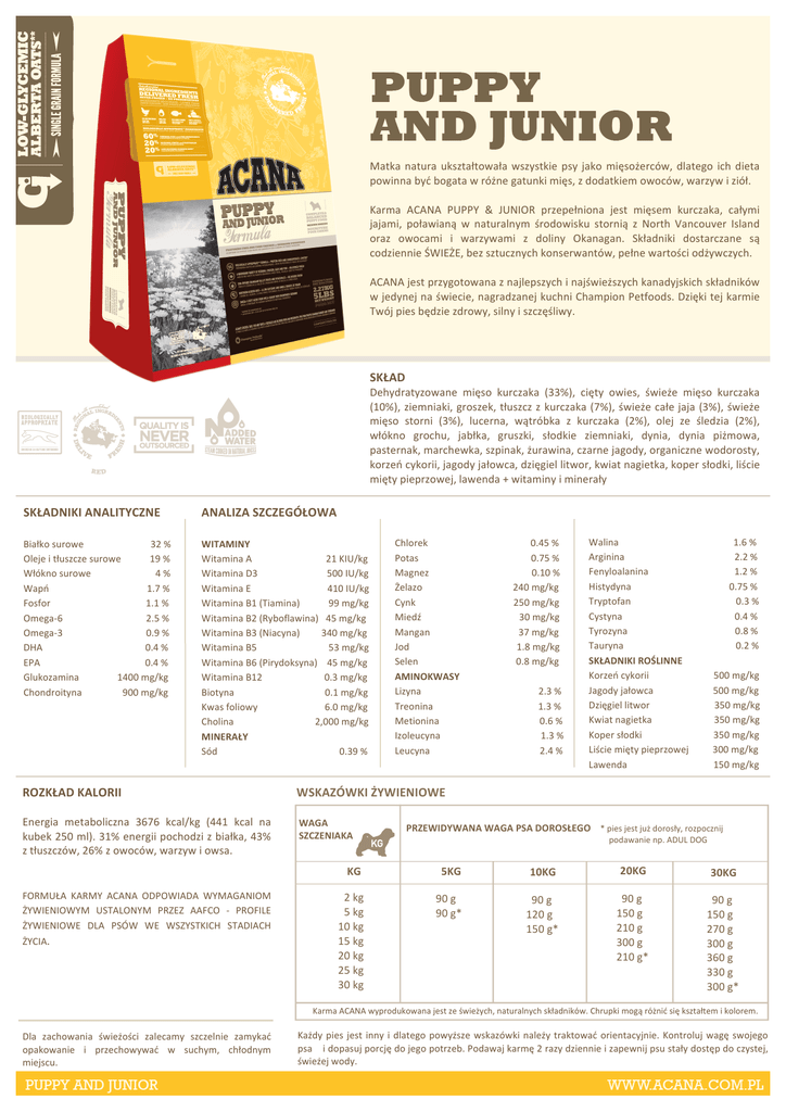 Matka natura ukształtowała wszystkie psy jako mięsożerców, dlatego ich dieta powinna być bogata w różne gatunki mięs, z dodatkiem owoców, warzyw i ziół. Karma ACANA PUPPY & JUNIOR przepełniona jest mięsem kurczaka, całymi jajami, poławianą w naturalnym środowisku stornią z North Vancouver Island oraz owocami i warzywami z doliny Okanagan. Składniki dostarczane są codziennie ŚWIEŻE, bez sztucznych konserwantów, pełne wartości odżywczych. ACANA jest przygotowana z najlepszych i najświeższych kanadyjskich składników w jedynej na świecie, nagradzanej kuchni Champion Petfoods. Dzięki tej karmie Twój pies będzie zdrowy, silny i szczęśliwy. SKŁAD Dehydratyzowane mięso kurczaka (33%), cięty owies, świeże mięso kurczaka (10%), ziemniaki, groszek, tłuszcz z kurczaka (7%), świeże całe jaja (3%), świeże mięso storni (3%), lucerna, wątróbka z kurczaka (2%), olej ze śledzia (2%), włókno grochu, jabłka, gruszki, słodkie ziemniaki, dynia, dynia piżmowa, pasternak, marchewka, szpinak, żurawina, czarne jagody, organiczne wodorosty, korzeń cykorii, jagody jałowca, dzięgiel litwor, kwiat nagietka, koper słodki, liście mięty pieprzowej, lawenda + witaminy i minerały SKŁADNIKI ANALITYCZNE ANALIZA SZCZEGÓŁOWA Białko surowe 32 % Oleje i tłuszcze surowe 19 % Włókno surowe 4 % Wapń 1.7 % Fosfor 1.1 % Omega-‐6 2.5 % Omega-‐3 0.9 % DHA 0.4 % EPA 0.4 % Glukozamina 1400 mg/kg Chondroityna 900 mg/kg WITAMINY Witamina A 21 KIU/kg Witamina D3 500 IU/kg Witamina E 410 IU/kg Witamina B1 (Tiamina) 99 mg/kg Witamina B2 (Ryboflawina) 45 mg/kg Witamina B3 (Niacyna) 340 mg/kg Witamina B5 53 mg/kg Witamina B6 (Pirydoksyna) 45 mg/kg Witamina B12 0.3 mg/kg Biotyna 0.1 mg/kg Kwas foliowy 6.0 mg/kg Cholina 2,000 mg/kg MINERAŁY Sód 0.39 % Chlorek 0.45 % Potas 0.75 % Magnez 0.10 % Żelazo 240 mg/kg Cynk 250 mg/kg Miedź 30 mg/kg Mangan 37 mg/kg Jod 1.8 mg/kg Selen 0.8 mg/kg AMINOKWASY Lizyna 2.3 % Treonina 1.3 % Metionina 0.6 % Izoleucyna 1.3 % Leucyna 2.4 % ROZKŁAD KALORII WSKAZÓWKI ŻYWIENIOWE Energia metaboliczna 3676 kcal/kg (441 kcal na kubek 250 ml). 31% energii pochodzi z białka, 43% z tłuszczów, 26% z owoców, warzyw i owsa. FORMUŁA KARMY ACANA ODPOWIADA WYMAGANIOM ŻYWIENIOWYM USTALONYM PRZEZ AAFCO -‐ PROFILE ŻYWIENIOWE DLA PSÓW WE WSZYSTKICH STADIACH ŻYCIA. Dla zachowania świeżości zalecamy szczelnie zamykać opakowanie i przechowywać w suchym, chłodnym miejscu. WAGA SZCZENIAKA Walina 1.6 % Arginina 2.2 % Fenyloalanina 1.2 % Histydyna 0.75 % Tryptofan 0.3 % Cystyna 0.4 % Tyrozyna 0.8 % Tauryna 0.2 % SKŁADNIKI ROŚLINNE Korzeń cykorii 500 mg/kg Jagody jałowca 500 mg/kg Dzięgiel litwor 350 mg/kg Kwiat nagietka 350 mg/kg Koper słodki 350 mg/kg Liście mięty pieprzowej 300 mg/kg Lawenda 150 mg/kg PRZEWIDYWANA WAGA PSA DOROSŁEGO * pies jest już dorosły, rozpocznij podawanie np. ADUL DOG 20KG 30KG 90 g 90 g 150 150 g g 210 g 270 g 300 g 300 g 20 kg 210 g* 360 g 25 kg g 330 30 kg 300 g* Karma ACANA wyprodukowana jest ze świeżych, naturalnych i kolorem. składników. Chrupki mogą różnić się kształtem Każdy pies jest inny i dlatego powyższe wskazówki należy traktować orientacyjnie. Kontroluj wagę swojego do czystej, psa i dopasuj porcję do jego potrzeb. Podawaj karmę 2 razy dziennie i zapewnij psu stały dostęp wody. świeżej KG 2 kg 5 kg 10 kg 15 kg 5KG 90 g 90 g* 10KG 90 g 1 20 g 150 g*