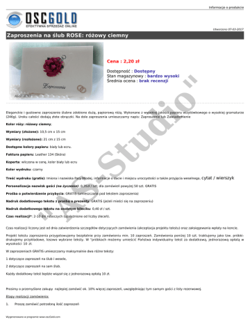 Informacje o produkcie Utworzono 07-03-2017 Zaproszenia na ślub ROSE: różowy ciemny Cena : 2,20 zł o" Dostępność : Dostępny Stan magazynowy : bardzo wysoki Średnia ocena : brak recenzji ud i Eleganckie i gustowne zaproszenie ślubne zdobione dużą, papierową różą. Wykonane z wysokiej jakości papieru wizytówkowego o wysokiej gramaturze (246g). Uroku całości dodają złote obrączki. Na dole zaproszenia umieszczamy napis: Zaproszenie lub Zawiadomienie Kolor róży: różowy ciemny; Wymiary (złożone): 10,5 cm x 15 cm Wymiary (rozłożone): 21 cm z 15 cm Faktura papieru: Leather 134 (Skóra) Koperta: wliczona w cenę, kolor biały lub ecru Kolor wydruku: czarny St Dostępne kolory papieru: biały lub ecru. / wierszyk S- Treść wydruku (gratis): Imiona i nazwiska Pary Młodej, informacje o dacie i miejscu uroczystości a także przyjęcia weselnego, cytat Personalizacja nazwisk gości (na życzenie): 0,35zł / szt; dla zamówień powyżej 50 szt. GRATIS Prośba o potwierdzenie przybycia: GRATIS (umieszczana pod tekstem zaproszenia) "A Nadruk dodatkowego tekstu z prośbą o prezenty: GRATIS (jeżeli mieści się na zaproszeniu) Nadruk dodatkowego tekstu na osobnym bileciku: 0,40 zł / szt. Czas realizacji*: 2-10 dni roboczych (uzależnione od liczby zleceń). Czas realizacji liczony jest od dnia zatwierdzenia szczegółów dotyczących zamówienia (akceptacja projektu tekstu) oraz zaksięgowania wpłaty na koncie. Projekt tekstu zaproszenia przygotowujemy bezpłatnie przy zamówieniu min. 10 zaproszeń. Zamówienia poniżej 10 szt. traktujemy jako tzw. próbkidrukujemy przykładowe, losowo wybrane teksty. W "próbkach możemy umieścić Państwa indywidualny tekst za dodatkową, jednorazową opłatą w wysokości 10 zł. W zaproszeniach GRATIS umieszczamy maksymalnie dwa różne teksty: 1 dotyczące zaproszeń na ślub i wesele, 2 dotyczące zaproszeń na sam ślub. Każdy dodatkowy tekst będzie wiązał się z jednorazową opłatą 10 zł. Prosimy o przemyślane zakupy najlepiej zamówić ok. 10% więcej zaproszeń, uwzględniając tym samym gości z listy rezerwowej. Etapy realizacji zamówienia: 1. Proszę zamówić potrzebną ilość zaproszeń Wygenerowano w programie www.oscGold.com 2. Prosimy o zapoznanie się z wzornikiem (w zakładce "Linki" na karcie produktu - "Kliknij aby pobrać specyfikację produktu PDF") oraz wybór: a. Wzoru czcionki użytej do wydruku tekstu zaproszenia b. Wzoru czcionki użytej do wydruku imion i nazwisk Pary Młodej (jeżeli inna niż użyta do tekstu zaproszenia) c. Tekstu zaproszenia d. Cytatu / sentencji e. Wierszyka z prośbą o prezenty (na życzenie) 3. Do 24h prześlemy formularz zamówienia (czas ten może ulec wydłużeniu jeżeli zamówienie zostało złożone w dniu wolnym od pracy) 4. Należy uzupełnić i odesłać "Formularz zamówienia", w którym znajdują się wszystkie niezbędne informacje potrzebne do sporządzenia projektu. Jeżeli decydują się Państwo na personalizację nazwisk gości prosimy o przesłanie kompletnej listy gości. Lista gości powinna zawierać wypunktowane i odmienione imiona i nazwiska gości tak by pasowały do formy gramatycznej treści zaproszenia np. 1) Janinę i Karola Nowickich 2) Katarzynę i Mariusza Dobrowolskich z dziećmi 3) Lucjana Martyniuka z osobą towarzyszącą "A S- St ud i Zalecamy zapisywanie listy goś o" 5.