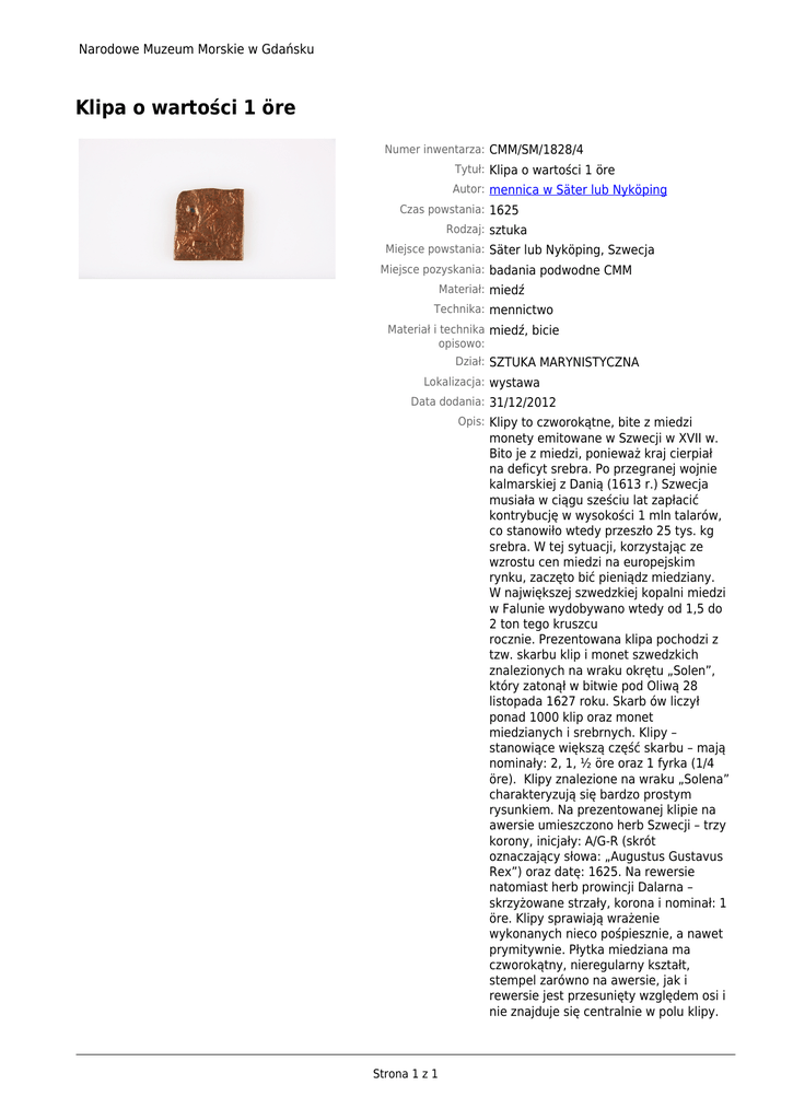 Narodowe Muzeum Morskie w Gdańsku Klipa o wartości 1 öre Numer inwentarza: CMM/SM/1828/4 Tytuł: Klipa o wartości 1 öre Autor: mennica w Säter lub Nyköping Czas powstania: 1625 Rodzaj: sztuka Miejsce powstania: Säter lub Nyköping, Szwecja Miejsce pozyskania: badania podwodne CMM Materiał: miedź Technika: mennictwo Materiał i technika miedź, bicie opisowo: Dział: SZTUKA MARYNISTYCZNA Lokalizacja: wystawa Data dodania: 31/12/2012 Opis: Klipy to czworokątne, bite z miedzi monety emitowane w Szwecji w XVII w. Bito je z miedzi, ponieważ kraj cierpiał na deficyt srebra. Po przegranej wojnie kalmarskiej z Danią (1613 r.) Szwecja musiała w ciągu sześciu lat zapłacić kontrybucję w wysokości 1 mln talarów, co stanowiło wtedy przeszło 25 tys. kg srebra. W tej sytuacji, korzystając ze wzrostu cen miedzi na europejskim rynku, zaczęto bić pieniądz miedziany. W największej szwedzkiej kopalni miedzi w Falunie wydobywano wtedy od 1,5 do 2 ton tego kruszcu rocznie. Prezentowana klipa pochodzi z tzw. skarbu klip i monet szwedzkich znalezionych na wraku okrętu „Solen”, który zatonął w bitwie pod Oliwą 28 listopada 1627 roku. Skarb ów liczył ponad 1000 klip oraz monet miedzianych i srebrnych. Klipy – stanowiące większą część skarbu – mają nominały: 2, 1, ½ öre oraz 1 fyrka (1/4 öre). Klipy znalezione na wraku „Solena” charakteryzują się bardzo prostym rysunkiem. Na prezentowanej klipie na awersie umieszczono herb Szwecji – trzy korony, inicjały: A/G-R (skrót oznaczający słowa: „Augustus Gustavus Rex”) oraz datę: 1625. Na rewersie natomiast herb prowincji Dalarna – skrzyżowane strzały, korona i nominał: 1 öre. Klipy sprawiają wrażenie wykonanych nieco pośpiesznie, a nawet prymitywnie. Płytka miedziana ma czworokątny, nieregularny kształt, stempel zarówno na awersie, jak i rewersie jest przesunięty względem osi i nie znajduje się centralnie w polu klipy. Strona 1 z 1