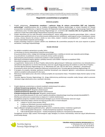 „Kompetencje zawodowe i społeczne drogą do sukcesu pracowników MSP woj. kujawsko-pomorskiego” Projekt współfinansowany ze środków Unii Europejskiej w ramach Europejskiego Funduszu Społecznego Regulamin uczestnictwa w projekcie Założenia projektu 1. 2. 3. Projekt szkoleniowy: „Kompetencje zawodowe i społeczne drogą do sukcesu pracowników MSP woj. kujawskopomorskiego” współfinansowany jest ze środków Europejskiego Funduszu Społecznego, w ramach Działania 8.1 Rozwój pracowników i przedsiębiorstw w regionie Priorytetu VIII Regionalne kadry gospodarki Programu Operacyjnego Kapitał Ludzki i realizowany przez Toruoską Agencję Rozwoju Regionalnego S.A. w terminie od 1 kwietnia 2011 do 31 grudnia 2011 pod nadzorem Urzędu Marszałkowskiego Województwa Kujawsko-Pomorskiego. Projekt skierowany jest do osób dorosłych zamieszkujących* obszar województwa kujawsko-pomorskiego, które z własnej inicjatywy (poza godzinami pracy) są zainteresowane podwyższeniem kwalifikacji, wykonujących pracę na podstawie umowy o pracę, umowy zlecenia lub umowy o dzieło na rzecz mikro, małych i średnich przedsiębiorstw**, mających siedzibę na terenie województwa kujawsko-pomorskiego. Projekt przewiduje wsparcie w postaci szkoleo oraz dodatkowo dla uczestników powyżej 45 roku życia wsparcie w postaci doradztwa / coachingu indywidualnego. Zasady rekrutacji 1. 2. 3. 4. 5. 6. 7. Do udziału w projekcie uprawnione są osoby, które: a) mieszkają na terenie województwa kujawsko-pomorskiego, b) są pracownikami mikro, małego lub średniego przedsiębiorstwa z siedzibą na terenie woj. kujawsko-pomorskiego, c) są zatrudnione na podstawie umowy o pracę lub umowy cywilno-prawnej. Gwarantujemy pierwszeostwo uczestnictwa osobom w wieku powyżej 45 lat. Rekrutacja prowadzona będzie zgodnie z polityką równości szans kobiet i mężczyzn w projektach POKL. Warunkiem przyjęcia na szkolenia jest: a) wypełnienie i dostarczenie do Biura Projektu dokumentów zgłoszeniowych: Deklaracja uczestnictwa oraz Zaświadczenie o zatrudnieniu (do pobrania na stronie internetowej: www.tarr.org.pl) drogą pocztową lub osobiście na adres Biura Projektu: Toruoska Agencja Rozwoju Regionalnego S.A, ul. Włocławska 167, pok. 244, 87-100 Toruo, z dopiskiem: „Kompetencje”. b) pozytywny wynik rekrutacji i podpisanie Deklaracji uczestnictwa przez Toruoską Agencję Rozwoju Regionalnego S.A. O przyjęciu do projektu decyduje spełnienie kryteriów formalnych oraz kolejnośd zgłoszeo z zastrzeżeniem pierwszeostwa udziału w projekcie osób powyżej 45 roku życia. Rekrutacja trwad będzie przez cały okres realizacji projektu do wyczerpania miejsc. Prowadzone będą również zapisy na listy rezerwowe. Toruoska Agencja Rozwoju Regionalnego S.A. drogą elektroniczną poinformuje wszystkie osoby biorące udział w procesie rekrutacji o jego zakooczeniu oraz o wynikach rekrutacji. Organizacja szkoleo 1. 2. 3. Projekt obejmuje uczestnictwo w czterech modułach szkoleniowych do wyboru: a) Moduł Kompetencję Językowe: 48 godzin szkoleniowych b) Moduł Kompetencje IT: 48 godzin szkoleniowych c) Moduł Kompetencje Społeczne: 48 godzin szkoleniowych d) Moduł Kompetencje Menadżerskie: 48 godzin szkoleniowych oraz dla uczestników powyżej 45 roku życia 2 godziny doradztwa indywidualnego (coaching metodą ExtendedDISC®). Możliwe jest jednoczesne uczestnictwo w więcej niż 1 module szkoleniowym. Szczegółowe programy modułów szkoleniowych dostępne są na stronie internetowej: www.tarr.org.pl. Szkolenia realizowane będą w okresie od maja do grudnia 2011 w trzech edycjach: I edycja w Toruniu (maj-czerwiec 2011), II edycja we Włocławku (wrzesieo-październik 2011), III edycja w Bydgoszczy (listopad–grudzieo 2011). Zajęcia odbywad się będą poza godzinami pracy - głównie w weekendy (sobota i niedziela) w godzinach: 9.00-14.00 (6 godzin lekcyjnych) – moduły Kompetencje Językowe i Kompetencje IT, 9.00-16.00 (8 godzin lekcyjnych) – moduły Kompetencje Społeczne i Kompetencje Menadżerskie. Szczegółowe terminy zajęd zawiera Harmonogram zajęd dostępny na stronie internetowej: www.tarr.org.pl (aktualizowany przed każdą edycją). TORUOSKA AGENCJA ROZWOJU REGIONALNEGO S.A. ul. Włocławska 167, p.244; 87-10 Toruo tel. 56/ 657 14 50; fax: 56/ 654 88 24 e-mail: [email protected]; www.tarr.org.pl www.tarr.org.pl „Kompetencje zawodowe i społeczne drogą do sukcesu pracowników MSP woj. kujawsko-pomorskiego” Projekt współfinansowany ze środków Unii Europejskiej w ramach Europejskiego Funduszu Społecznego 4. 5. Z przyczyn losowych i niezależnych Toruoska Agencja Rozwoju Regionalnego S.A. zastrzega sobie prawo do zmiany terminów szkolenia oraz zobowiązuje się każdorazowo do niezwłocznego poinformowania uczestników (telefonicznie lub drogą elektroniczną) o zmianach w harmonogramie szkoleo. Zajęcia realizowane będą w grupach szkoleniowych od 12-16 osób. Każdy z uczestników projektu otrzyma materiały szkoleniowe (teczka, długopis, notatnik), materiały dydaktyczne oraz catering. Zasady uczestnictwa 1. 2. 3. 4. Udział w szkoleniach i coachingu jest bezpłatny. Toruoska Agencja Rozwoju Regionalnego S.A. nie pokrywa kosztów dojazdu Uczestnika na miejsce szkolenia. Uczestnik projektu zobowiązany jest do: regularnego uczestnictwa w zajęciach - dopuszczalna jest nieobecnośd w jednym dniu szkoleniowym, uczestnictwa w 2 godzinach coachingu przeznaczonego dla uczestników powyżej 45 roku życia, potwierdzania uczestnictwa na liście obecności, wypełniania kwestionariuszy ankiet ewaluacyjnych i oceniających szkolenie, informowania o wszelkich zmianach danych zawartych w Deklaracji uczestnictwa. Warunkiem ukooczenia szkolenia jest: uczestnictwo w zajęciach uregulowanie wszystkich zobowiązao wobec Toruoskiej Agencji Rozwoju Regionalnego S.A. Uczestnik z tytułu udziału w szkoleniu otrzymuje wsparcie w wysokości 2 920,32 zł. Toruoska Agencja Rozwoju Regionalne