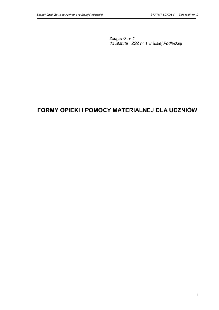Zespół Szkół Zawodowych nr 1 w Białej Podlaskiej STATUT SZKOŁY Załącznik nr 2 Załącznik nr 2 do Statutu ZSZ nr 1 w Białej Podlaskiej FORMY OPIEKI I POMOCY MATERIALNEJ DLA UCZNIÓW 1 Zespół Szkół Zawodowych nr 1 w Białej Podlaskiej STATUT SZKOŁY Załącznik nr 2 §1 Uczniowi może być przyznawana pomoc materialna o charakterze socjalnym i motywacyjnym. §2 Powołuje się Szkolną Komisję Stypendialną, zwaną dalej komisją, w skład której wchodzą: 1) wicedyrektor do spraw wychowawczych, 2) pedagog szkolny, 3) opiekun samorządu uczniowskiego, 4) kierownik internatu, 5) dwóch przedstawicieli Rady Rodziców. §3 Komisja opiniuje przyznawanie w każdym roku szkolnym pomocy z funduszu Rady Rodziców oraz przyznawanych przez organ prowadzący. §4 1. Stypendium za wyniki w nauce może być przyznawane uczniowi, który uzyskał wysoką średnią ocen, oraz co najmniej dobrą ocenę zachowania w okresie /semestrze/ poprzedzającym okres /semestr/, w którym przyznaje się to stypendium, a stypendium za osiągnięcia sportowe może być przyznane uczniowi, który uzyskał wysokie wyniki we współzawodnictwie sportowym na szczeblu co najmniej międzyszkolnym oraz co najmniej dobrą ocenę zachowania w okresie (semestrze) poprzedzającym okres (semestr), w którym przyznaje się to stypendium. 2. O przyznanie stypendium za wyniki w nauce lub za osiągnięcia sportowe uczeń może ubiegać się nie wcześniej niż po ukończeniu pierwszego okresu /semestru/ nauki w danej szkole. 3. Stypendium szkolne jest przyznawane na okres nie krótszy niż miesiąc i nie dłuższy niż 10 miesięcy w danym roku szkolnym. 4. Średnią ocen, o której mowa w ust. 1 ustala komisja, po zasięgnięciu opinii rady pedagogicznej i samorządu uczniowskiego. 2 Zespół Szkół Zawodowych nr 1 w Białej Podlaskiej STATUT SZKOŁY Załącznik nr 2 5. Wniosek o przyznanie stypendium za wyniki w nauce lub za osiągnięcia sportowe wychowawca klasy składa do komisji, która przekazuje wniosek wraz ze swoją opinią dyrektorowi. 6. Stypendium za wyniki w nauce lub za osiągnięcia sportowe przyznaje dyrektor po zasięgnięciu opinii rady pedagogicznej, w ramach środków przyznanych na ten cel w budżecie szkoły przez organ prowadzący. 7. Stypendium za wyniki w nauce lub za osiągnięcia sportowe jest wypłacane raz w okresie /semestrze/. §5 1. Z funduszu rady rodziców w miarę posiadanych środków uczeń może otrzymać pomoc w postaci: 1) pokrycia w całości lub części opłat za obiady, 2) zapomogi pieniężnej, 3) premia za naukę /dla uczniów szkół ponadgimnazjalnych, którzy za dany semestr uzyskali średnią ocen powyżej 4,75 i wzorową ocenę zachowania (nie dotyczy klasyfikacji końcowej)/. 2. Pomoc, o której mowa w ust. 1 pkt 1 i 2 może otrzymać uczeń znajdujący się w bardzo trudnej sytuacji materialnej wynikającej z niskich dochodów na osobę w rodzinie lub wynikającej ze zdarzenia losowego. Powyższe okoliczności uczeń winien udokumentować. 3. Z pomocy, o której mowa w ust. 1 nie może skorzystać uczeń, który naruszył postanowienia Statutu Szkoły, w szczególności: 1) otrzymał ostrzeżenia lub naganę dyrektora szkoły, 2) opuszczał godziny lekcyjne bez usprawiedliwienia, palił papierosy, wszedł w kolizję z prawem, naruszył mienie szkolne, 3) otrzymał obniżoną ocenę zachowania za poprzedni okres /semestr/. 3