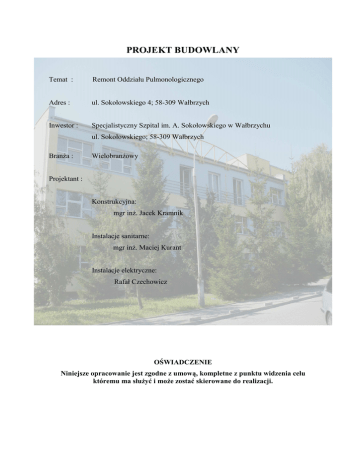 PROJEKT BUDOWLANY Temat : Remont Oddziału Pulmonologicznego Adres : ul. Sokołowskiego 4; 58-309 Wałbrzych Inwestor : Specjalistyczny Szpital im. A. Sokołowskiego w Wałbrzychu ul. Sokołowskiego; 58-309 Wałbrzych BranŜa : WielobranŜowy Projektant : Konstrukcyjna: mgr inŜ. Jacek Kramnik Instalacje sanitarne: mgr inŜ. Maciej Kurant Instalacje elektryczne: Rafał Czechowicz OŚWIADCZENIE Niniejsze opracowanie jest zgodne z umową, kompletne z punktu widzenia celu któremu ma słuŜyć i moŜe zostać skierowane do realizacji. ` CZĘŚĆ ARCHITEKTONICZNO-KONSTRUKCYJNA Projektant: mgr inŜ. Jacek Kramnik SPIS TREŚCI 1) 1. 2. 2) Część opisowa Dane ogólne Opis techniczny Część rysunkowa Stan istniejący: 1. Rzut kondygnacji STAN PROJEKTOWANY: 2. RZUT KONDYGNACJI 1. DANE OGÓLNE Przedmiotowy Oddział znajduje się w budynku D na terenie Specjalistycznego Szpitala im. A. Sokołowskiego w Wałbrzychu przy ul. Sokołowskiego. Budynek jest budynkiem uŜyteczności publicznej trzykondygnacyjnym. Budynek posiada trzy wejścia. Jedno od frontu, natomiast dwa wewnętrzne jako przejściowe z budynków sąsiadujących Oddział pulmonologii znajduje się na I piętrze budynku. Na oddziale znajdować się będą recepcja, sale pobytu dziennego, gabinet lekarski, pomieszczenia higienicznosanitarne dla pacjentów i pracowników oraz pomieszczenie porządkowe. Budynek wykonany w sposób tradycyjny murowany z cegły. Stropy nad kondygnacjami Ŝelbetowe wylewane. Dostęp do oddziału dla osób niepełnosprawnych za pomocą dźwigów szpitalnych zlokalizowanych w budynku E. Dane dotyczące obiektu: − Powierzchnia uŜytkowa oddziału 393 m2 − Kubatura oddziału 5200 m3 Obiekt jest wyposaŜony w instalacje wod.-kan., c.o. i elektryczną oraz gazów medycznych 2. OPIS TECHNICZNY 2.1. Fundamenty. W opracowaniu nie przewiduje się zmian w układzie fundamentów budynku. 2.2. Ściany. Ściany nośne oraz działowe budynku z cegły. Przewiduje się wyburzenia w obrębie ścian działowych. Nowe ściany wewnętrzne o gr. 12 cm wykonać z bloczków z betonu komórkowego odm. 400 na zaprawie cementowo-wapiennej. W ścianach w miejscach otworów drzwiowych zamontować nadproŜa Ŝelbetowe prefabrykowane typu L-19 oraz nadproŜa stalowe L60x60x5 w ilości wskazanej w przedmiarach robót. 2.3. Stropy. Istniejące stropy nad wszystkimi kondygnacjami Ŝelbetowe gr. 15 cm. Stropy oparte na ścianach zewnętrznych i wewnętrznych. 2.4. Podłogi i posadzki. W obiekcie przewidziano wykonanie podłóg z wykładziny obiektowej Tarket Granit w kolorach wskazanych w projekcie aranŜacji wnętrz. W toaletach, umywalni, natrysku i pomieszczeniu porządkowym wykonać izolację wodoszczelną z membrany wodoszczelnej, izolację wywinąć na ścianę. NaroŜe posadzka-ściana wzmocnić tkaniną wzmacniającą. 2.5. Schody. Schody wewnętrzne Schody naleŜy wyrównać oraz wykończyć systemem Tarket typu kauczuk (włącznie z elementami wykończenia). Na schodach naleŜy przewidzieć montaŜ balustrad ze stali kwasoodpornej wg technologii zastosowanej na kondygnacjach powyŜszych. Remont schodów naleŜy wykonać aŜ do poziomu parteru. 2.6. Podjazd dla osób niepełnosprawnych. Dostęp na oddział dla osób niepełnosprawnych zapewniają dwa dźwigi szpitalne zlokalizowane w sąsiednim budynku E. 2.7. Kominy. W pomieszczeniach budynku istnieją kanały wentylacji grawitacyjnej. 2.8. Stolarka okienna. Obiekt posiada nową stolarkę okienną PCV która nie podlega wymianie. 2.9. Stolarka drzwiowa. Zakłada się wymianę stolarki drzwiowej zewnętrznej i wewnętrznej. Drzwi wewnętrzne z PCV z wypełnieniem szybą zespoloną. Kolor biały. Współczynnik przenikania ciepła dla drzwi nie powinien być większy niŜ 1,6 W/m2K. Do pomieszczeń sanitarnych drzwi z kratka nawiewną w dolnej części o powierzchni min. 220 cm2. 2.10. Roboty wykończeniowe. - Wewnątrz budynku Wszystkie tynki wewnętrzne ścian naleŜy skuć i wykonać nowe. Ttynki cementowo-wapienne z gładziami gipsowymi (jako alternatywne rozwiązanie moŜna zastosować tynki gipsowe). Na stropach w salach chorych zakłada się wykonanie sufitów podwieszonych z płyt kartonowo gipsowych. Na stropie w ciągach komunikacyjnych wykonać naleŜy sufit podwieszany systemowy typu Termatex. Powierzchnie ścian malować farbami zmywalnymi firmy Beckers. W pomieszczeniach sanitarnych wykonać na pełną wysokość pomieszczeń wykładzinę tarket Granit, natomiast posadzkę wyłoŜyć specjalistycznym Tarketem antypoślizgowym. Na ścianach komunikacji wykonać powierzchnie zmywalne (zgodnie z projektem aranŜacji wnętrz). Parapety wewnętrzne granitowe. KaŜdy naroŜnik naleŜy zabezpieczyć do wysokości 1.80m naroŜnikiem na podstawie winylowej np. firmy Promador lub innej o identycznych właściwościach odporności na uderzenia. 2.11. Bezpieczeństwo poŜarowe. Cały budynek stanowi jedną strefę poŜarową zaliczoną do klasy B odporności poŜarowej. Opracował: CZĘŚĆ SANITARNA Projektant: mgr inŜ. Maciej Kurant 351/00/DUW . ZAWARTOŚĆ OPRACOWANIA 1. Opis Techniczny 1.1. Przedmiot opracowania 1.2. Podstawa opracowania 1.3. Zakres opracowania 1.4. Materiały wykorzystane przy projektowaniu 1.5. Instalacja wodociągowa 1.6. Instalacja kanalizacji sanitarnej 1.7. Instalacja centralnego ogrzewania 1.8. Uwagi końcowe 2 Warunki wykonania i odbioru 3. Spis rysunków 1. OPIS TECHNICZNY 1.1. Przedmiot opracowania Przedmiotem opracowania jest Projekt Budowlany wewnętrznych instalacji: − centralnego ogrzewania − wody zimnej, − wody ciepłej, − kanalizacji sanitarnej, − gazów medycznych, 1.2. Podstawa opracowania Za podstawę do niniejszego opracowania posłuŜyły: - zlecenie Inwestora, - obowiązujące Normy i Przepisy 1.3. Zakres opracowania Zakresem opracowania objęty jest projekt budowlany z kosztorysami i specyfikacjami w zakresie przedmiotu opracowania. 1.4. Materiały wykorzystane przy projektowaniu - Dz.U.02.75.690 – Rozporządzenie Ministr