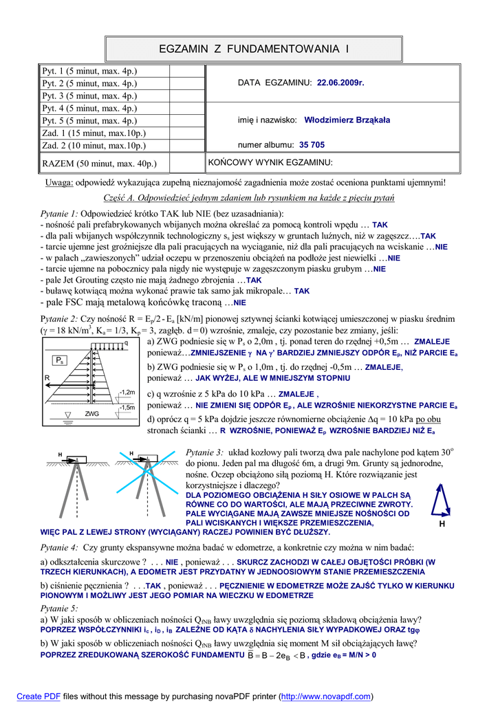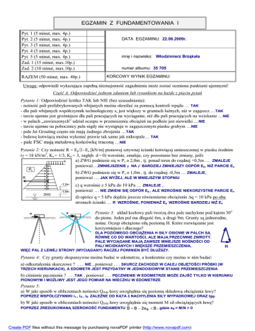 EGZAMIN Z FUNDAMENTOWANIA I Pyt. 1 (5 minut, max. 4p.) Pyt. 2 (5 minut, max. 4p.) Pyt. 3 (5 minut, max. 4p.) Pyt. 4 (5 minut, max. 4p.) Pyt. 5 (5 minut, max. 4p.) Zad. 1 (15 minut, max.10p.) Zad. 2 (10 minut, max.10p.) DATA EGZAMINU: 22.06.2009r. imię i nazwisko: Włodzimierz Brząkała numer albumu: 35 705 RAZEM (50 minut, max. 40p.) KOŃCOWY WYNIK EGZAMINU: Uwaga: odpowiedź wykazująca zupełną nieznajomość zagadnienia może zostać oceniona punktami ujemnymi! Część A. Odpowiedzieć jednym zdaniem lub rysunkiem na każde z pięciu pytań Pytanie 1: Odpowiedzieć krótko TAK lub NIE (bez uzasadniania): - nośność pali prefabrykowanych wbijanych można określać za pomocą kontroli wpędu … TAK - dla pali wbijanych współczynnik technologiczny ss jest większy w gruntach luźnych, niż w zagęszcz….TAK - tarcie ujemne jest groźniejsze dla pali pracujących na wyciąganie, niż dla pali pracujących na wciskanie …NIE - w palach „zawieszonych” udział oczepu w przenoszeniu obciążeń na podłoże jest niewielki …NIE - tarcie ujemne na pobocznicy pala nigdy nie występuje w zagęszczonym piasku grubym …NIE - pale Jet Grouting często nie mają żadnego zbrojenia …TAK - buławę kotwiącą można wykonać prawie tak samo jak mikropale… TAK - pale FSC mają metalową końcówkę traconą …NIE Pytanie 2: Czy nośność R = Ep/2 - Ea [kN/m] pionowej sztywnej ścianki kotwiącej umieszczonej w piasku średnim ( = 18 kN/m3, Ka = 1/3, Kp = 3, zagłęb. d = 0) wzrośnie, zmaleje, czy pozostanie bez zmiany, jeśli: a) ZWG podniesie się w Ps o 2,0m , tj. ponad teren do rzędnej +0,5m … ZMALEJE q ponieważ…ZMNIEJSZENIE NA ’ BARDZIEJ ZMNIEJSZY ODPÓR Ep, NIŻ PARCIE Ea Ps b) ZWG podniesie się w Ps o 1,0m , tj. do rzędnej -0,5m … ZMALEJE, ponieważ … JAK WYŻEJ, ALE W MNIEJSZYM STOPNIU R -1,2m -1,5m ZWG H c) q wzrośnie z 5 kPa do 10 kPa … ZMALEJE , ponieważ … NIE ZMIENI SIĘ ODPÓR Ep , ALE WZROŚNIE NIEKORZYSTNE PARCIE Ea d) oprócz q = 5 kPa dojdzie jeszcze równomierne obciążenie q = 10 kPa po obu stronach ścianki … R WZROŚNIE, PONIEWAŻ Ep WZROŚNIE BARDZIEJ NIŻ Ea H Pytanie 3: układ kozłowy pali tworzą dwa pale nachylone pod kątem 30o do pionu. Jeden pal ma długość 6m, a drugi 9m. Grunty są jednorodne, nośne. Oczep obciążono siłą poziomą H. Które rozwiązanie jest korzystniejsze i dlaczego? DLA POZIOMEGO OBCIĄŻENIA H SIŁY OSIOWE W PALCH SĄ RÓWNE CO DO WARTOŚCI, ALE MAJĄ PRZECIWNE ZWROTY. PALE WYCIĄGANE MAJĄ ZAWSZE MNIEJSZE NOŚNOŚCI OD PALI WCISKANYCH I WIĘKSZE PRZEMIESZCZENIA, WIĘC PAL Z LEWEJ STRONY (WYCIĄGANY) RACZEJ POWINIEN BYĆ DŁUŻSZY. H Pytanie 4: Czy grunty ekspansywne można badać w edometrze, a konkretnie czy można w nim badać: a) odkształcenia skurczowe ? . . . NIE , ponieważ . . . SKURCZ ZACHODZI W CAŁEJ OBJĘTOŚCI PRÓBKI (W TRZECH KIERUNKACH), A EDOMETR JEST PRZYDATNY W JEDNOOSIOWYM STANIE PRZEMIESZCZENIA b) ciśnienie pęcznienia ? . . .TAK , ponieważ . . . PĘCZNIENIE W EDOMETRZE MOŻE ZAJŚĆ TYLKO W KIERUNKU PIONOWYM I MOŻLIWY JEST JEGO POMIAR NA WIECZKU W EDOMETRZE Pytanie 5: a) W jaki sposób w obliczeniach nośności QfNB ławy uwzględnia się poziomą składową obciążenia ławy? POPRZEZ WSPÓŁCZYNNIKI ic , iD , iB ZALEŻNE OD KĄTA NACHYLENIA SIŁY WYPADKOWEJ ORAZ tg b) W jaki sposób w obliczeniach nośności QfNB ławy uwzględnia się moment M sił obciążających ławę? POPRZEZ ZREDUKOWANĄ SZEROKOŚĆ FUNDAMENTU B B 2e B B , gdzie eB = M/N > 0 Create PDF files without this message by purchasing novaPDF printer (http://www.novapdf.com) Część B. Rozwiązać dwa następujące zadania Zadanie 1: Pionowy pojedynczy pal o średnicy D = 0,48m (D 1,5m) ma długość 9,0m i przechodzi przez dwie warstwy gruntów o podanych parametrach: 1) Piasek drobny o ID = 0,30 0,00 4,0m 5,0m PIASEK DROBNY ID = 0,30 2) Piasek gruby o ID = 0,50 = 18,0kN/m3 t(n) = 50 kPa dla ID = 0,33 t(n) = 80 kPa dla ID = 0,67 q(n) = 2200 kPa dla ID = 0,33 q(n) = 3300 kPa dla ID = 0,67 . PIASEK GRUBY ID = 0,50 Współczynniki materiałowe m = 1,00 0,15 , współczynniki technologiczne ss = 1,6 sp = 1, sW = 1,1 . Wyznaczyć obliczeniowy udźwig tego pala przez pobocznicę w piasku grubym, biorąc współczynnik korekcyjny m = 0,7 (nie analizować warstwy Pd ani nośności przez podstawę !). OBA GRUNTY SĄ NOŚNE, A WIĘC WYKRES WSPÓŁCZYNNIKA t(z) KONSTRUUJE SIĘ OD PIERWOTNEGO POZIOMU TERENU. 0,00 DLA GŁĘBOKOŚCI 5m: t = 50 + (80-50)(0,50-0,33)/(0,67-0,33) = 65 kPa = max 4,5m 5,0m WARSTWĘ PIASKU GRUBEGO NALEŻY ROZBIĆ NA DWIE WARSTWY OBLICZENIOWE: OD 4,0m DO 5,0m O LINIOWO ROSNĄCEJ WARTOŚCI t(z) Z PROPORCJI DLA ŚREDNIEJ GŁĘBOKOŚCI ZALEGANIA 4,5m t = 65 4,5/5 kPa OD 5,0m DO 9,0m O STAŁEJ WARTOŚCI t = 65 kPa OSTATECZNIE DLA POJEDYNCZEGO PALA ŚCISKANEGO: Nt = 0,7 1,6 (1,00-0,15) 1,5 [1 65 4,5/5 + 4 65] kN. Zadanie 2: Do jakiej maksymalnej głębokości Hmax można wykopać pionowy wykop fundamentowy w uwarstwionych gruntach spoistych (rys.) nie stosując ściany oporowej? Wykorzystać podane parametry gruntów. 1m GLINA 1a Hmax = ? GLINA 1b GLINA 1a (IL = 0,35) = 18 kN/m3 c = 10 4 3 kPa GLINA 1b (IL = 0,15) = 21 kN/m3 c = 13 3 2 kPa = 8o, Ka = 3/4, Kp = 4/3 = 12o, Ka = 2/3, Kp = 3/2 Uwagi: 1) przyjąć, że podparcie nie jest konieczne, jeśli parcie czynne ea gliny ma wartości ujemne lub zerowe, 2) spójność wynosi c = c(n)/2 (nie trzeba już jej dzielić przez 2), 3) nie zapomnieć sprawdzić, czy w ogóle Hmax > 1m. NA GŁĘBOKOŚCI 1m W GLINIE 1a: ea = Ka z – 2cKa = 3/4181 – 210 4 3 3 4 < 0, czyli Hmax > 1m. NA GŁĘBOKOŚCI Hmax W GLINIE 1b: ea = Ka z – 2cKa = 2/3[181+21(Hmax – 1)] – 213 3 2 2 3 0, czyli 12 + 14Hmax – 14 – 26 0. Hmax 28/14 = 2 m. E09-1 W-w Create PDF files without this message by purchasing novaPDF printer (http://www.novapdf.com)