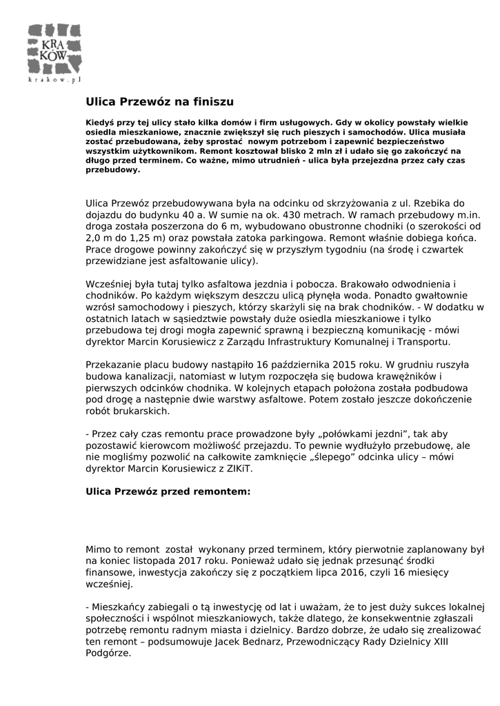 Ulica Przewóz na finiszu Kiedyś przy tej ulicy stało kilka domów i firm usługowych. Gdy w okolicy powstały wielkie osiedla mieszkaniowe, znacznie zwiększył się ruch pieszych i samochodów. Ulica musiała zostać przebudowana, żeby sprostać nowym potrzebom i zapewnić bezpieczeństwo wszystkim użytkownikom. Remont kosztował blisko 2 mln zł i udało się go zakończyć na długo przed terminem. Co ważne, mimo utrudnień - ulica była przejezdna przez cały czas przebudowy. Ulica Przewóz przebudowywana była na odcinku od skrzyżowania z ul. Rzebika do dojazdu do budynku 40 a. W sumie na ok. 430 metrach. W ramach przebudowy m.in. droga została poszerzona do 6 m, wybudowano obustronne chodniki (o szerokości od 2,0 m do 1,25 m) oraz powstała zatoka parkingowa. Remont właśnie dobiega końca. Prace drogowe powinny zakończyć się w przyszłym tygodniu (na środę i czwartek przewidziane jest asfaltowanie ulicy). Wcześniej była tutaj tylko asfaltowa jezdnia i pobocza. Brakowało odwodnienia i chodników. Po każdym większym deszczu ulicą płynęła woda. Ponadto gwałtownie wzrósł samochodowy i pieszych, którzy skarżyli się na brak chodników. - W dodatku w ostatnich latach w sąsiedztwie powstały duże osiedla mieszkaniowe i tylko przebudowa tej drogi mogła zapewnić sprawną i bezpieczną komunikację - mówi dyrektor Marcin Korusiewicz z Zarządu Infrastruktury Komunalnej i Transportu. Przekazanie placu budowy nastąpiło 16 października 2015 roku. W grudniu ruszyła budowa kanalizacji, natomiast w lutym rozpoczęła się budowa krawężników i pierwszych odcinków chodnika. W kolejnych etapach położona została podbudowa pod drogę a następnie dwie warstwy asfaltowe. Potem zostało jeszcze dokończenie robót brukarskich. - Przez cały czas remontu prace prowadzone były „połówkami jezdni”, tak aby pozostawić kierowcom możliwość przejazdu. To pewnie wydłużyło przebudowę, ale nie mogliśmy pozwolić na całkowite zamknięcie „ślepego” odcinka ulicy – mówi dyrektor Marcin Korusiewicz z ZIKiT. Ulica Przewóz przed remontem: Mimo to remont został wykonany przed terminem, który pierwotnie zaplanowany był na koniec listopada 2017 roku. Ponieważ udało się jednak przesunąć środki finansowe, inwestycja zakończy się z początkiem lipca 2016, czyli 16 miesięcy wcześniej. - Mieszkańcy zabiegali o tą inwestycję od lat i uważam, że to jest duży sukces lokalnej społeczności i wspólnot mieszkaniowych, także dlatego, że konsekwentnie zgłaszali potrzebę remontu radnym miasta i dzielnicy. Bardzo dobrze, że udało się zrealizować ten remont – podsumowuje Jacek Bednarz, Przewodniczący Rady Dzielnicy XIII Podgórze. Powered by TCPDF (www.tcpdf.org)
